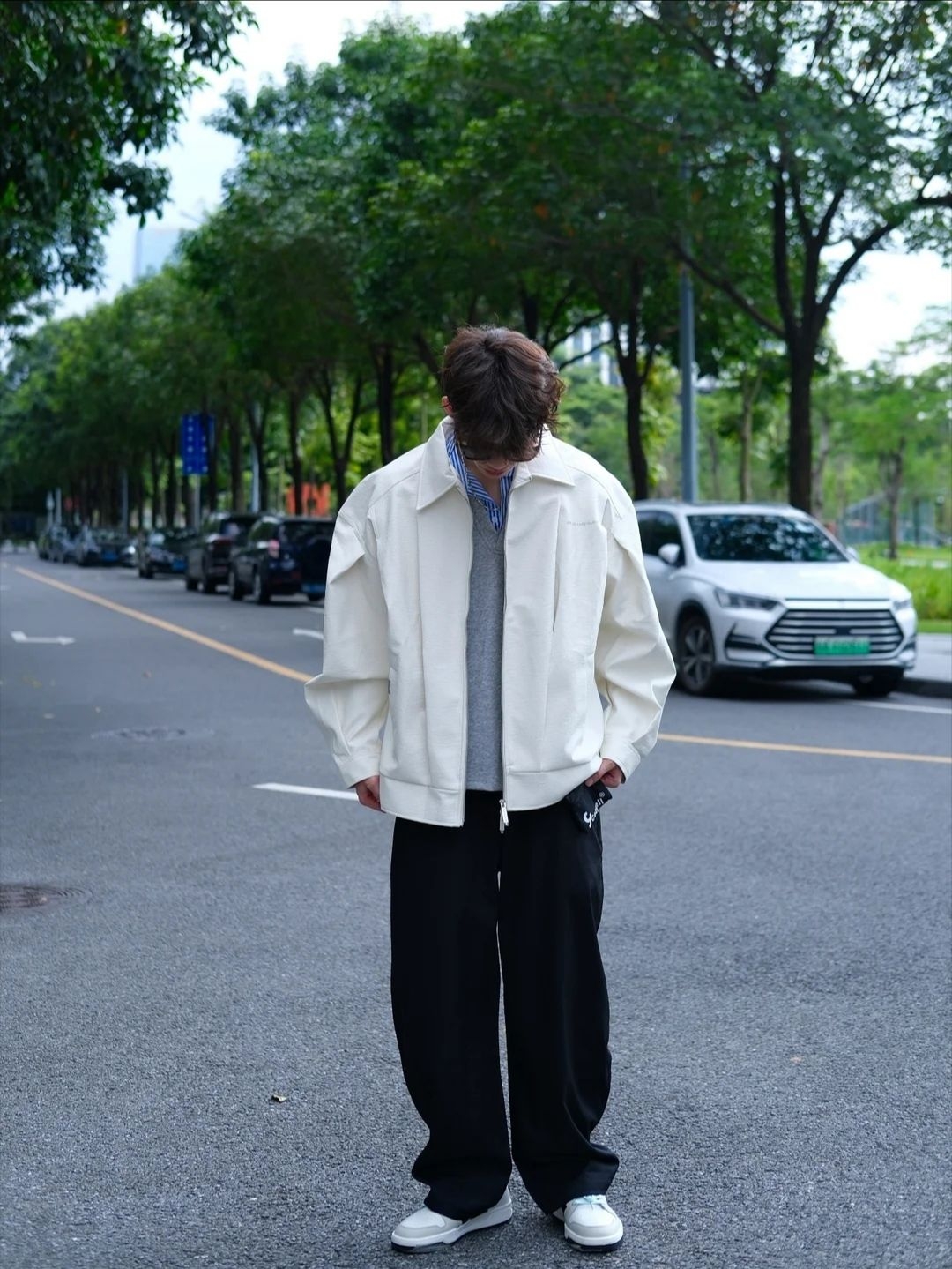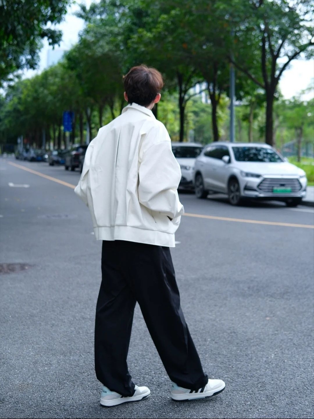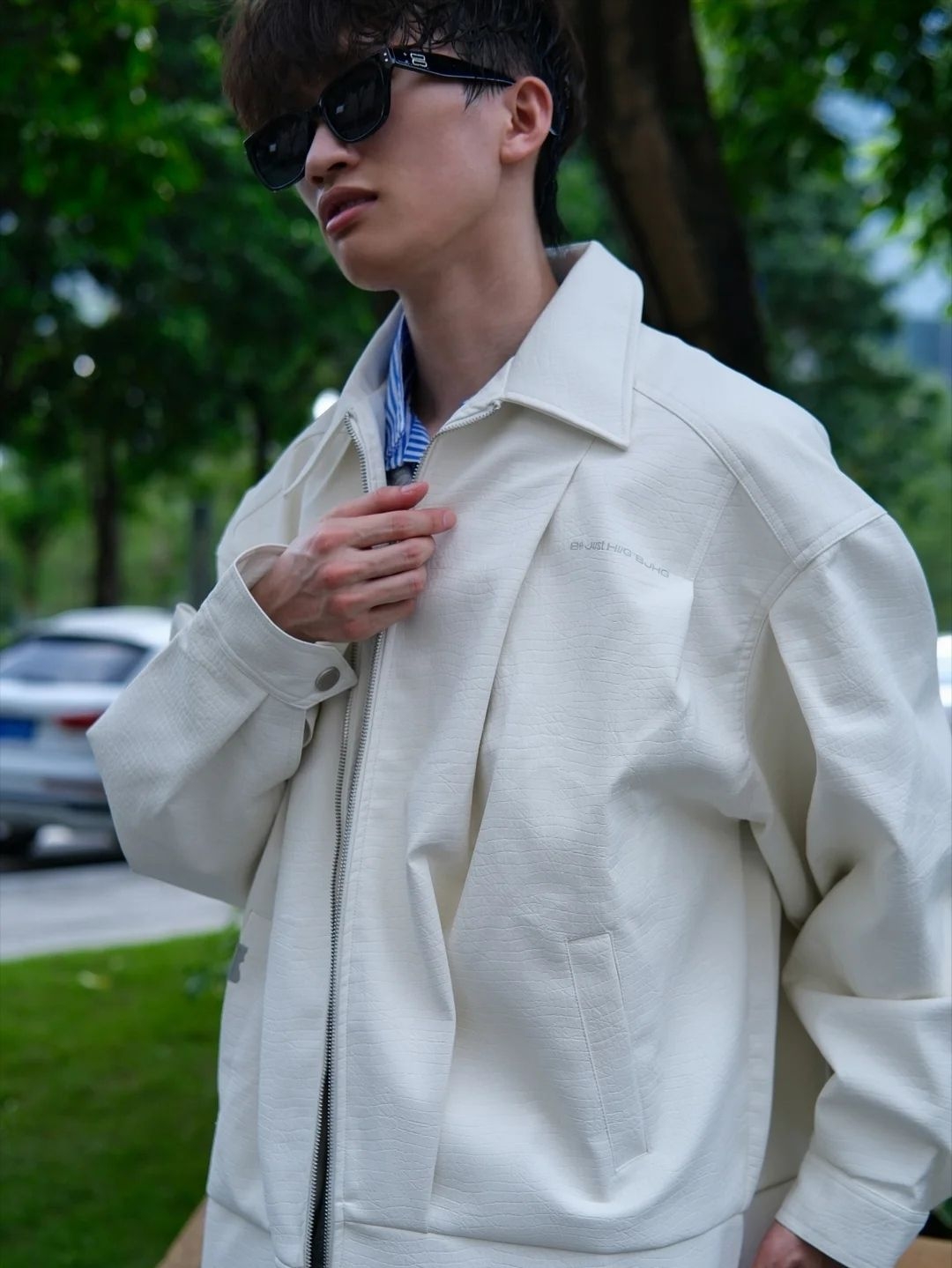 这件BJHG的夹克我真的能穿一整个秋冬! 一眼就被鳄鱼纹PU皮戳中🛵 哑光质感的纹路 摸起来敲有质感🛴 美式复古那味儿一下就出来了 它的版型 宽松但不垮塌🚡 显身材 双头拉链设计我很喜欢 有种随性的松弛感🚲 配牛仔裤、工装裤,休闲裤都可以 我183穿XL码🚟