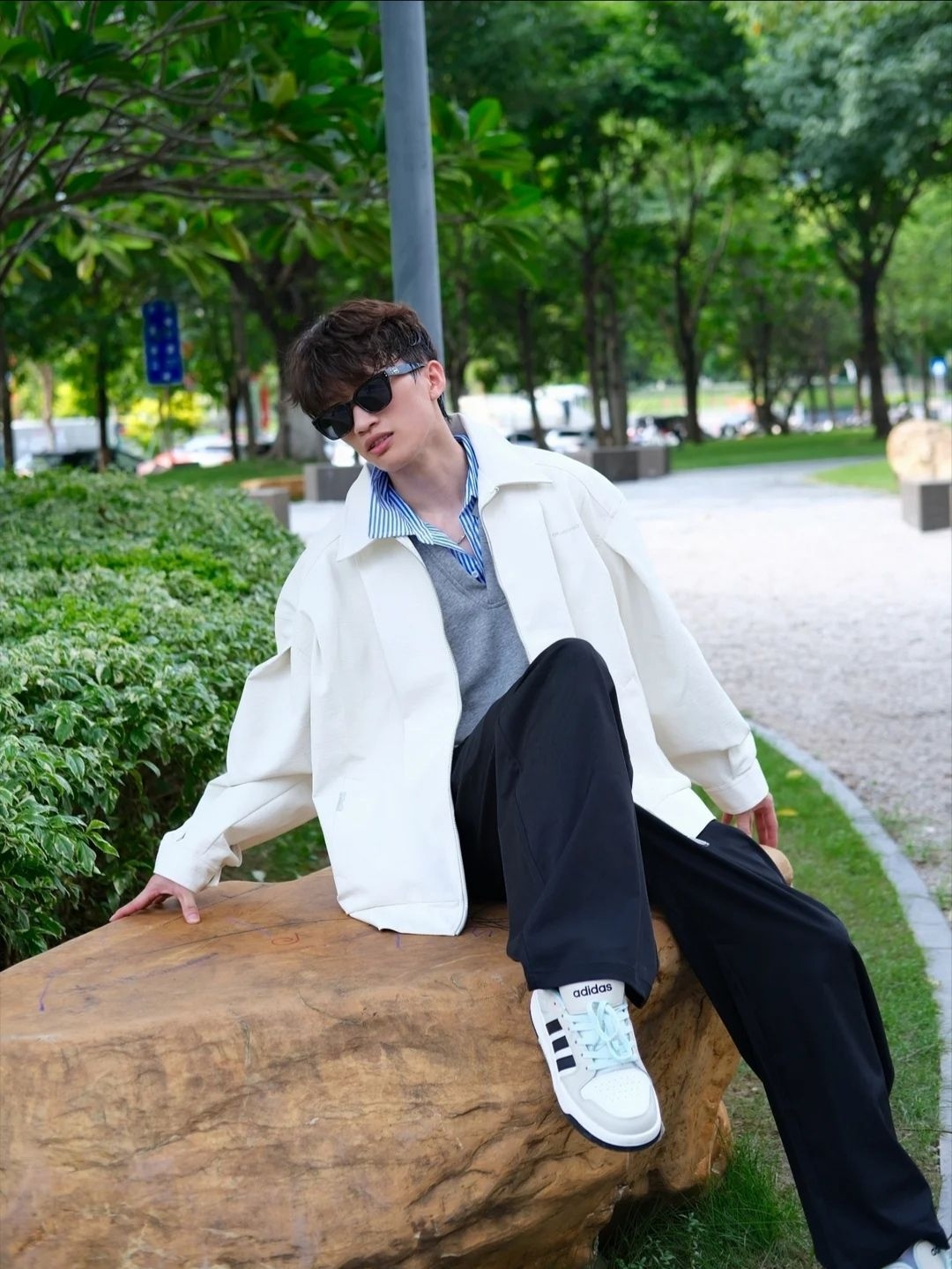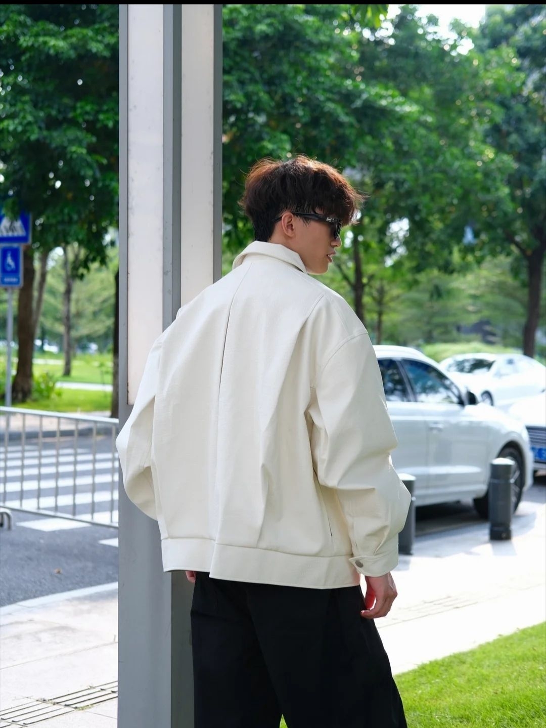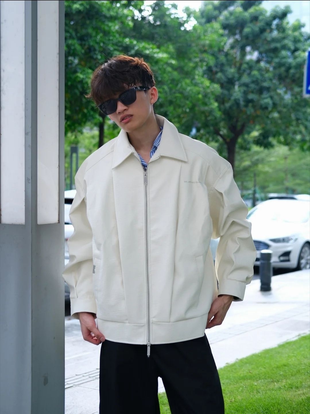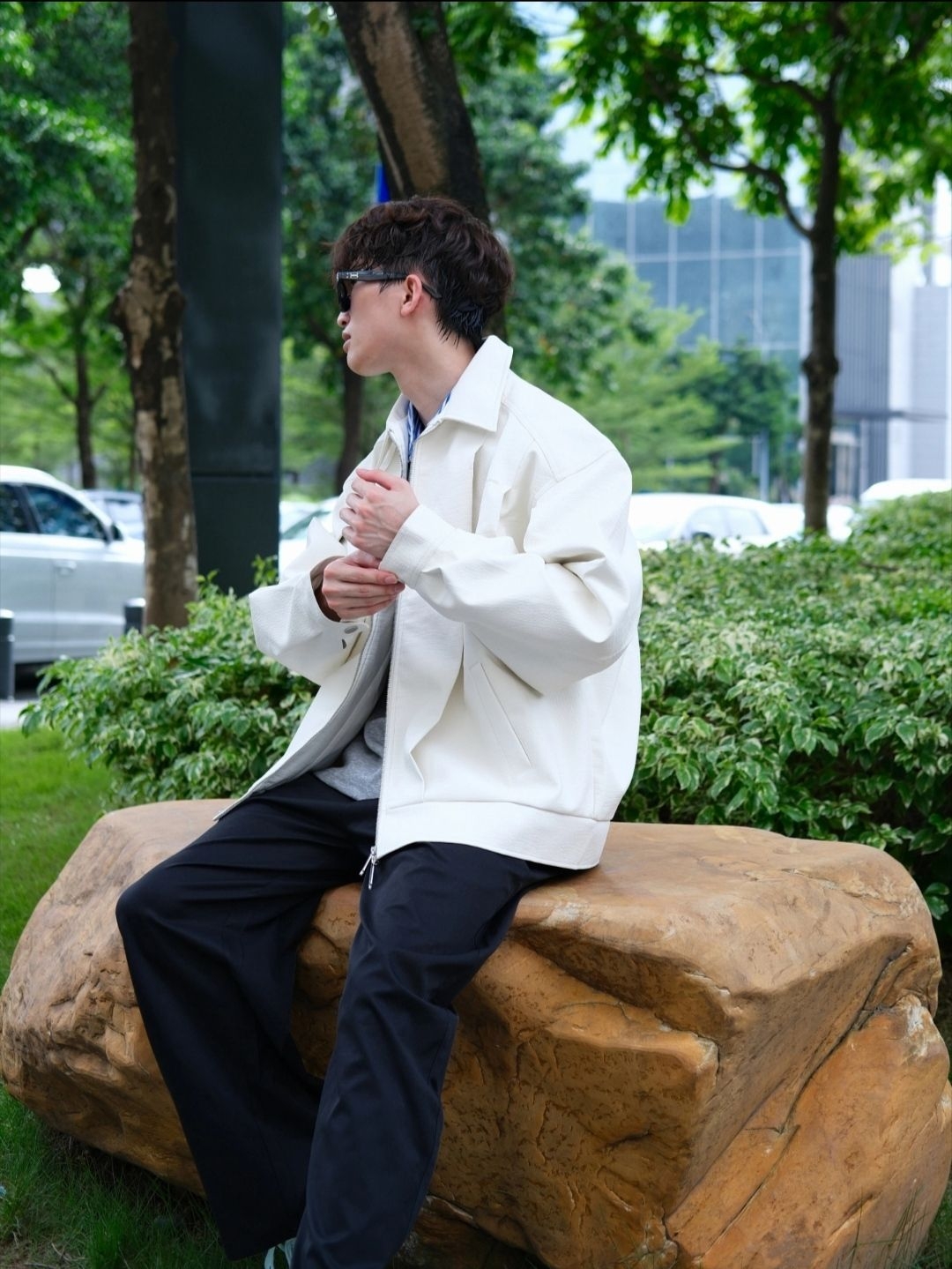 这件BJHG的夹克我真的能穿一整个秋冬! 一眼就被鳄鱼纹PU皮戳中🛵 哑光质感的纹路 摸起来敲有质感🛴 美式复古那味儿一下就出来了 它的版型 宽松但不垮塌🚡 显身材 双头拉链设计我很喜欢 有种随性的松弛感🚲 配牛仔裤、工装裤,休闲裤都可以 我183穿XL码🚟