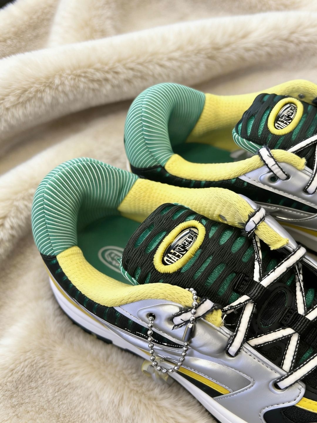 这双绿银配色的鞋子真的很有感觉!哑光银线条搭配墨绿网面,低调中带着细闪,复古感满满,基本不会撞款。鞋子拿在手里轻飘飘的,网眼鞋面的透气孔设计得很明显,夏天穿应该不会闷脚。橡胶鞋底摸起来软乎乎的,还有防滑效果,逛街一天应该不会累脚。尺码方面偏正,脚宽的朋友建议大半码。网面材质需要用软毛刷蘸中性洗液轻轻刷洗,阴干就好不要暴晒。搭配白袜加运动裤或者牛仔裤都挺合适,黄皮穿了也挺显白。
