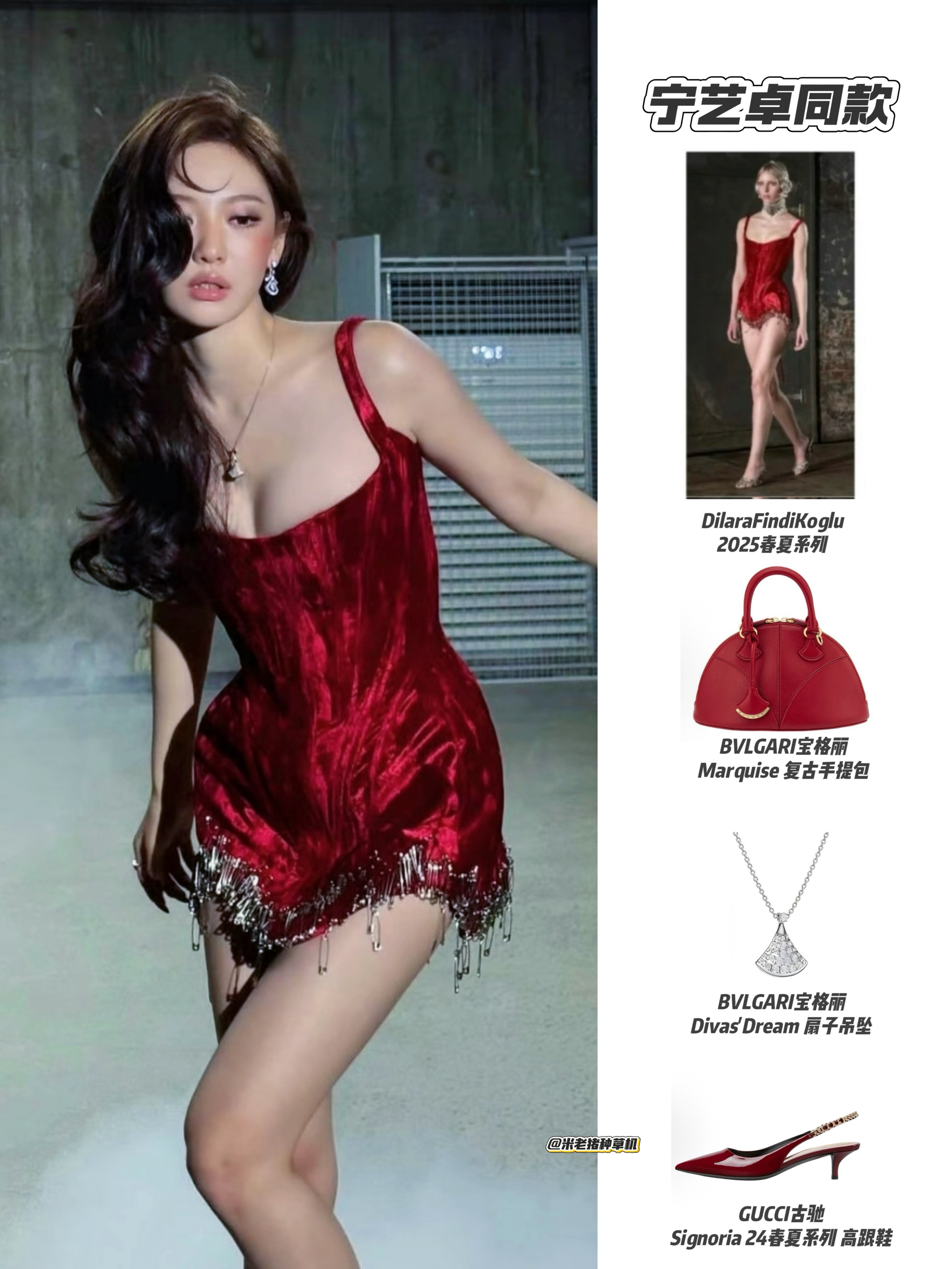 宁艺卓这套红装太亮眼了,一袭DilaraFindikoglu酒红丝绒吊带裙,流苏裙摆添灵动,明艳红调衬得肤白胜雪😻 搭配宝格丽红金手提包与扇子吊坠,贵气拉满,古驰红黑高跟鞋更让气场飙升。整套造型以红为主脉,既显东方韵致又具摩登锋芒,红运氛围感直接拉满,美成行走的“开门红”符号。
