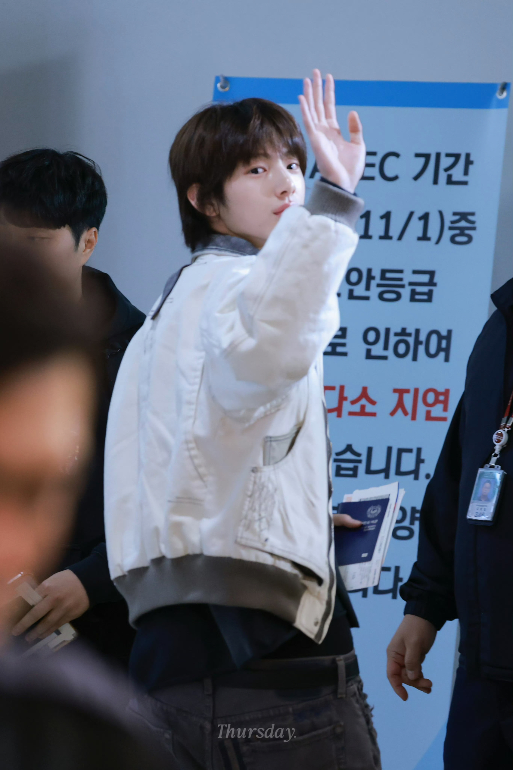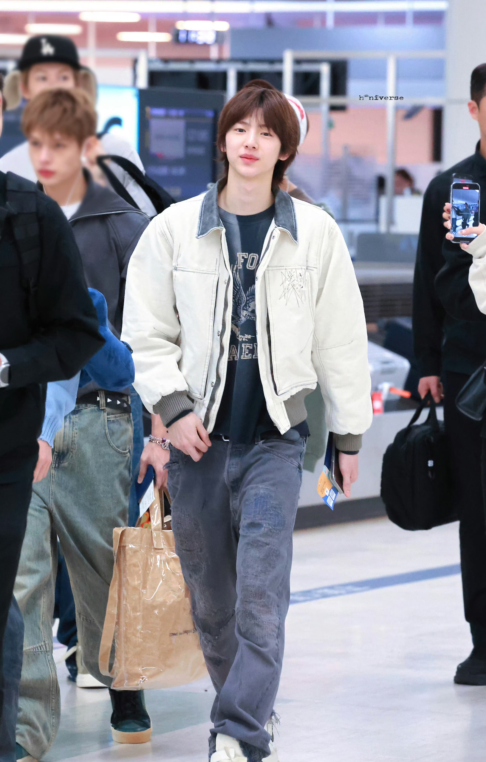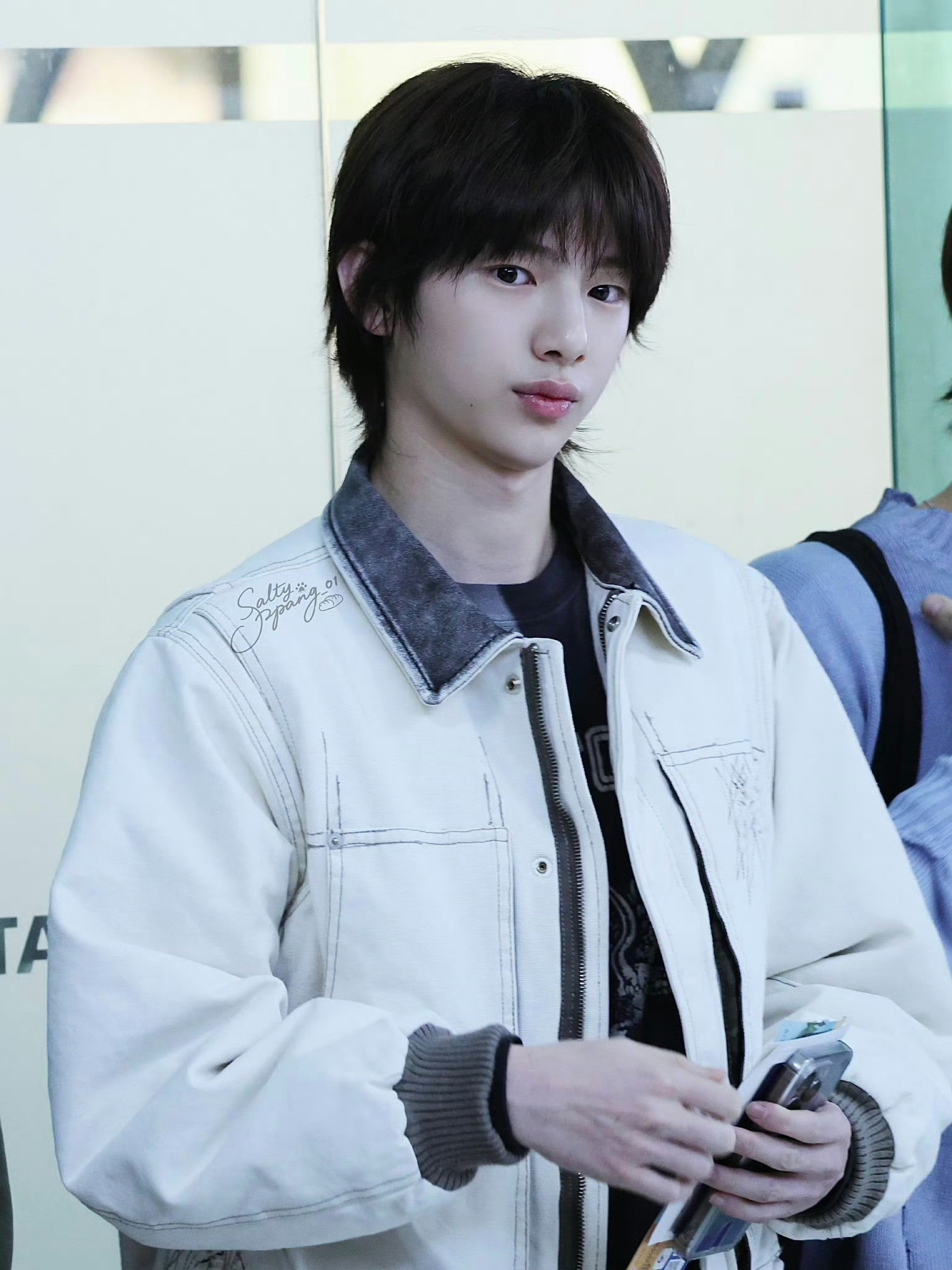 猪猪的穿搭简单却不随意,非常有自己的风格 XLIM做旧白夹克带着复古的磨边质感,撞色翻领是千禧年街头的经典设计,内搭bowwow字母印花T恤,做旧水洗的复古感和夹克呼应,再配灰调牛仔裤,整体像翻出00年代的街头穿搭范本,古早味浓郁又不显得刻意。