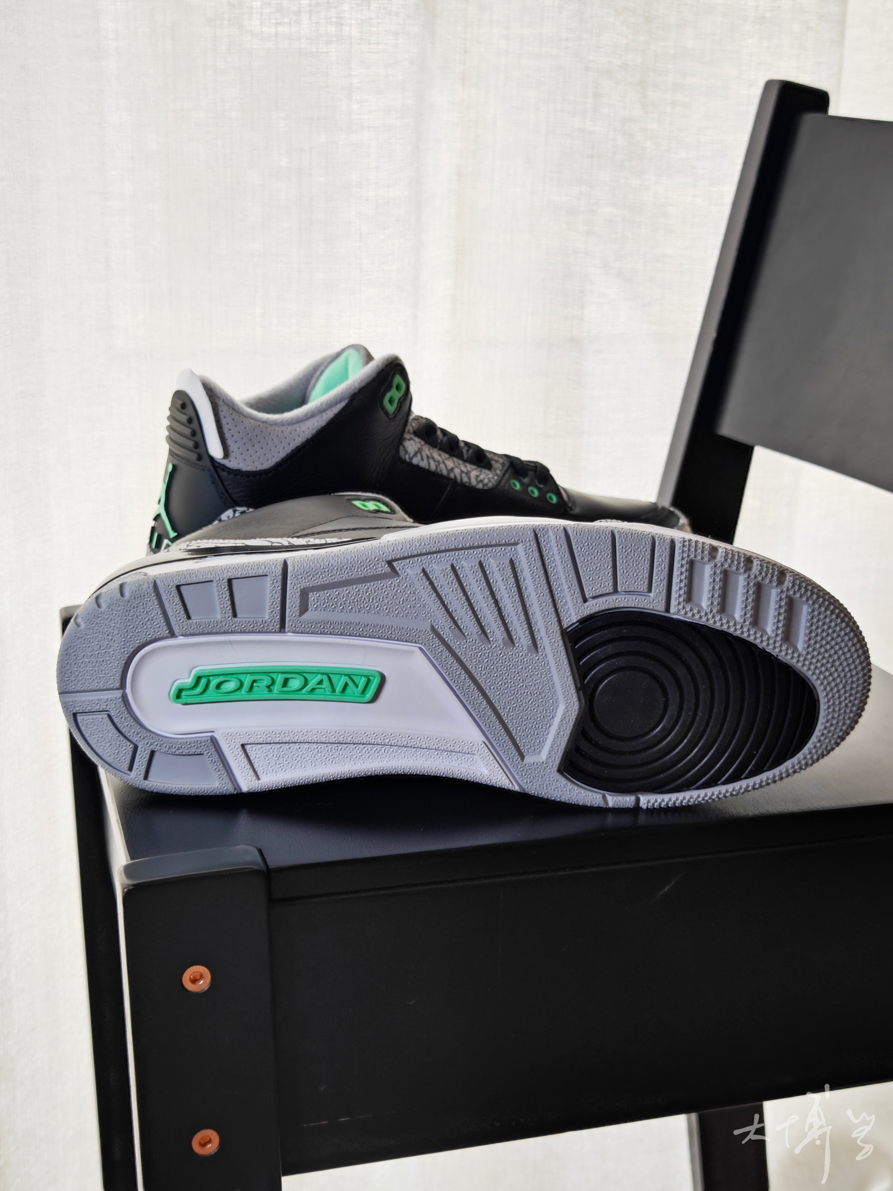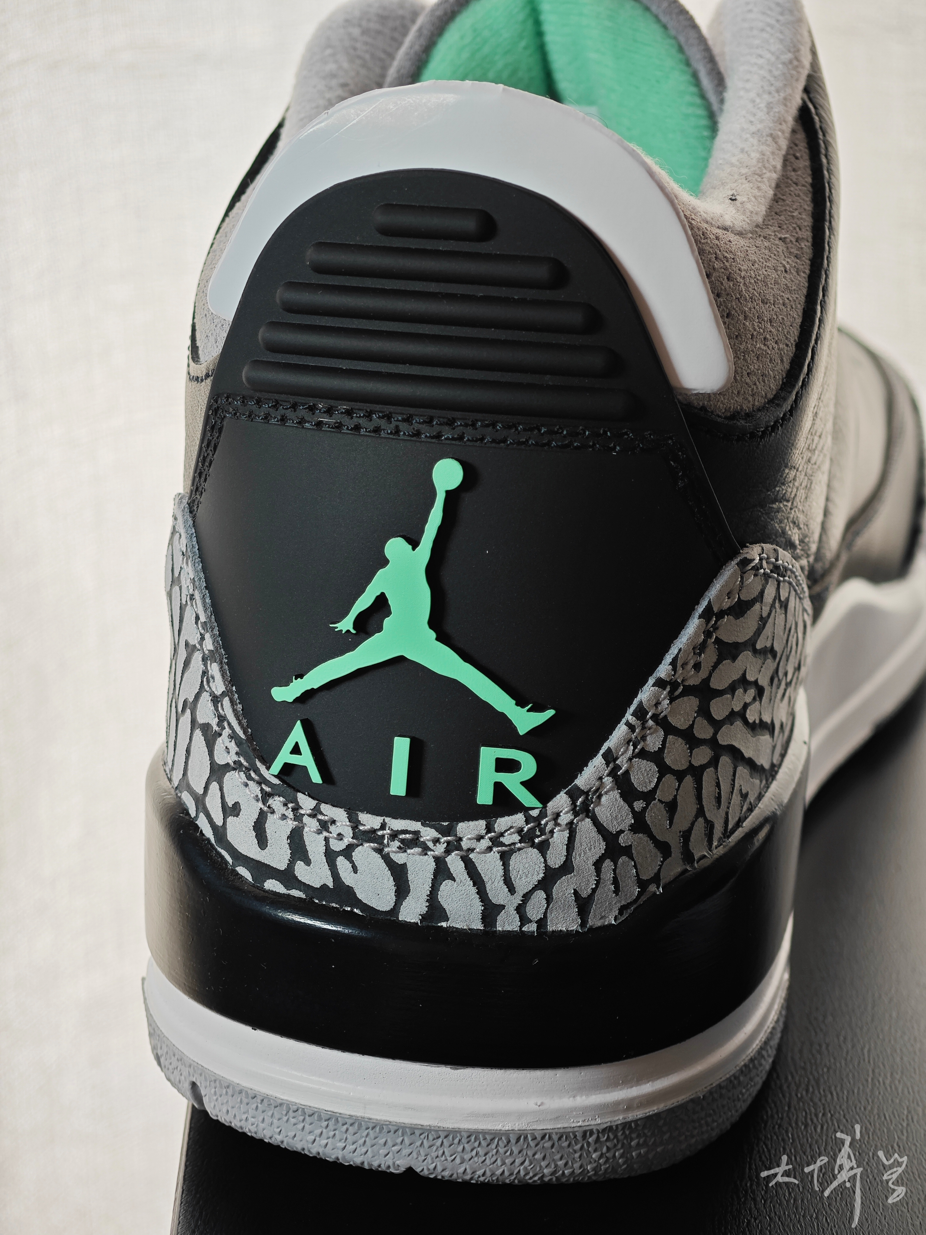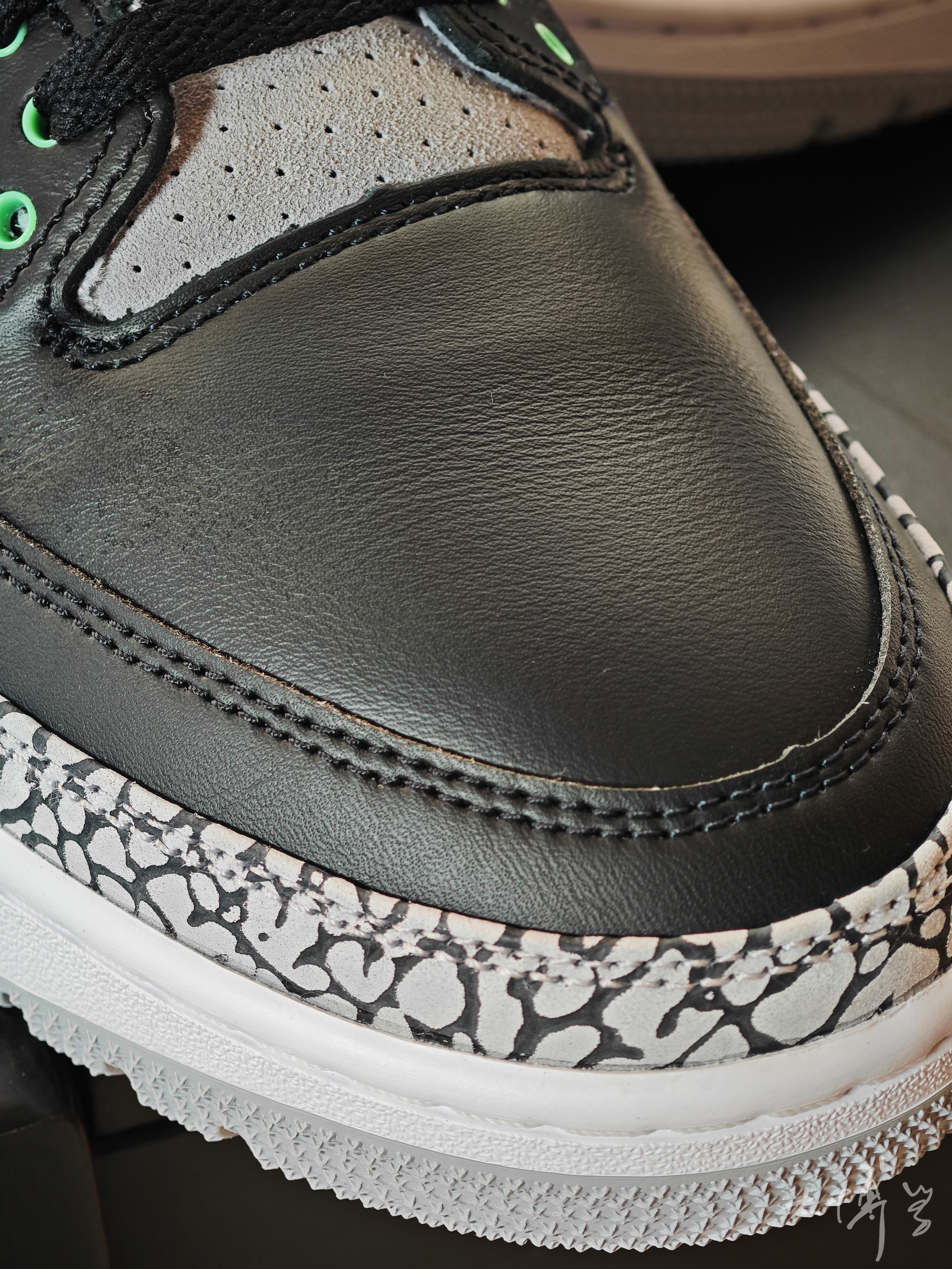 一双配色比较低调的AJ3 黑色皮革鞋面,灰色大象皮脚趾 只有一点点薄荷绿点缀 配色看起来确实不运动 其实整体做工还不错 虽然如今AJ3配置并不能满足篮球实战 作为日常通勤,逛街穿搭还是很不错 内衬毛毛糙糙的材料质感是我一直吐槽的 好在价格不贵 对于还没穿过AJ3的朋友来说 这双作为自己第一双AJ3,也很不错