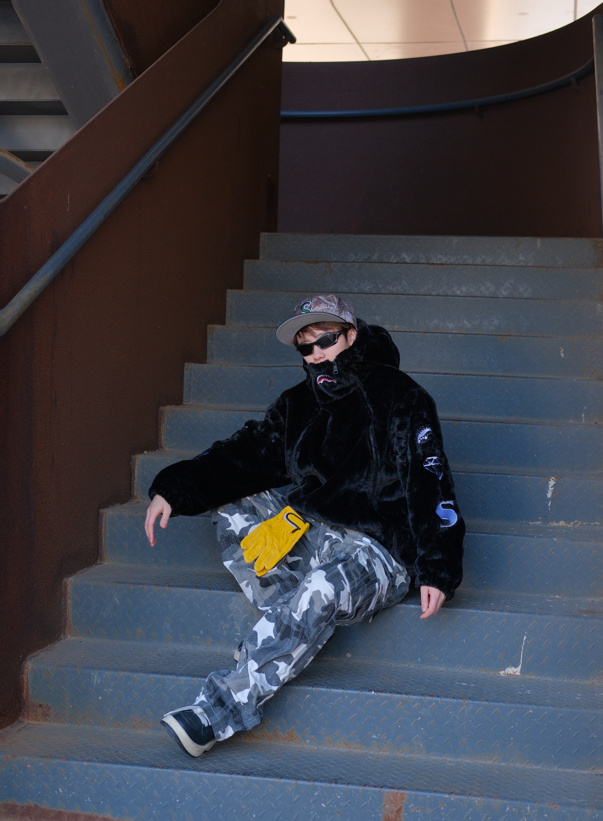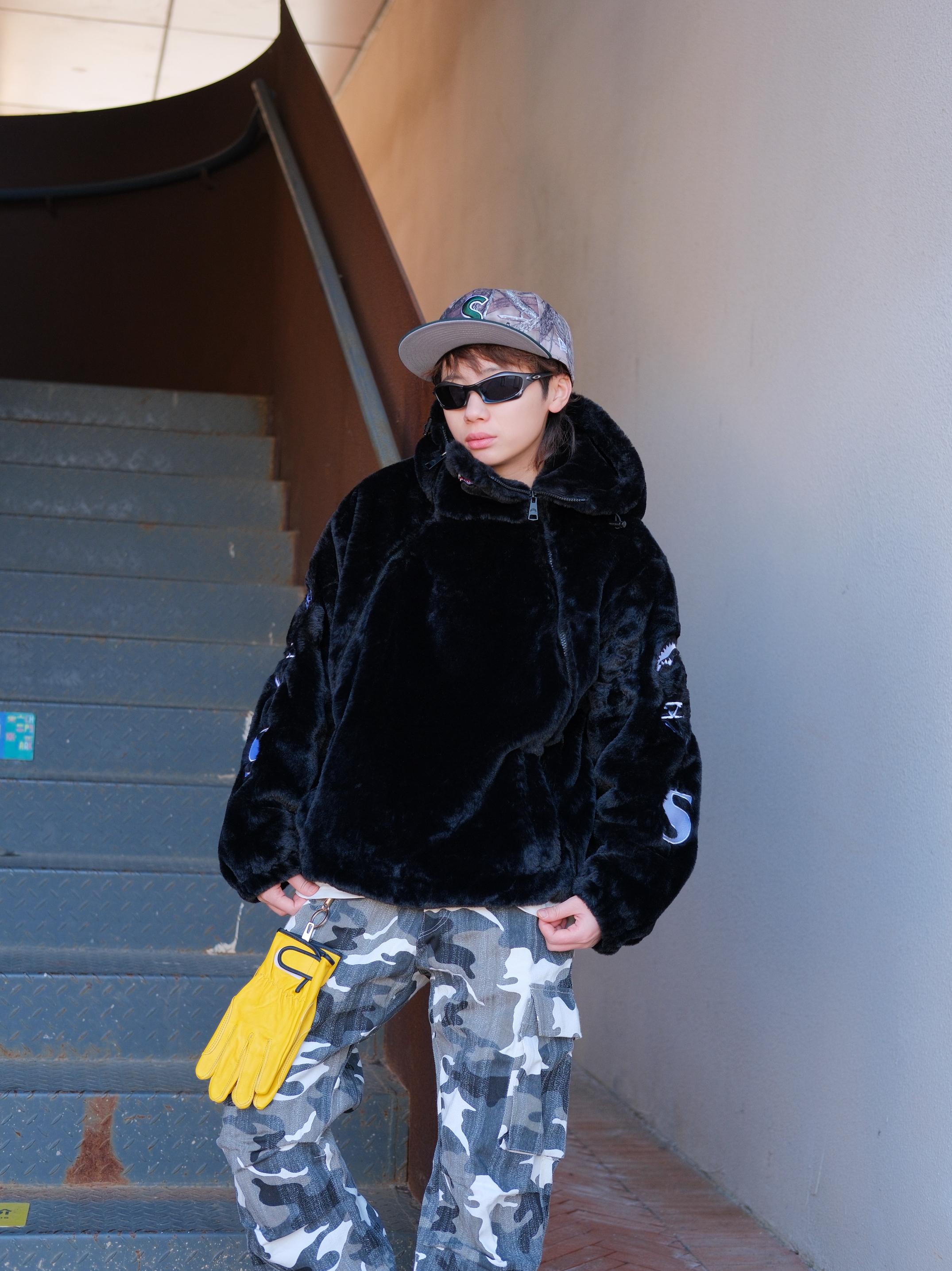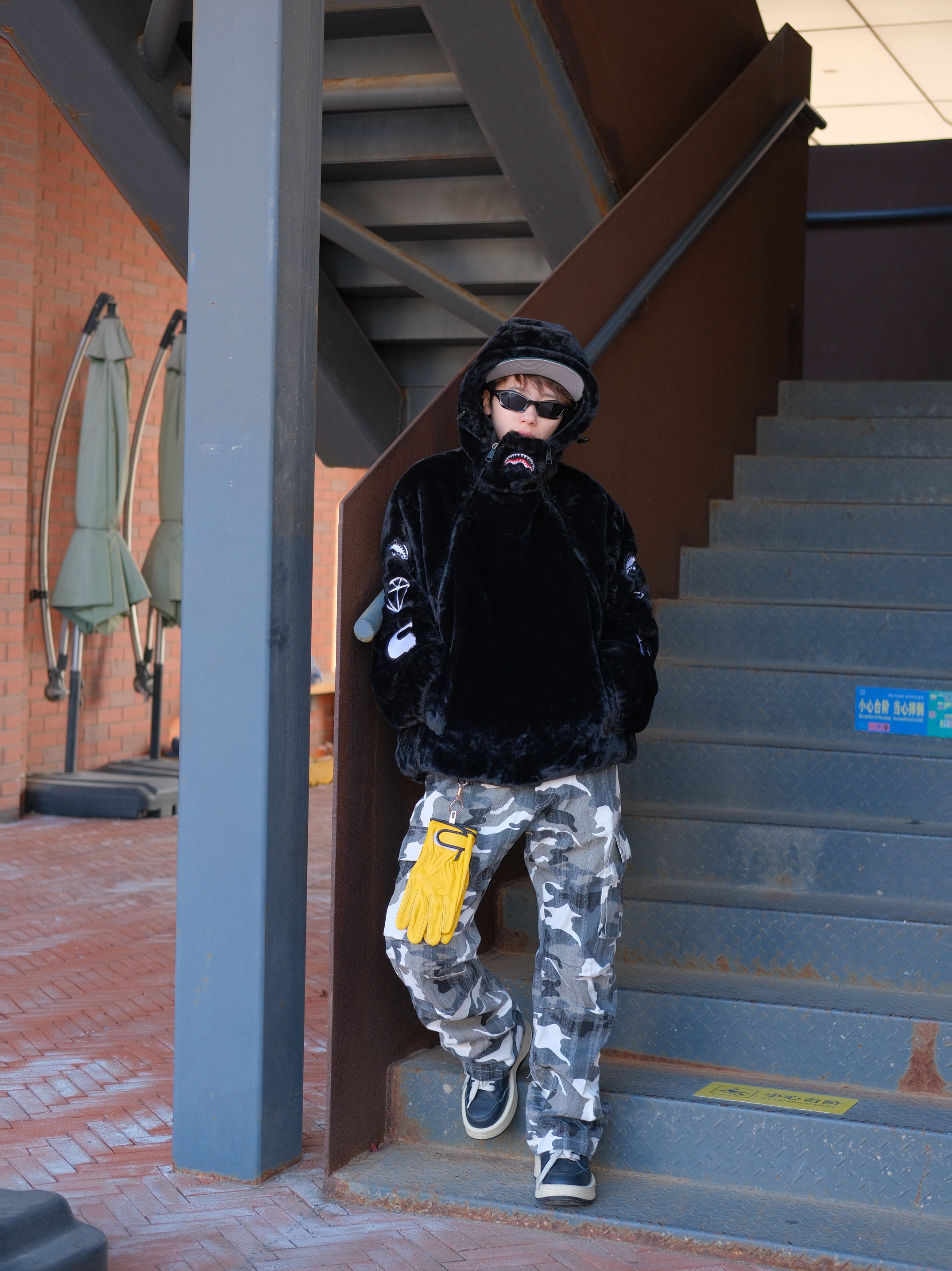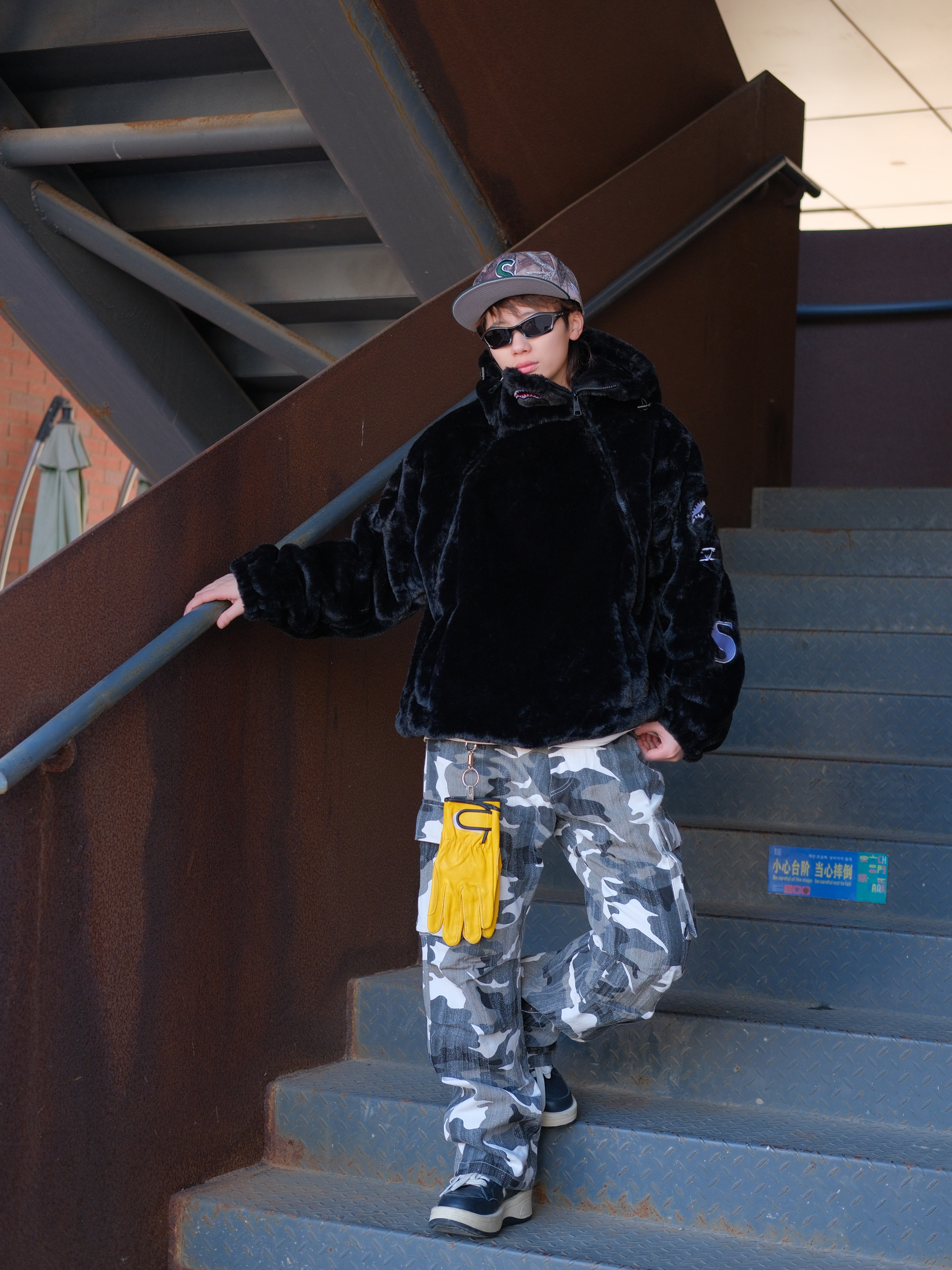 冬天就是要整点毛绒绒的 上身选了件黑色毛绒棉服 毛料质感非常不错,上身亲肤又暖和 除了领口和背面的经典鲨鱼嘴图案 袖口增加的小刺绣,街头感十足 双拉链设计门襟穿脱也比较方便 搭配一条灰色迷彩工装裤 和高帮篮球鞋 暗黑机能风太顶了 尺码参考:163cm/46kg 上身S码
