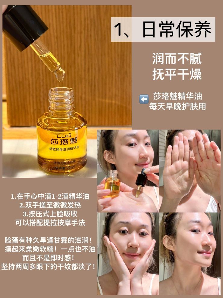 干燥起皮!泛红紧绷!来的比天气预报还准时 外油内干到护肤品全浮在表面,根本不吸收! 上妆更是大型灾难片:底妆大片斑驳粗糙,鼻翼和眼下全是卡粉积线 早就听说“以油养肤”能修护敏皮破损的皮脂膜,养成水光好皮! 但总担心油膜糊在表面!不吸收闷痘! 最近试了莎珞魅这瓶精华油! - 别看它冷门,使用感受一点不输那些当红炸子鸡! 涂上皮肤像在主动大口喝水一样! 还没等我反应过来!精华油就都融进了皮肤里 润而不...
