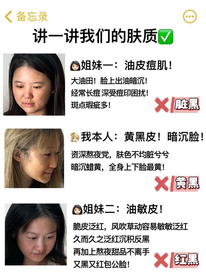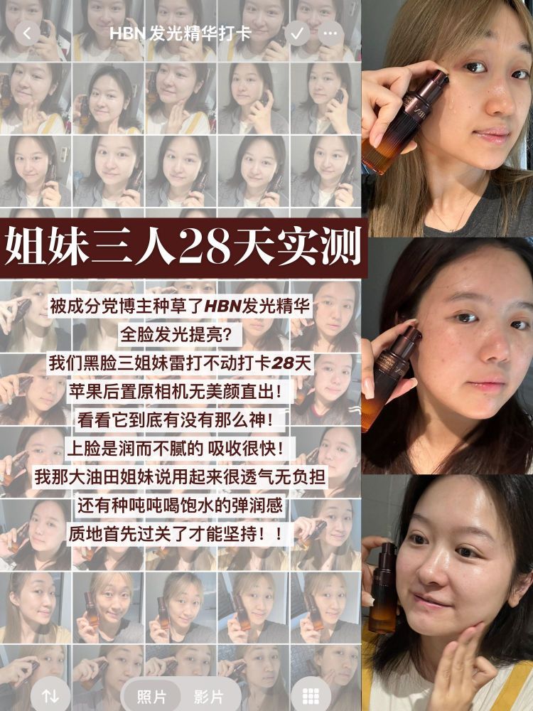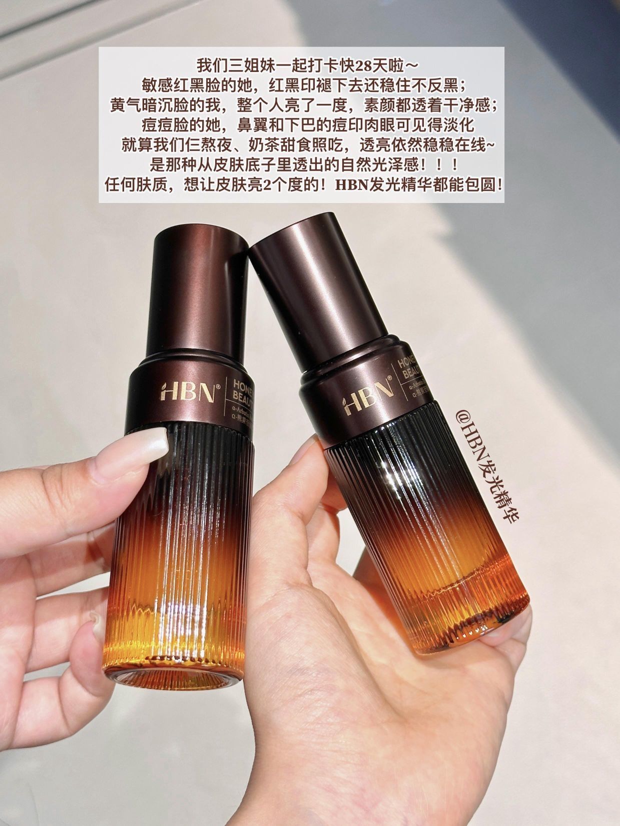 我们仨姐妹就是典型代表:一个油皮满脸痘印、一位黄气脸、还有一个红黑敏皮 素颜合照堪比“黑脸三兄弟” 但我们这些暗沉都挺复合,不是单一原因造成的 市面上大多美白提亮产品只能处理单一的肤色问题,顾了那头,就丢了这头 越选越纠结像掉进盲盒里 到底有没有一劳永逸 一瓶能解决所有暗沉问题的?! 直到被成分党博主种草了【HBN发光精华】 我们仨姐妹打卡后才真心服气: 📍痘印色沉 / 黄气暗沉 / 红敏反黑...