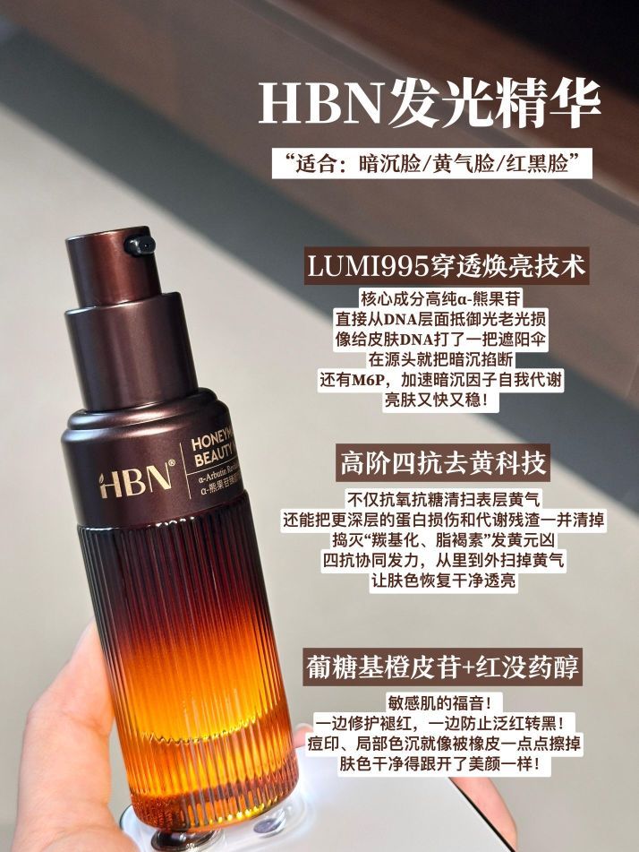 本篇笔记关联了HBN 发光α-熊果苷液态精华液 去黄提亮肤色抗氧糖 焕亮匀净等商品,为用户提供真实的使用体验和购买参考。