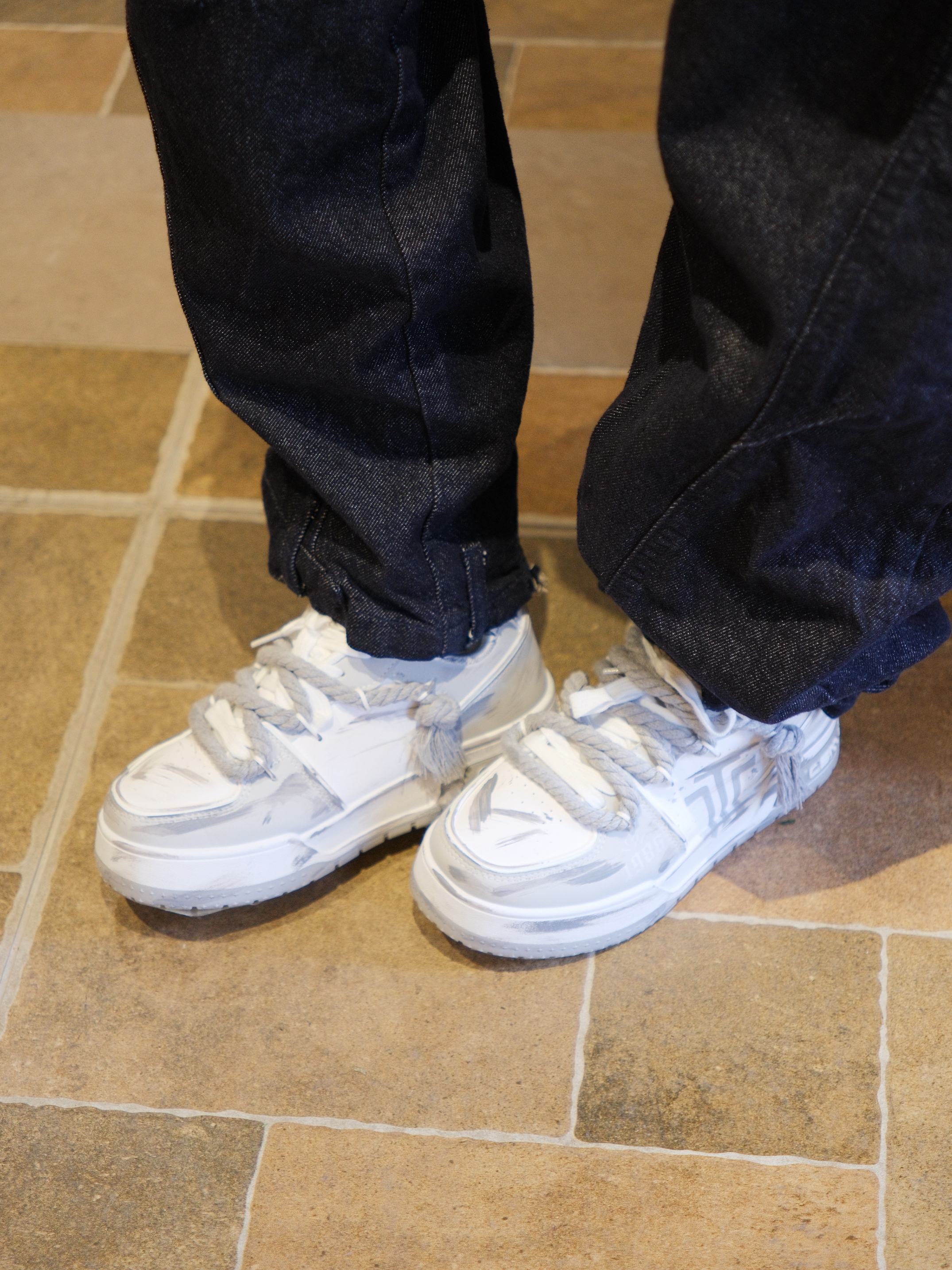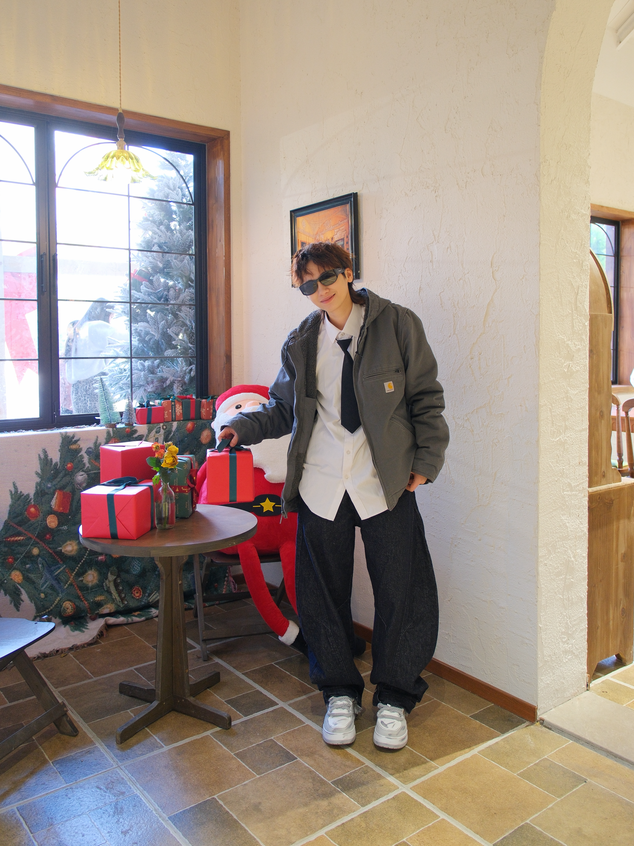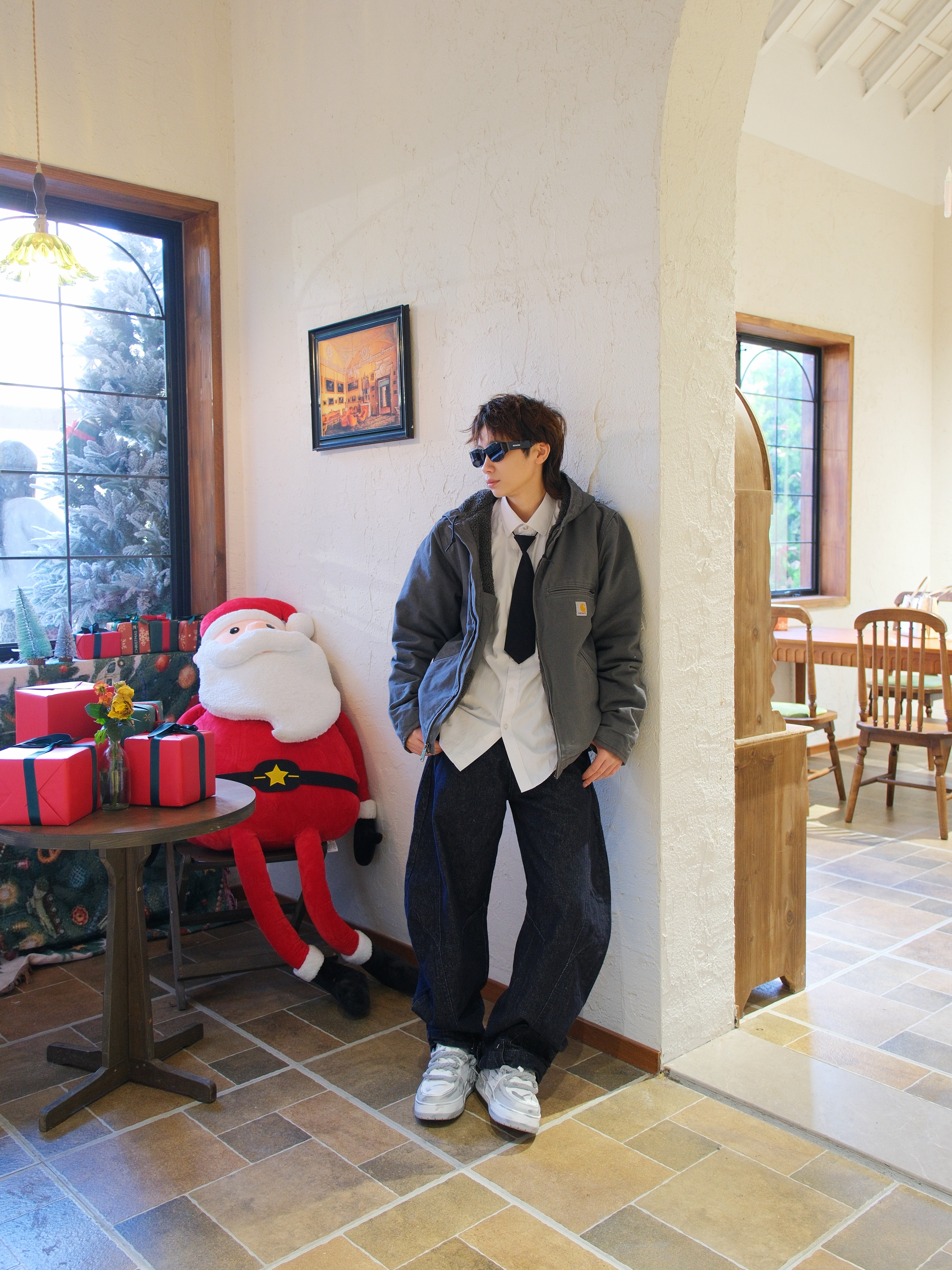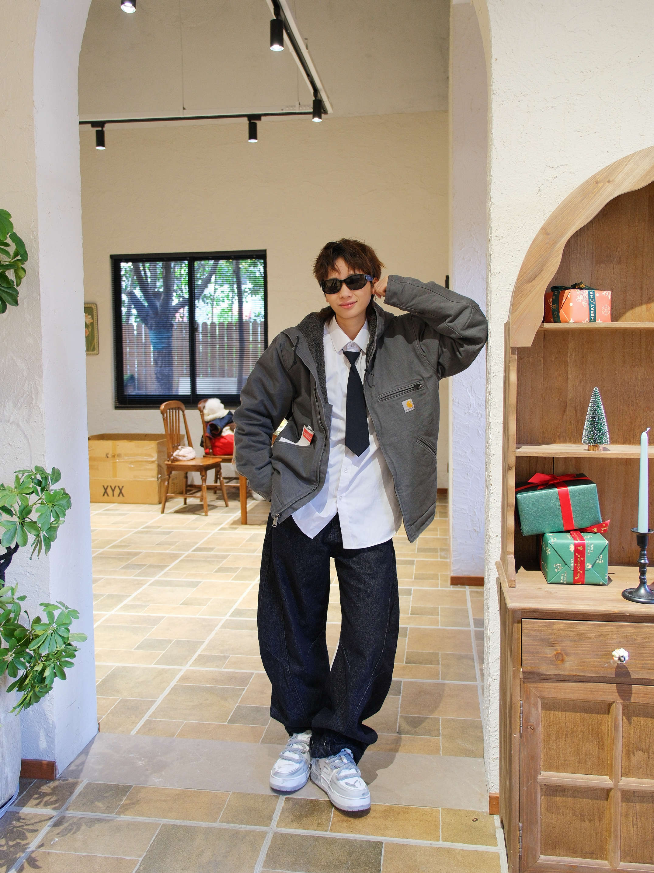 心心念念的卡哈特外套也是穿上了 选了灰色的连帽款式,里面是羊羔毛内胆 上身既抗风又保暖 搭配白衬衫黑领带,有点日系街头感 下装选择弯刀阔腿裤 再踩一双白灰拼色的板鞋 做旧涂鸦设计很百搭 还带差不多3cm左右的增高效果 随便搭配都起范
