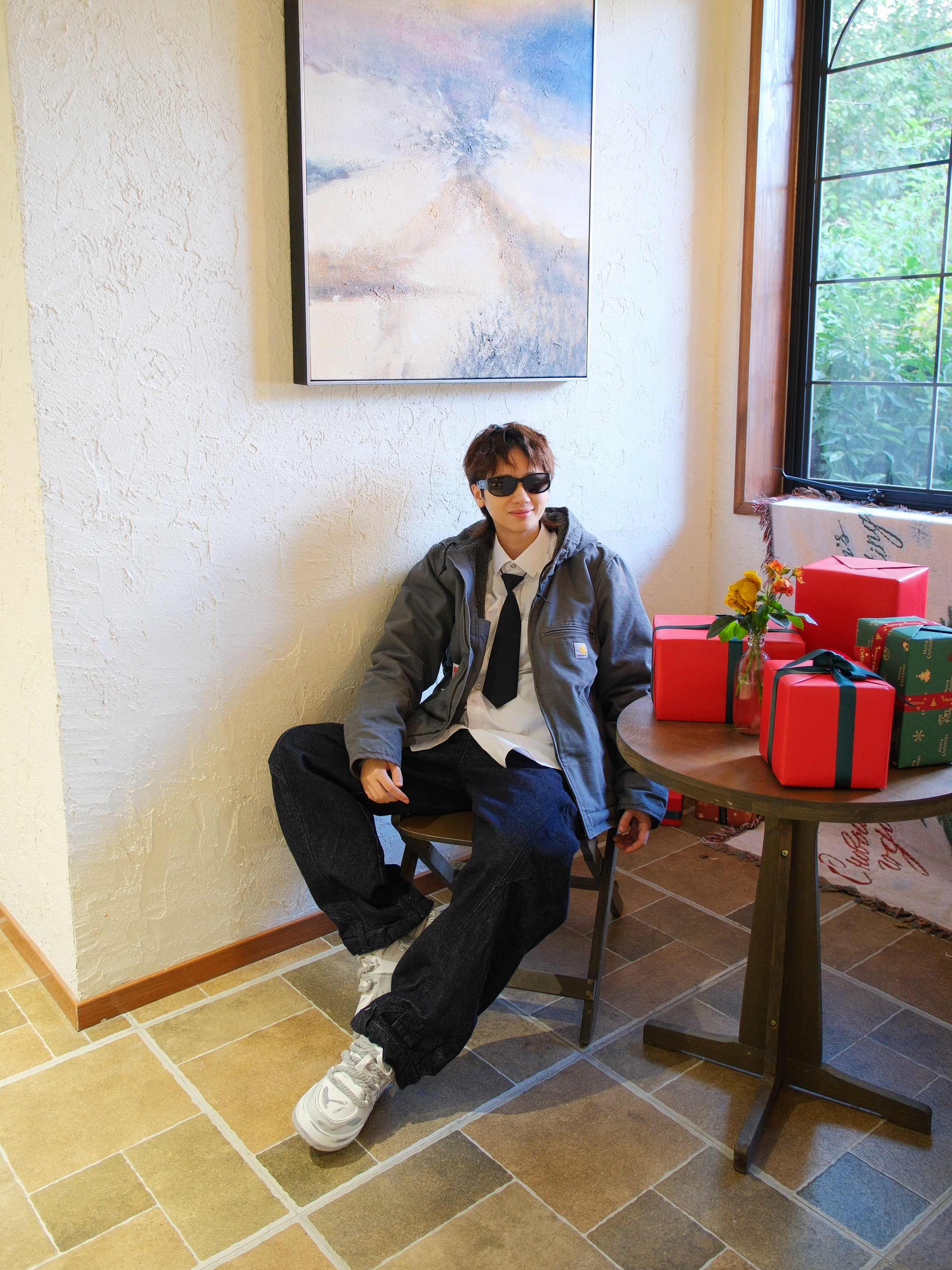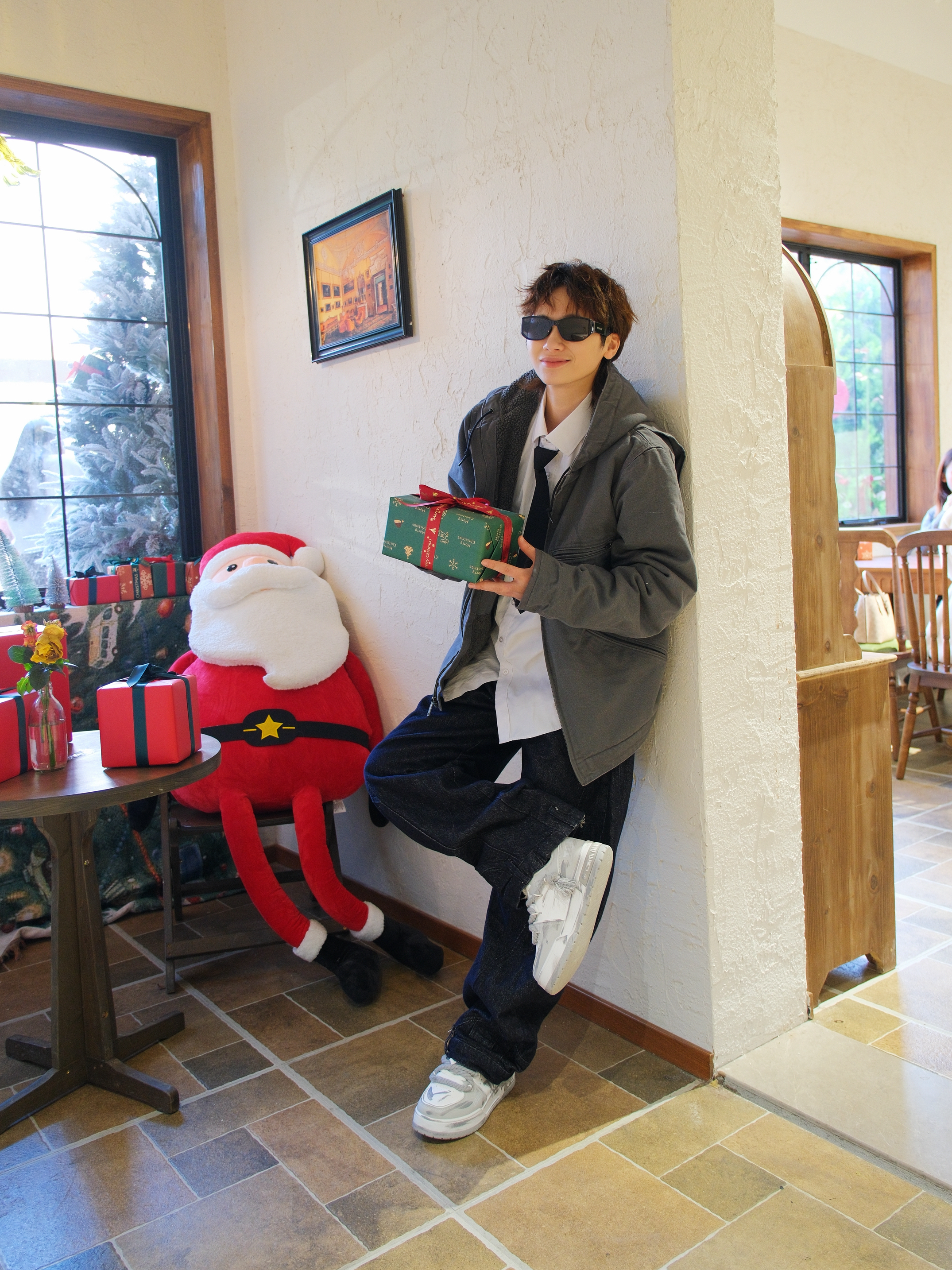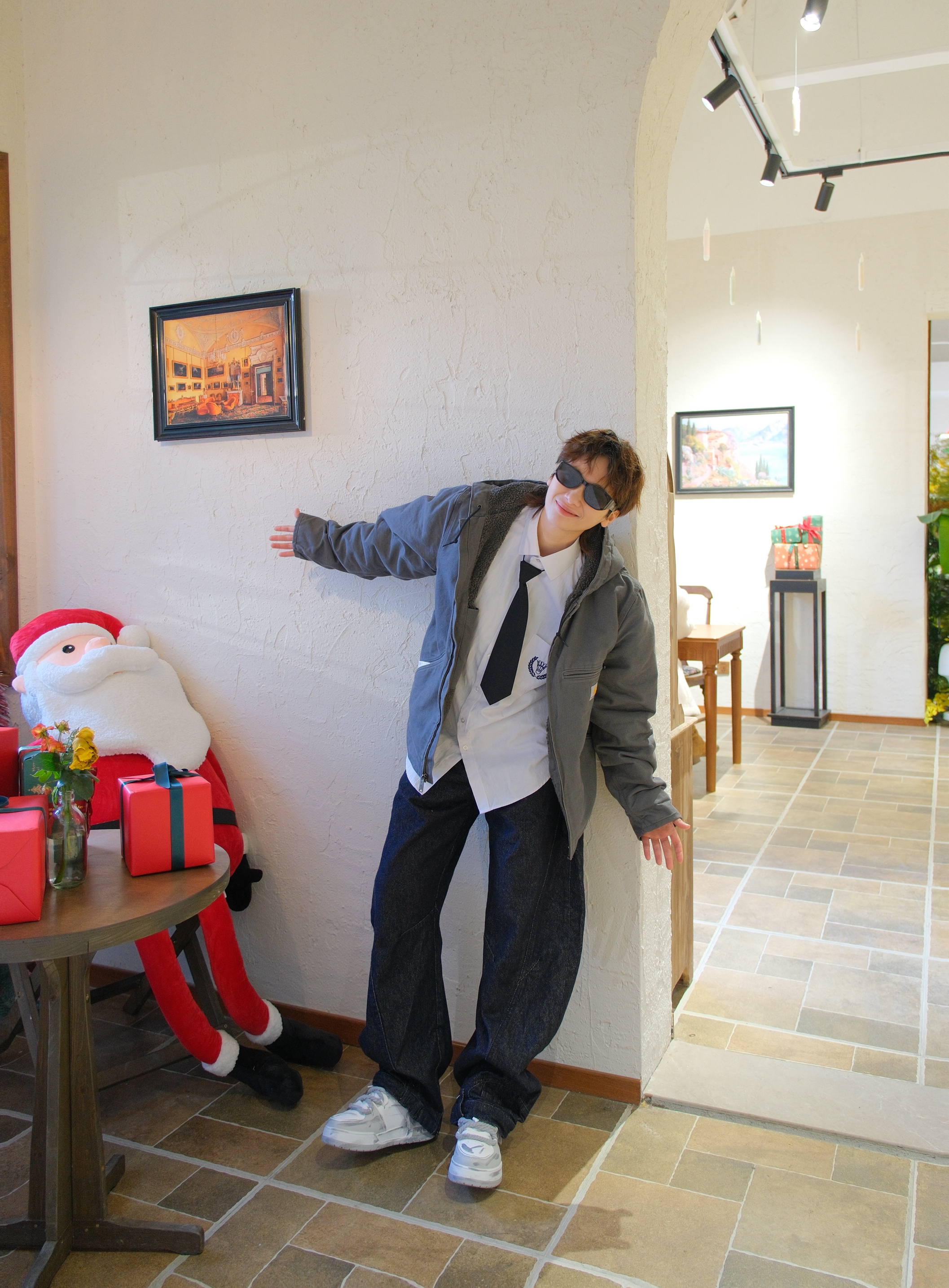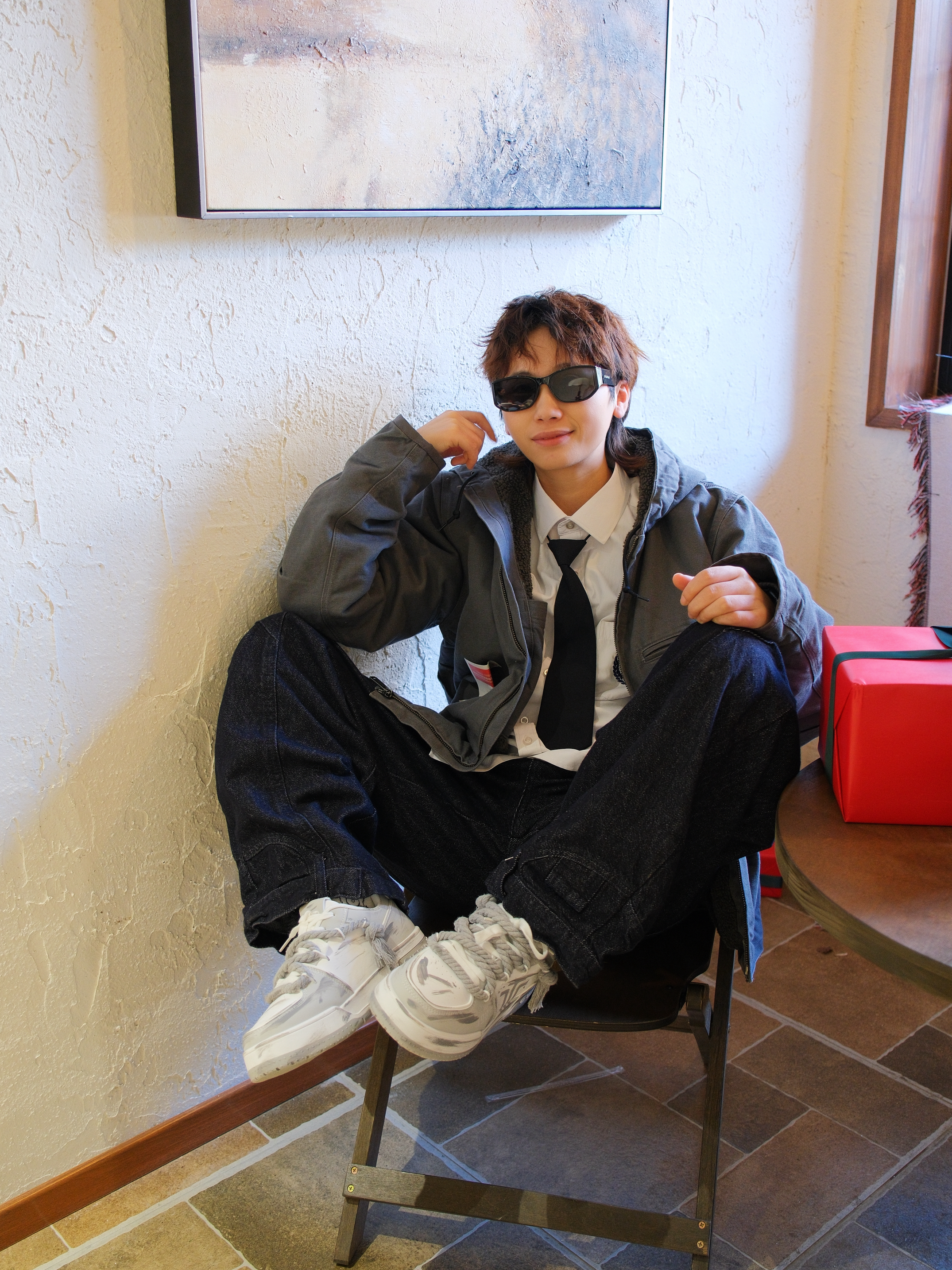 心心念念的卡哈特外套也是穿上了 选了灰色的连帽款式,里面是羊羔毛内胆 上身既抗风又保暖 搭配白衬衫黑领带,有点日系街头感 下装选择弯刀阔腿裤 再踩一双白灰拼色的板鞋 做旧涂鸦设计很百搭 还带差不多3cm左右的增高效果 随便搭配都起范