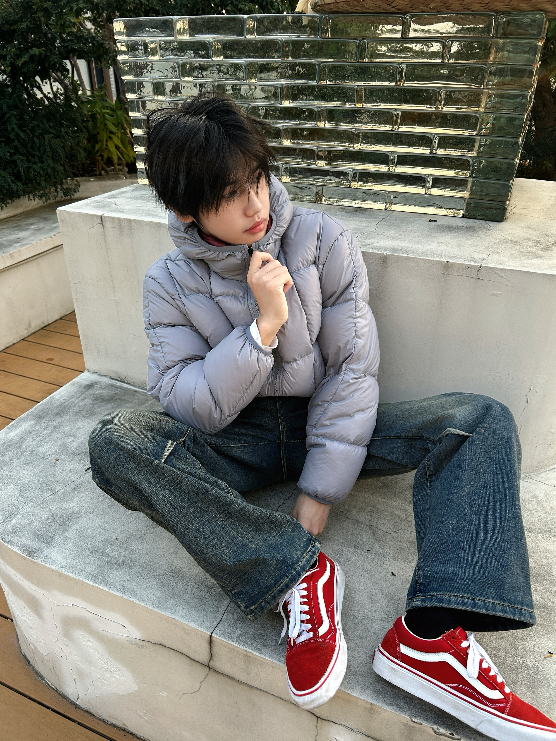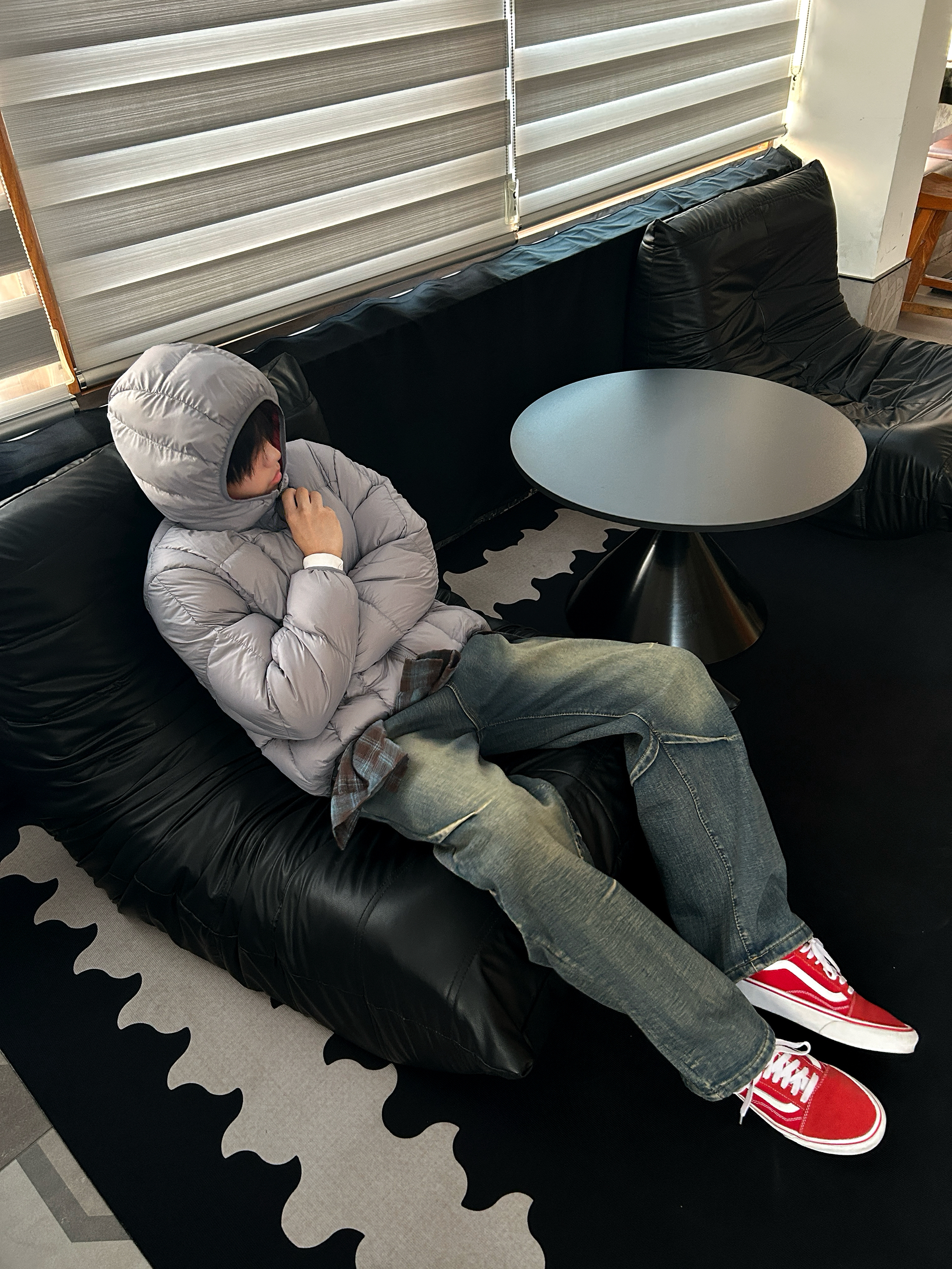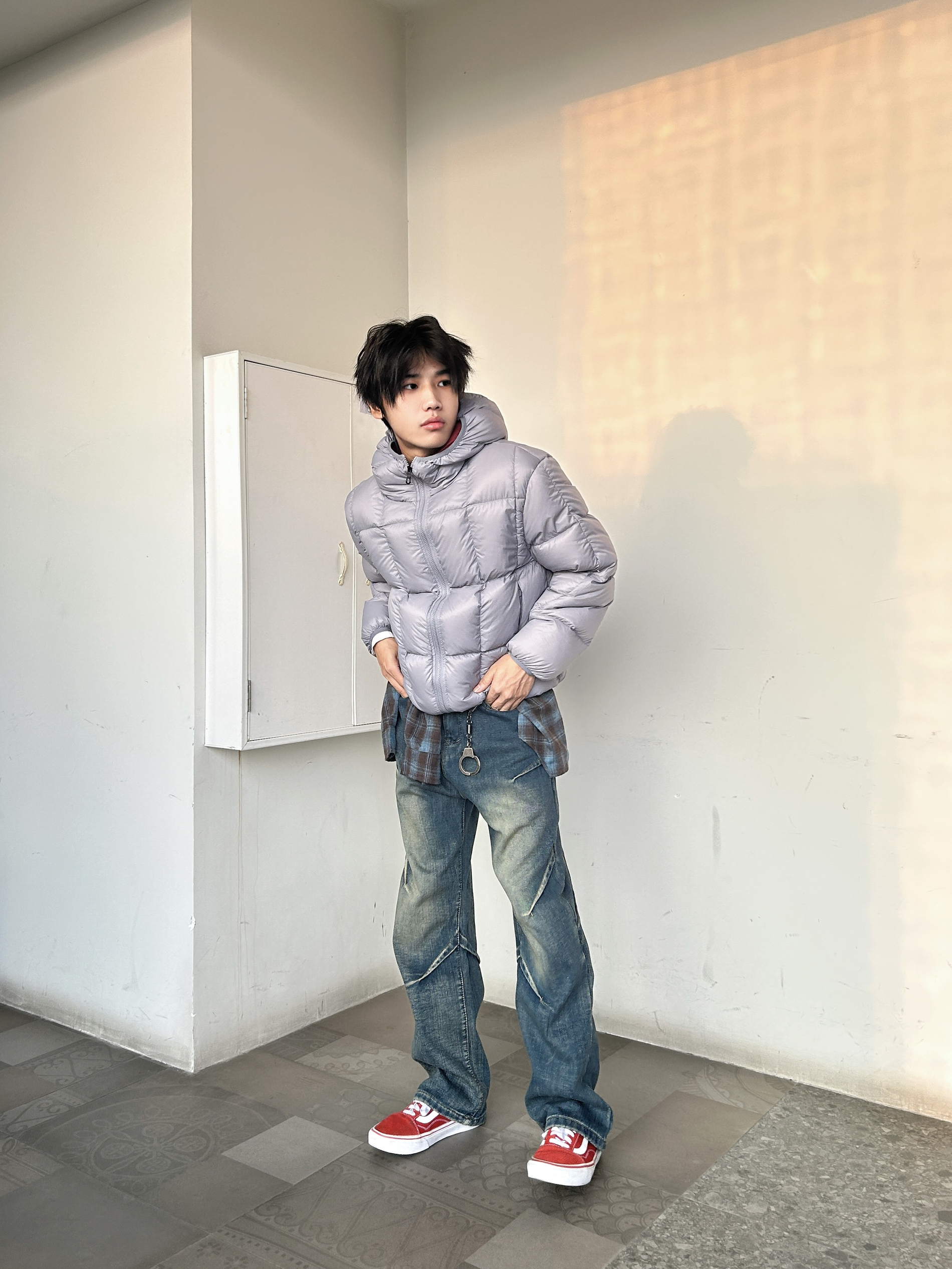 暖光裹着灰调蓬松感 浅灰面包羽绒叠格纹衬里 宽腿牛子裤坠着松弛感 红鞋一踩直接把秋冬潮度拉满 这波暖得够有型 谁见了不说句“哥会穿”