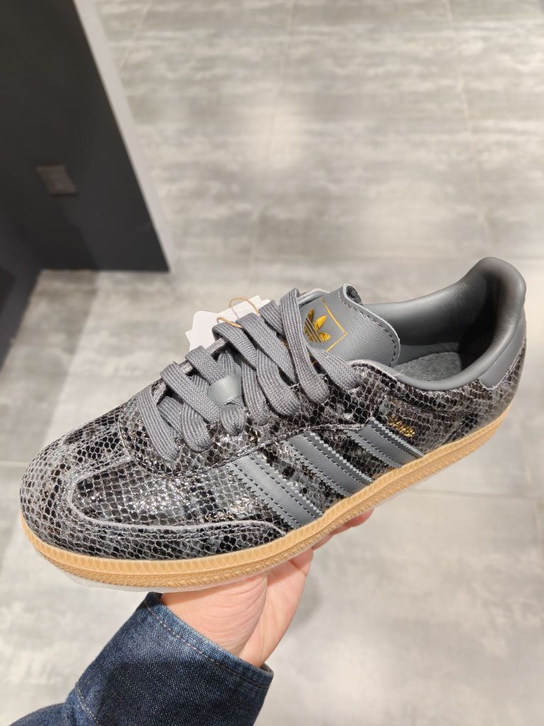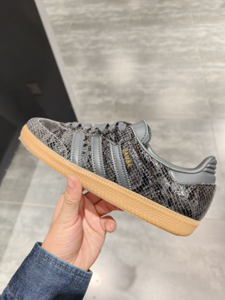 🐍鞋面设计 - 蛇纹合成革材质太绝了!灯光下鳞片感超立体,比普通款多了点小野猫气质😼 - 经典三道杠用灰黑渐变处理,和蛇纹纹路完美融合,高级感拉满✨ - T头鞋型超显脚瘦!圆头设计不挤脚趾,暴走两万步都不磨脚👣 👟鞋底细节 - 生胶底软糯有弹性,走路像踩棉花~抓地力也超棒,雨天走路不打滑 - 薄底设计超显腿长!搭配鲨鱼裤直接穿出1米8气场🦵 - 黑色主调+米黄鞋底,复古又百搭,随便穿都不会出错 📸...