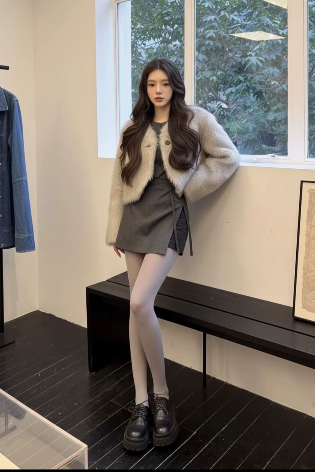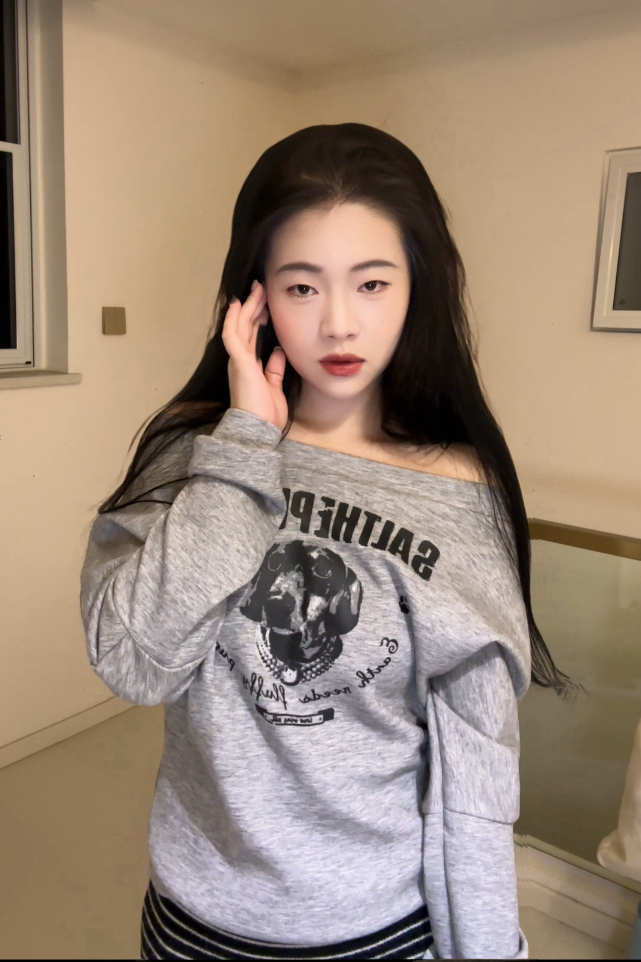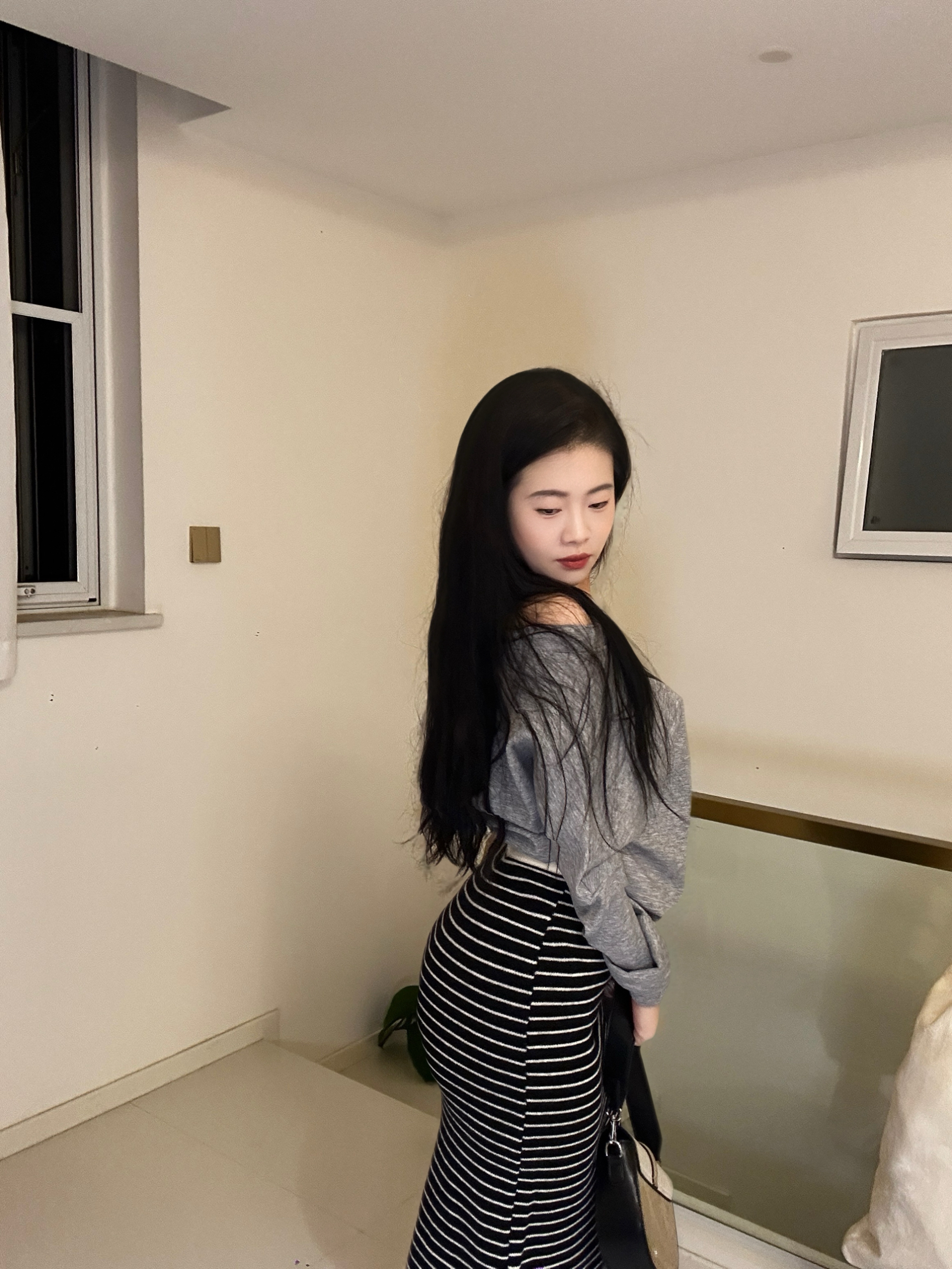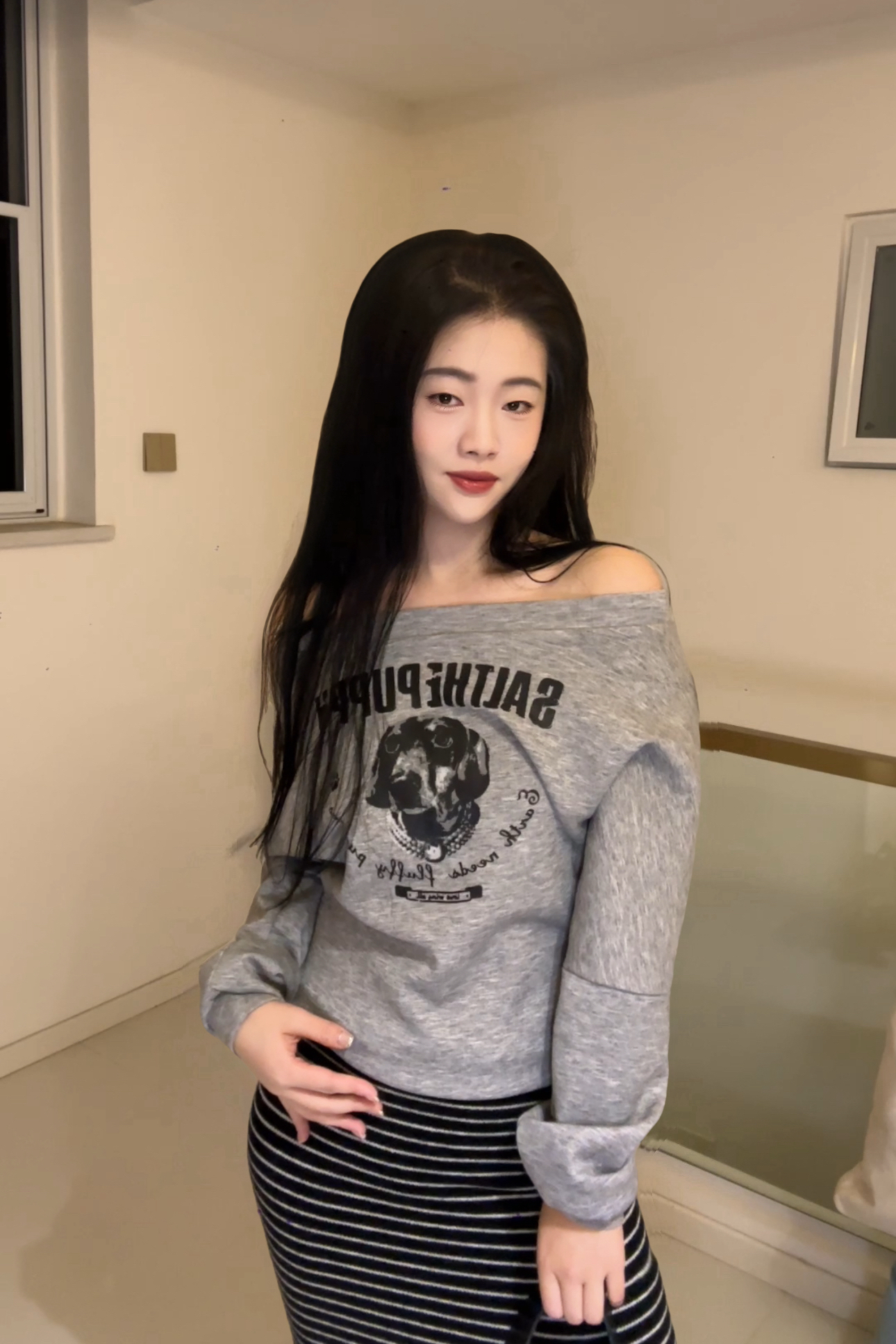露肩款灰色狗狗印花卫衣自带随性氛围~宽松版型藏肉还能露出精致肩颈线条😌,搭配黑白竖条纹半身裙,中和休闲感的同时悄悄拉长下半身比例🖤,再拎个个性包包,日常出街舒适又自带时髦 buff~