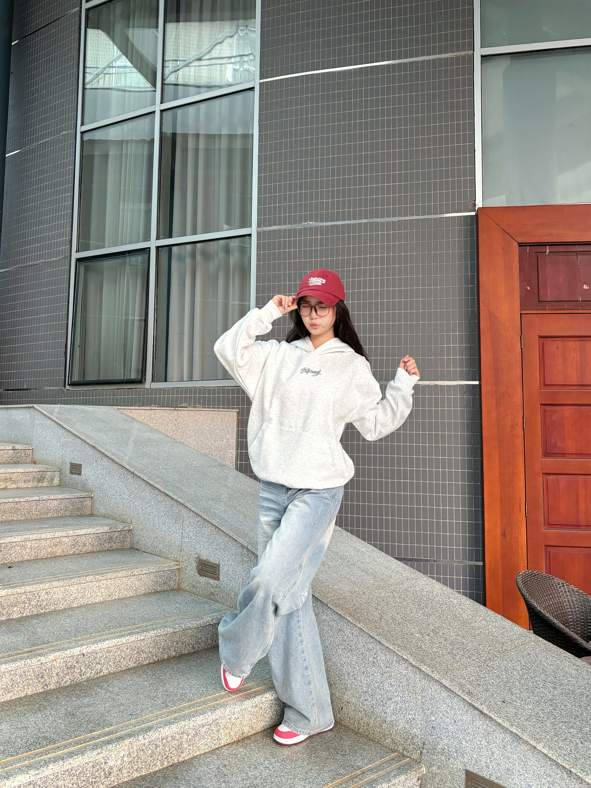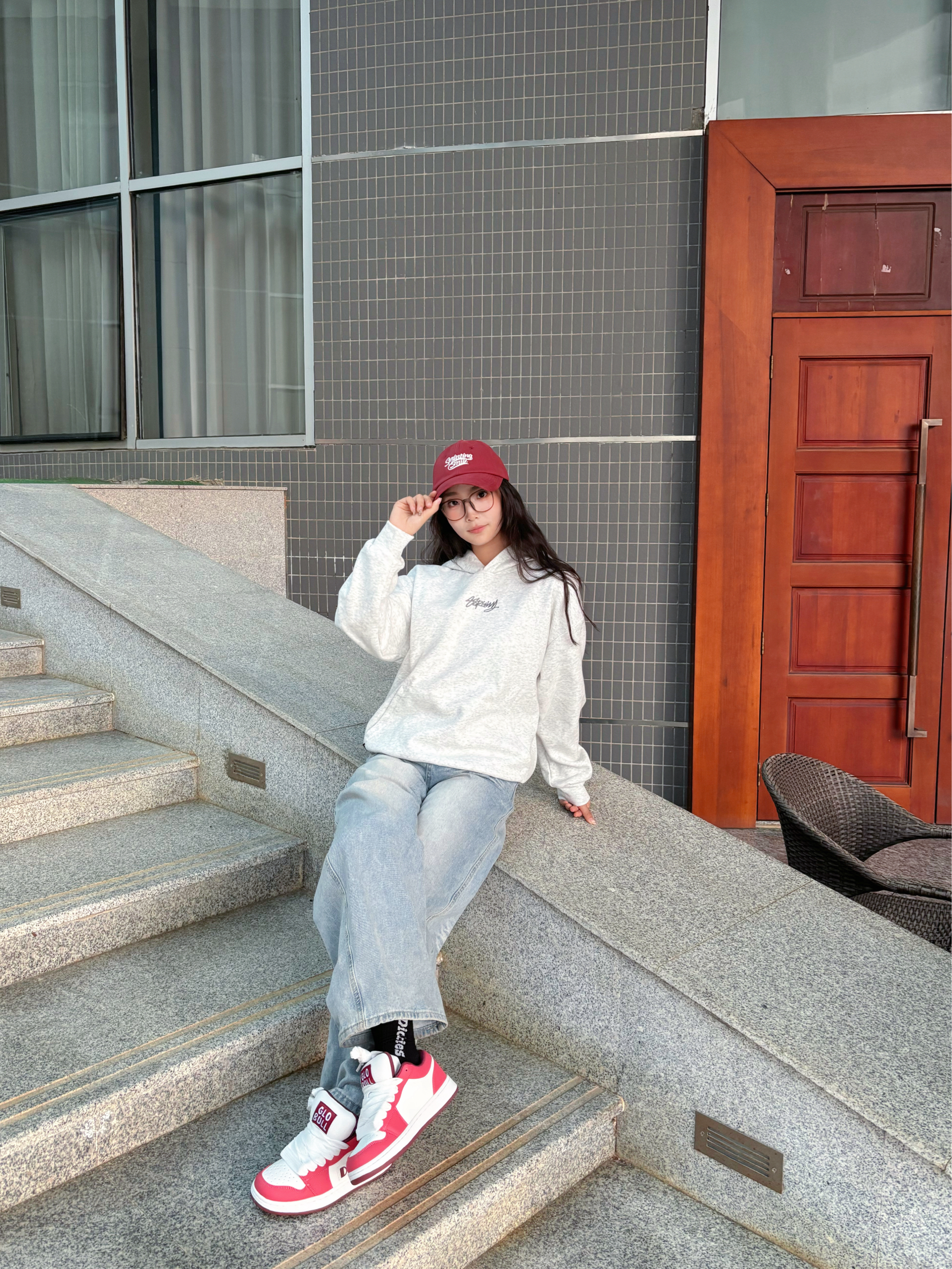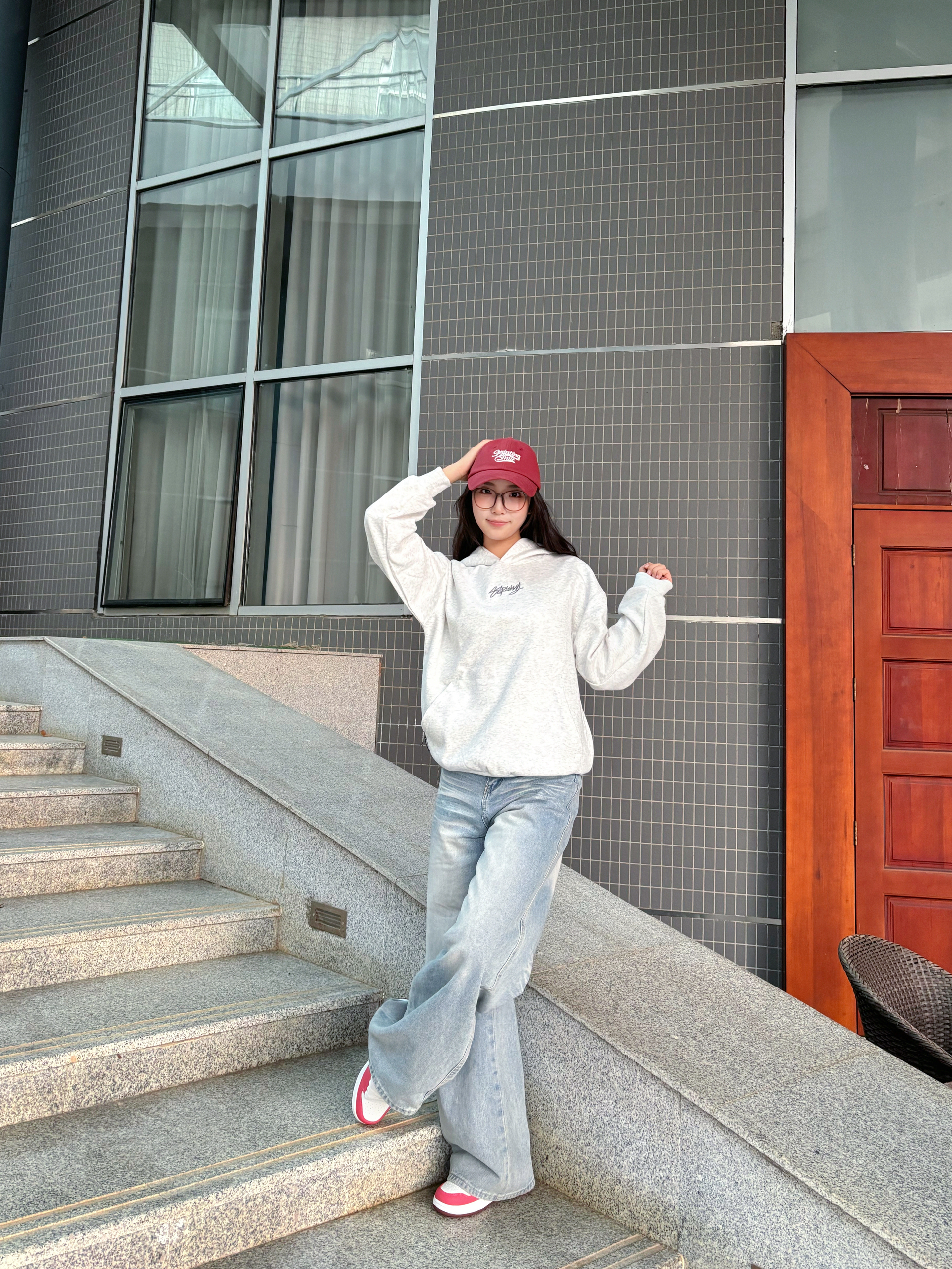软乎乎的灰卫衣上身🥳 下半身搭配着垂感阔腿裤 上脚一双红白鞋面包鞋👟 红帽是随手抓的提亮小彩蛋🎀 舒服又出片的日常松弛感就稳稳落在镜头里啦