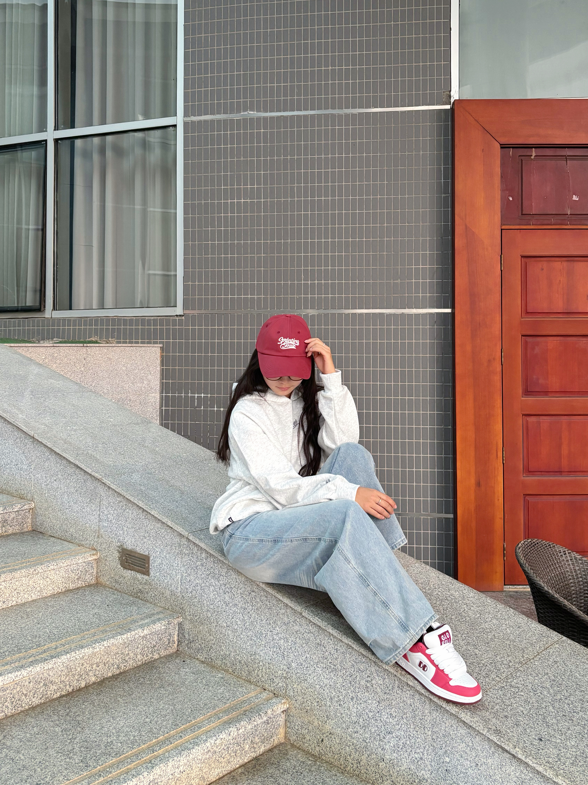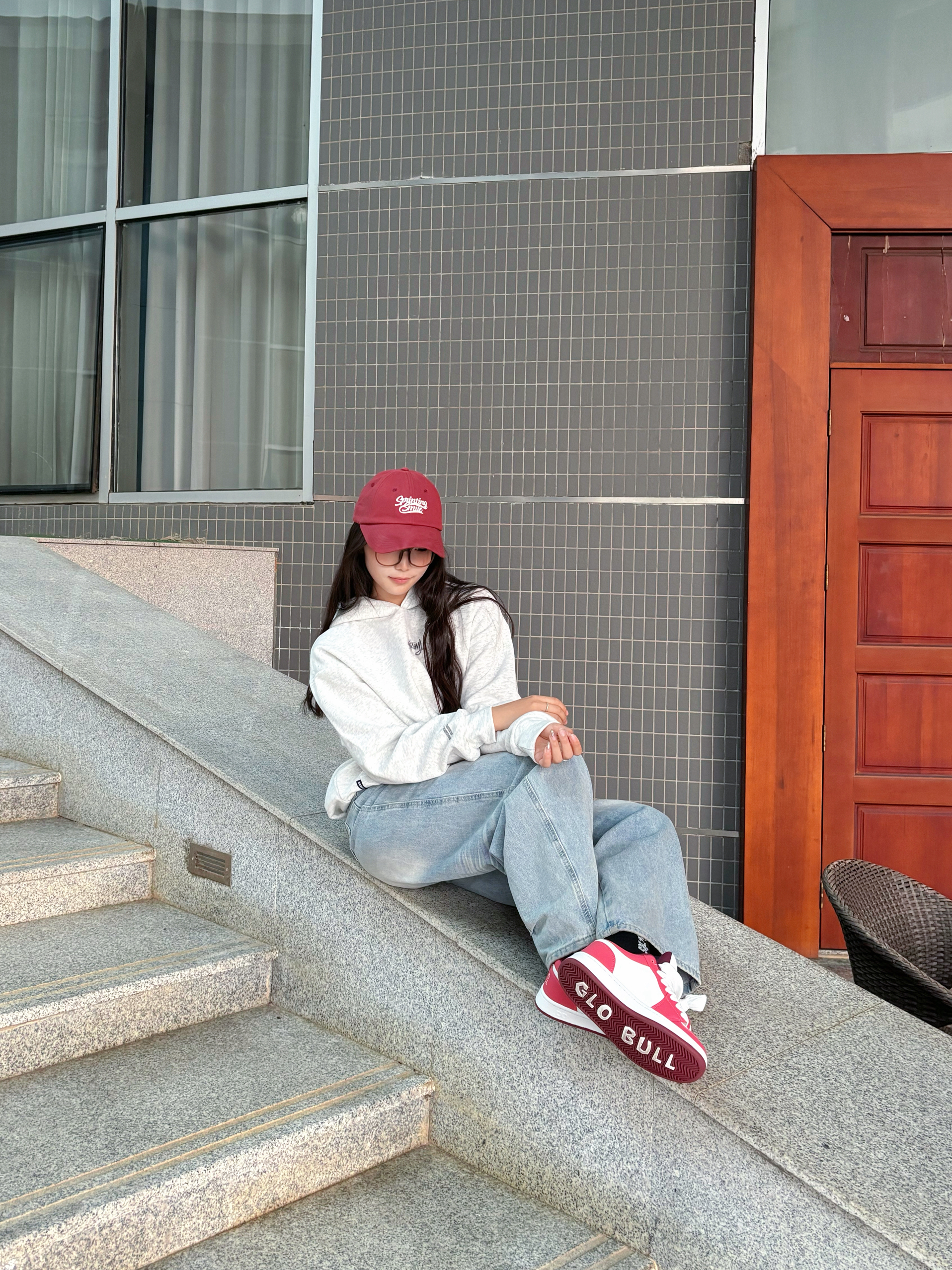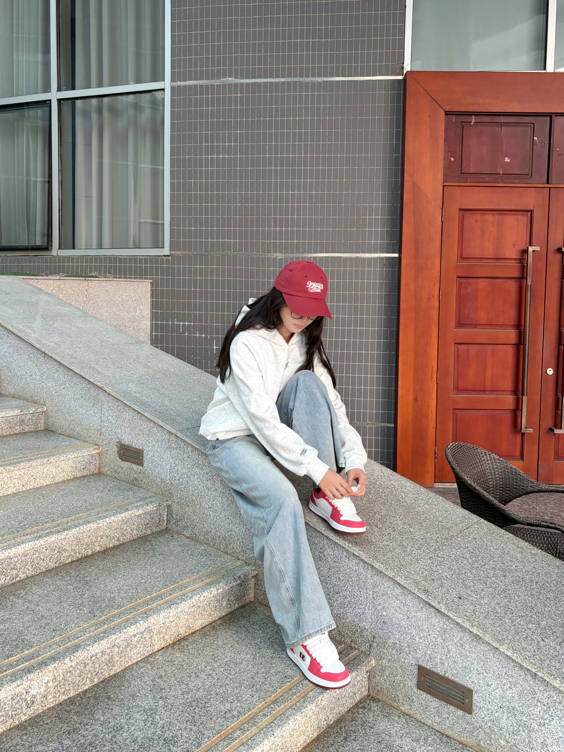 软乎乎的灰卫衣上身🥳 下半身搭配着垂感阔腿裤 上脚一双红白鞋面包鞋👟 红帽是随手抓的提亮小彩蛋🎀 舒服又出片的日常松弛感就稳稳落在镜头里啦