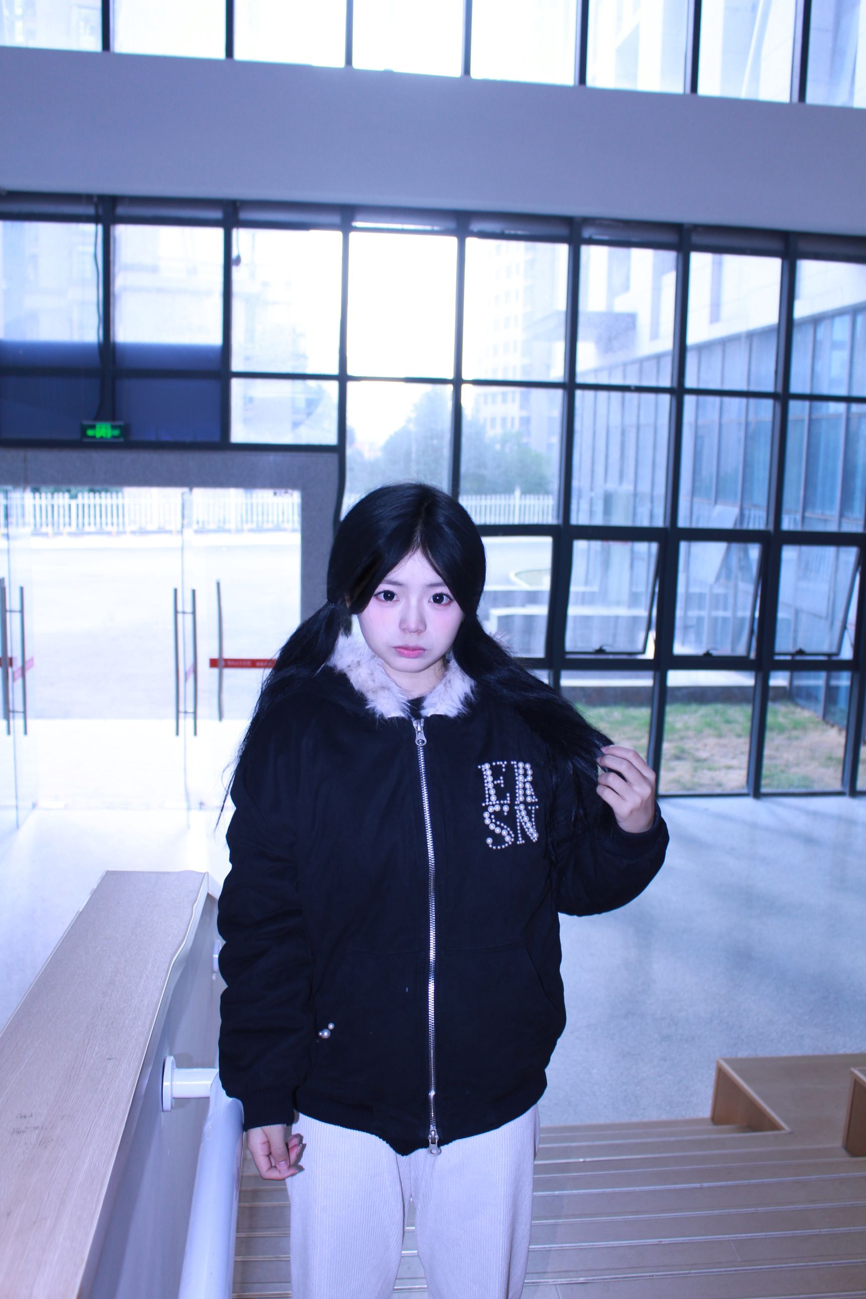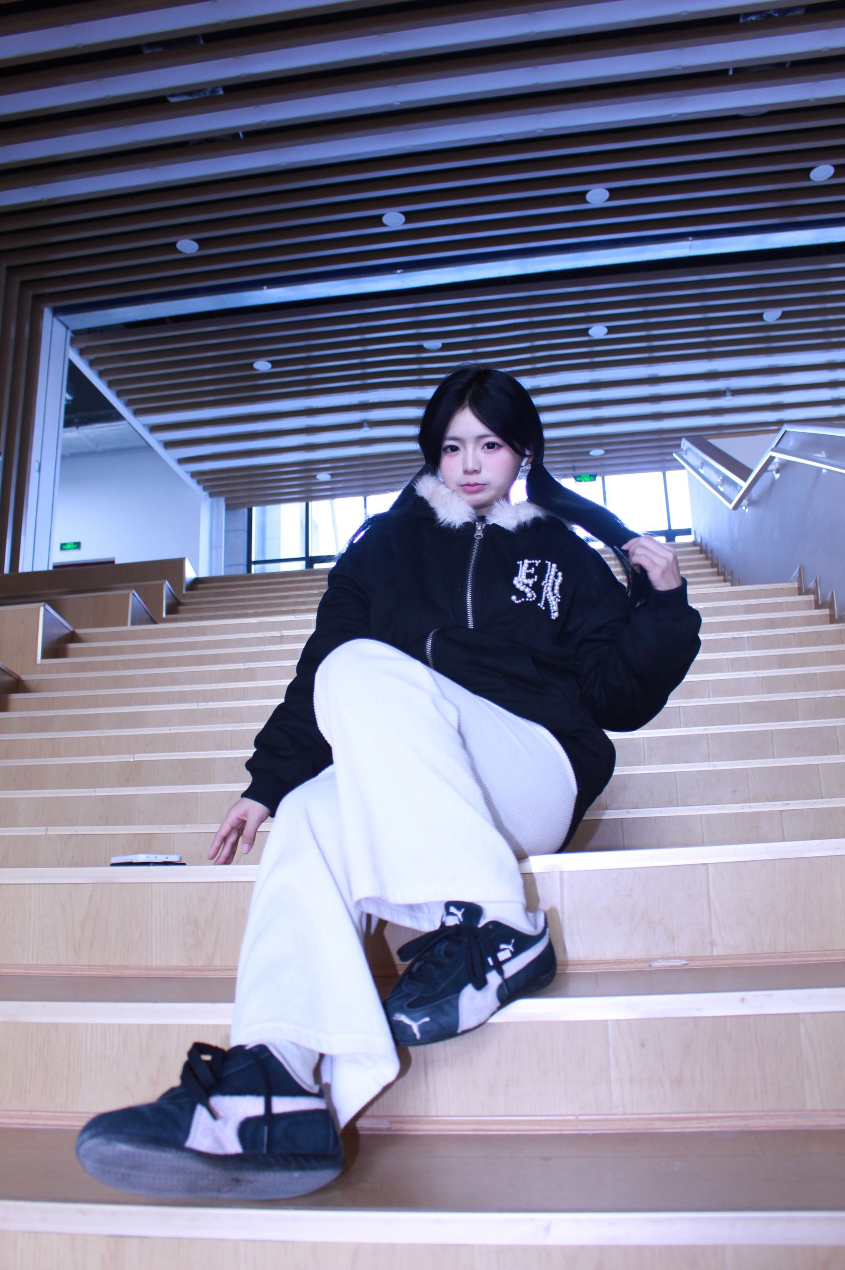 通过搭配黑色猫耳带珍珠的黑色外套,保暖又酷帅,加上白色的有层次感裤子。朴彩英同款鞋子,特别的好看且百搭!既时尚又舒适!