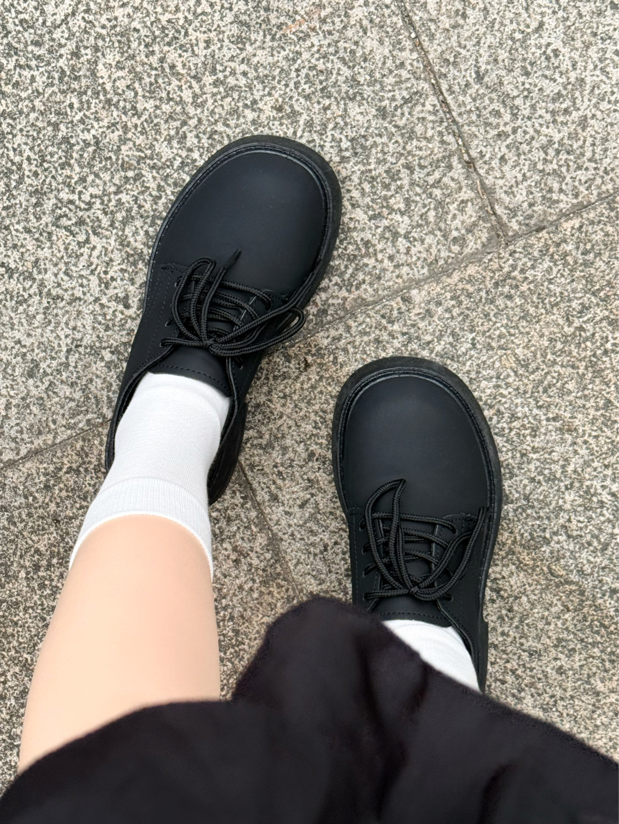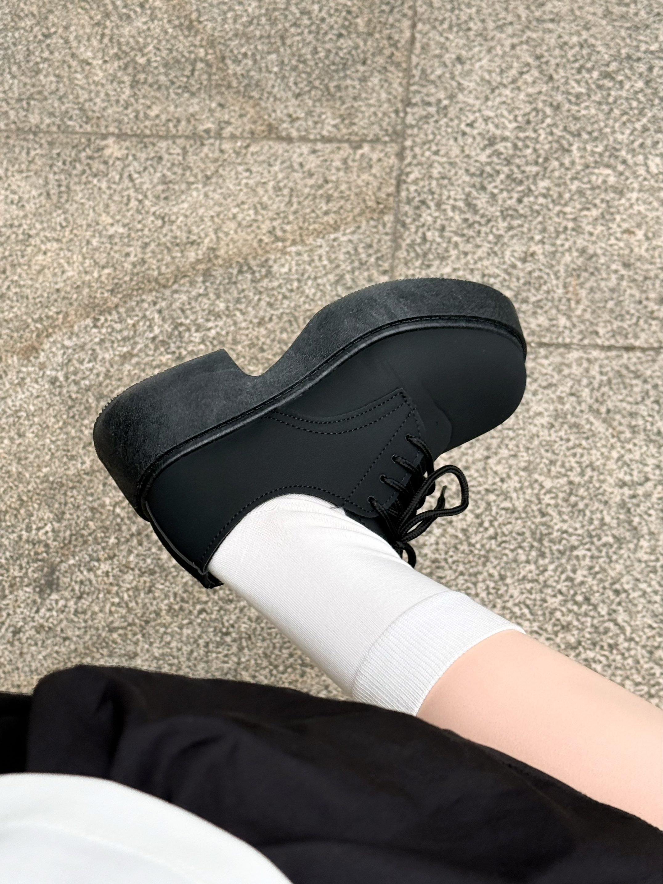 这双黑色厚底德比鞋 真的是我最近的心头好! 哑光皮质质感在线 鞋型复古又不失酷感 日常通勤、出街都很合适 搭配白色中筒袜和小皮裙 简约又有层次 还能悄悄增高显腿长 秋冬穿它 保暖又时髦 懒人穿搭的救星~