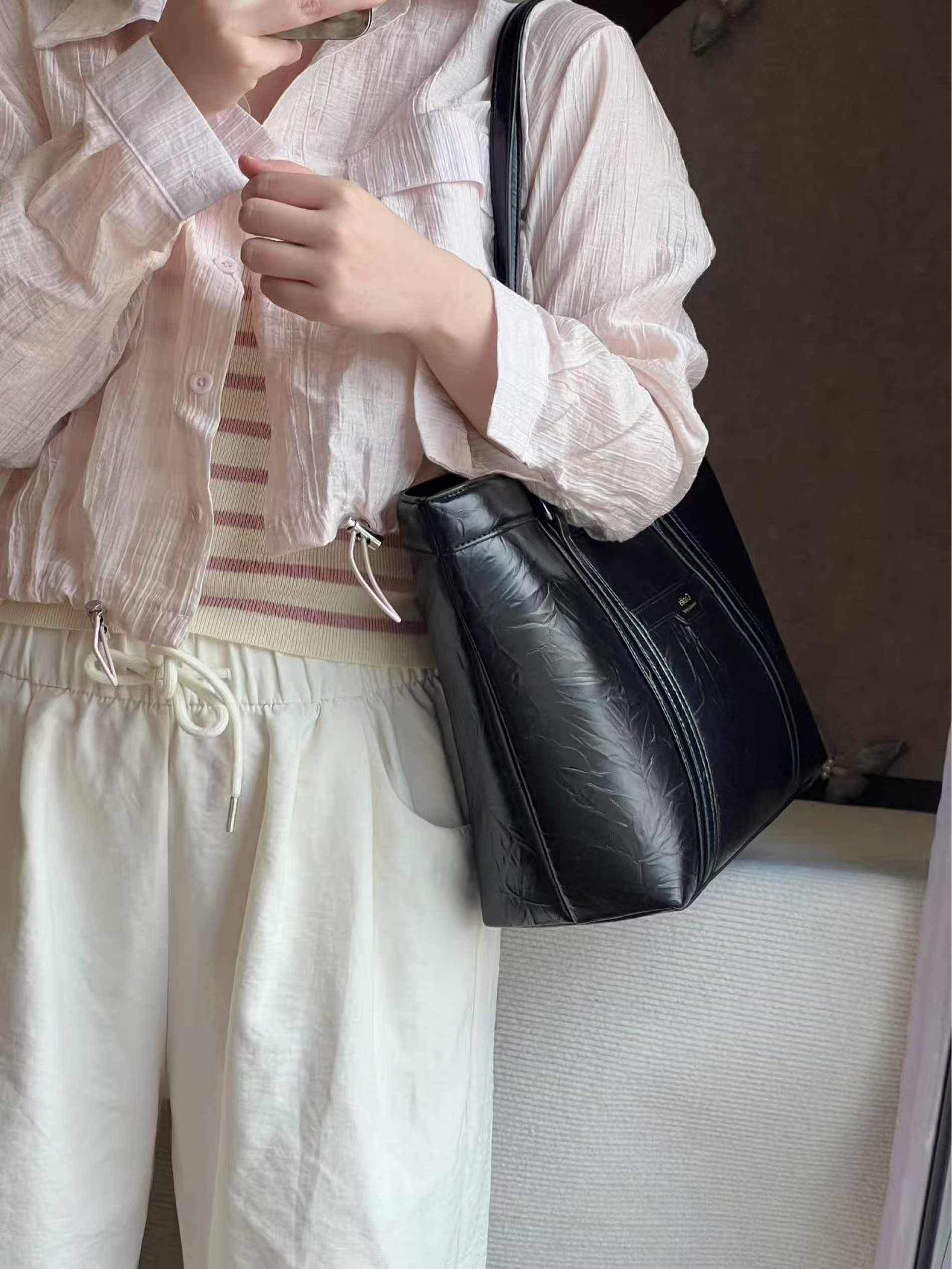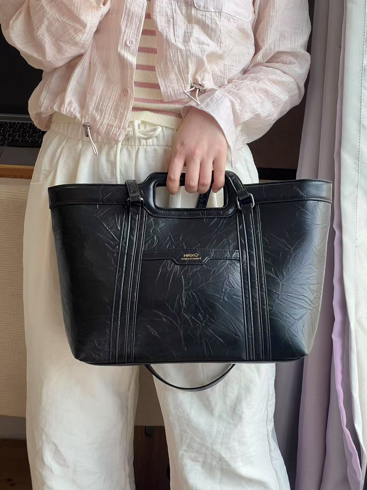 毕业了 这下是真要当🐮🐴了 平常上班要带笔记本电脑之类的 托特就蛮合适的 介个包包自重比较轻 黑色油蜡皮质感✌︎' ֊'还挺百搭的~ 158的小个子背着挺合适的 不压个子耶 既可以当托特 也可以当手提公文包💼还挺实用吖!