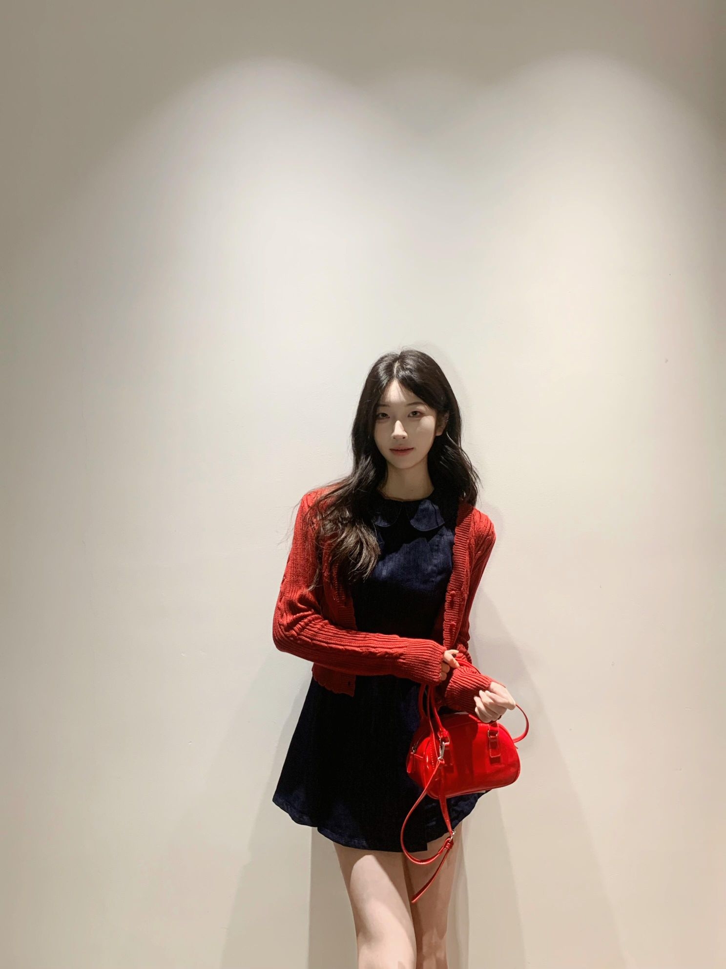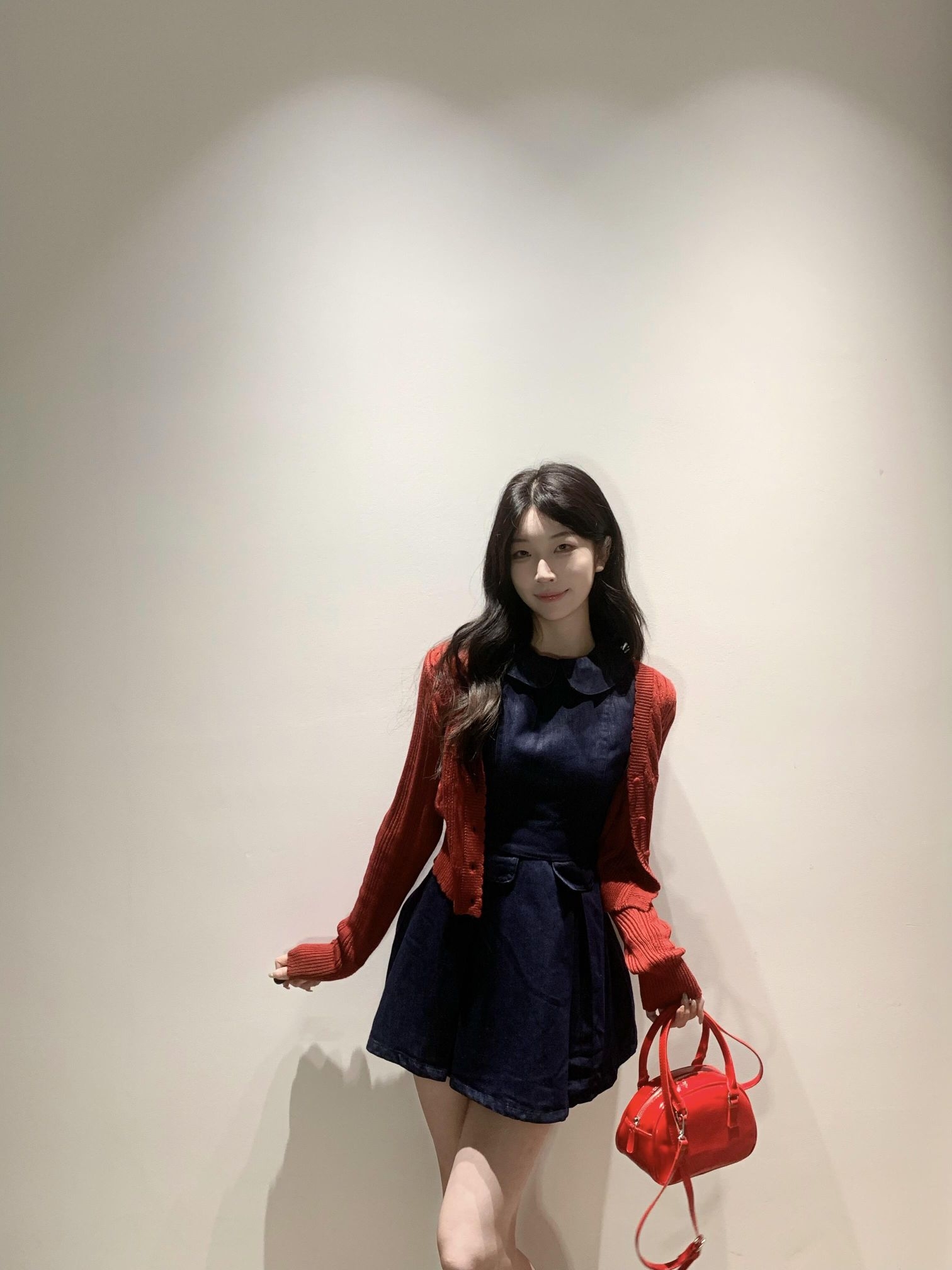 迟伞伞家杜松子梅果好提气色!浆果红色和深色牛仔的撞色尊滴很吸睛👀虽然是牛仔面料但还是比较亲肤的~裙摆的裁片版型比较挺括 腰部收的刚刚好。开衫颜色也是很高级的浆果红色 针脚很密实 是有一点点厚度的 适合秋天穿
