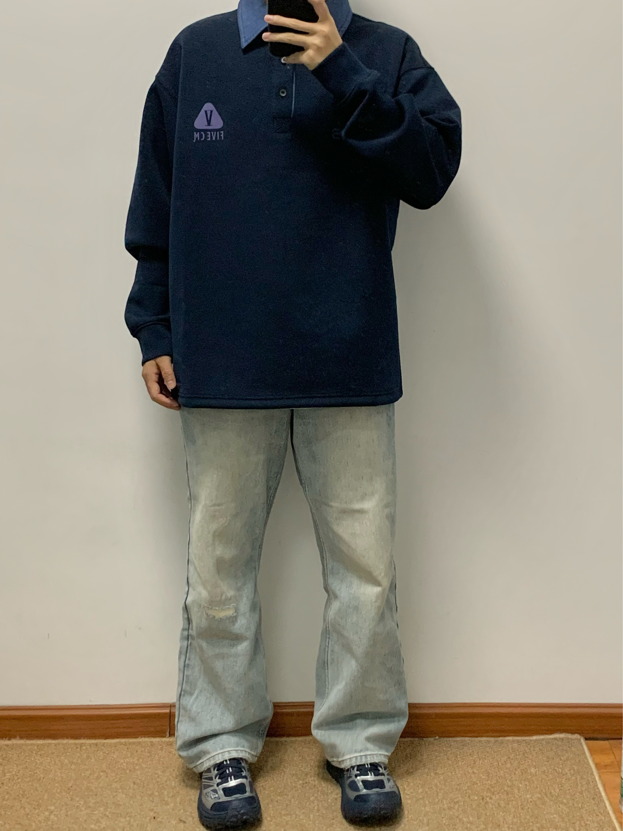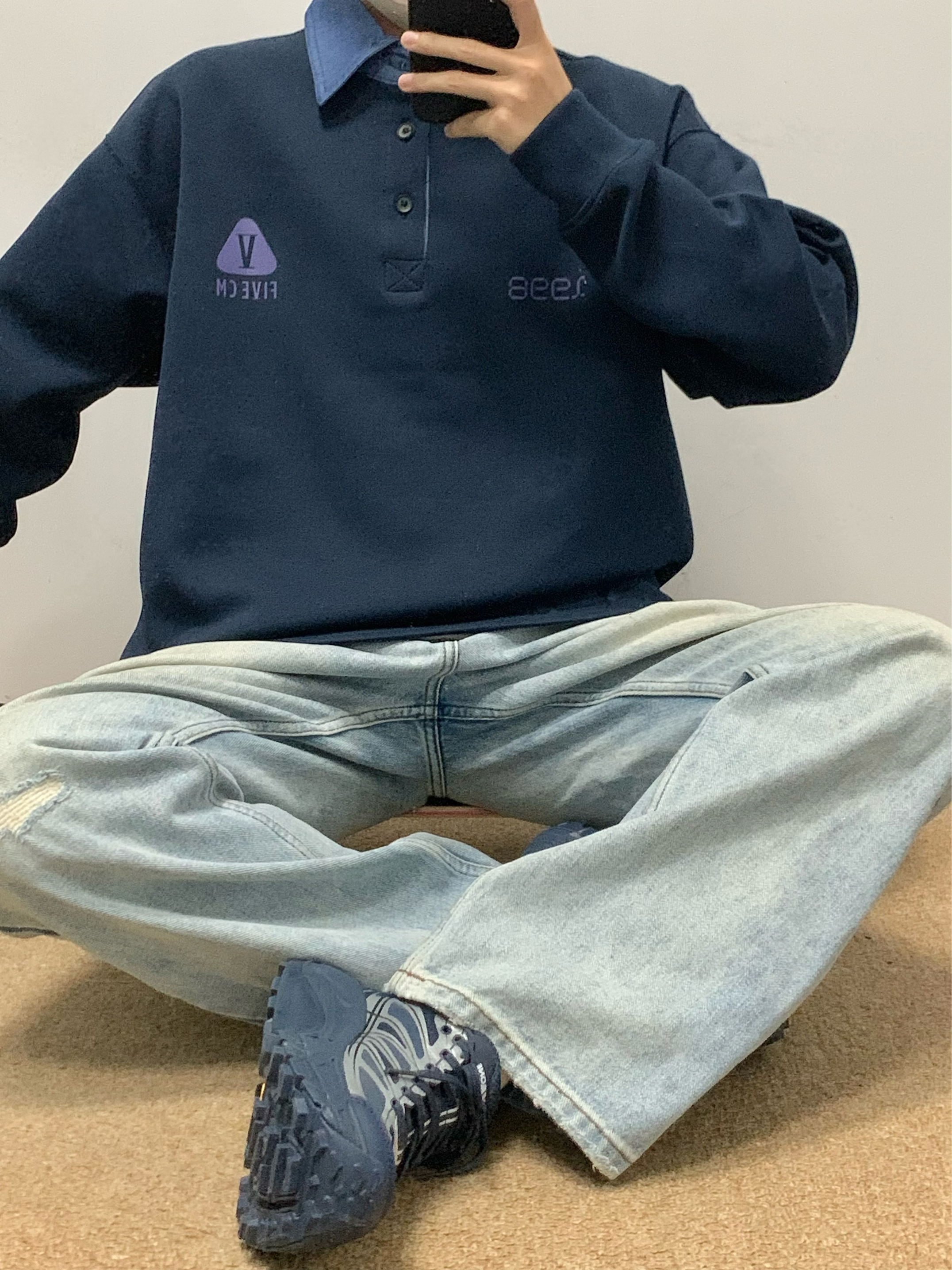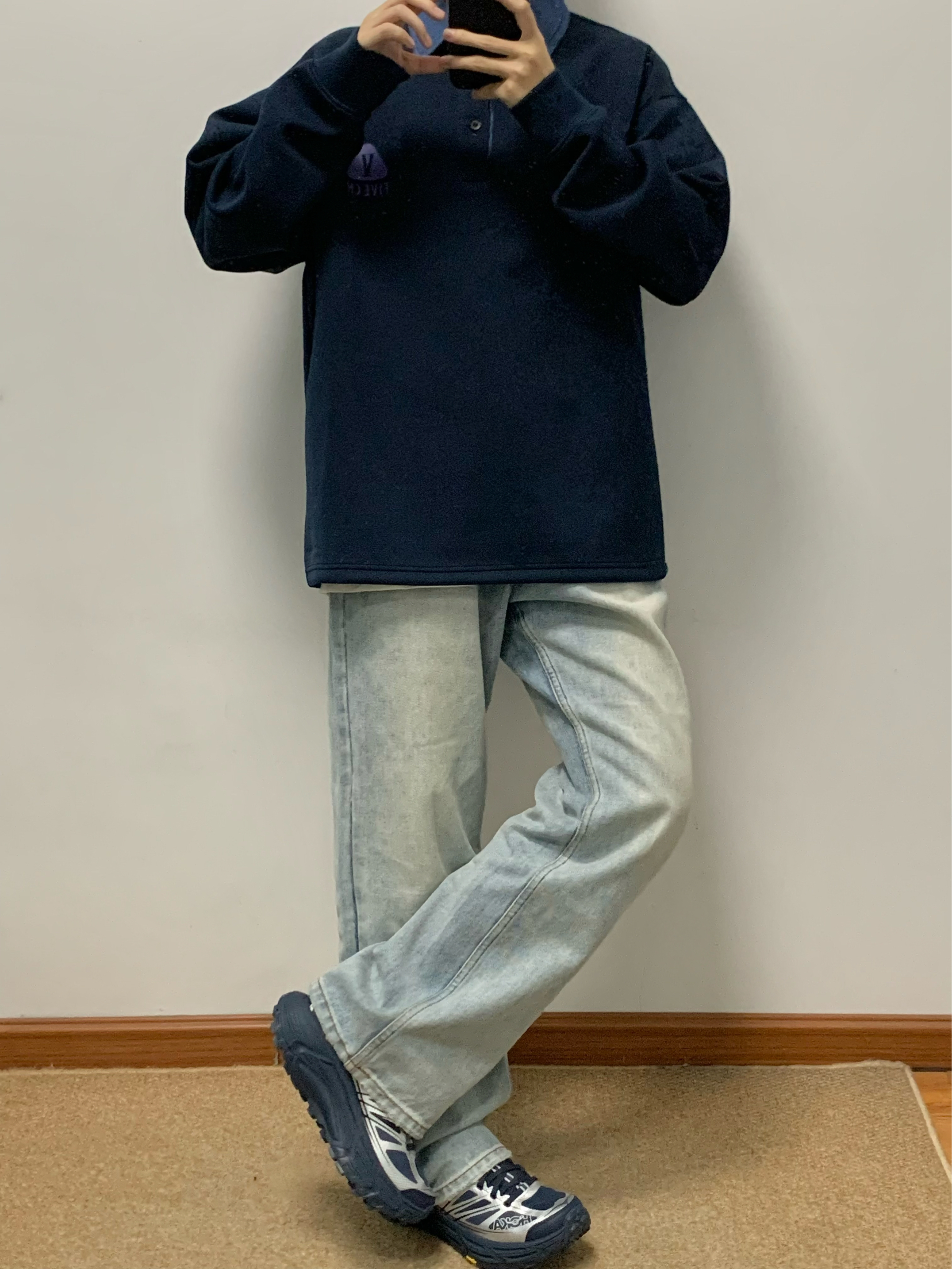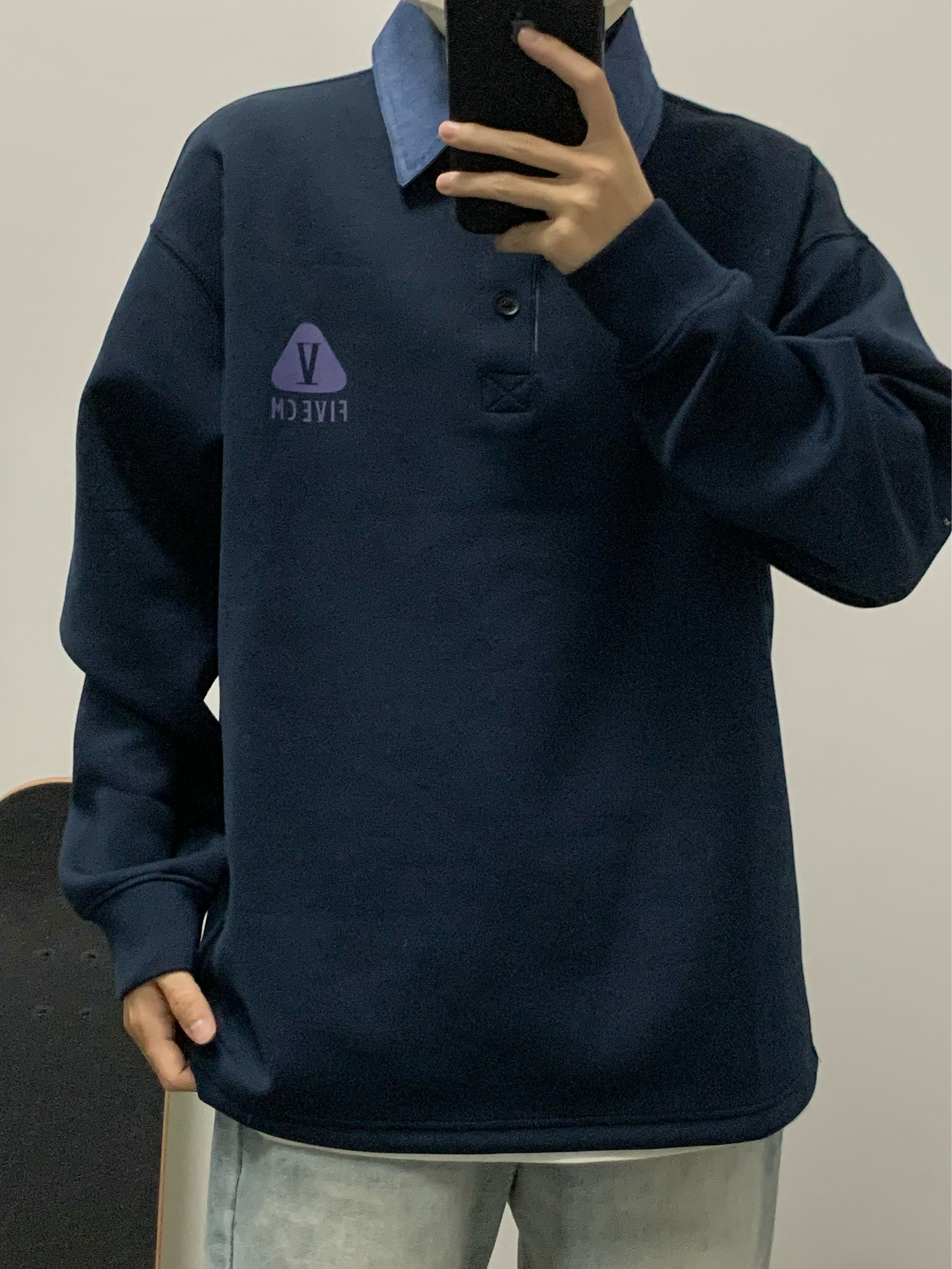 蓝色卫衣搭配蓝色牛仔裤 美式风拿捏 Polo领的撞色设计 很吸睛 面料软软糯糯的 穿起来很舒服 宽松的版型 不挑身材 入秋就穿这一身 包帅的!