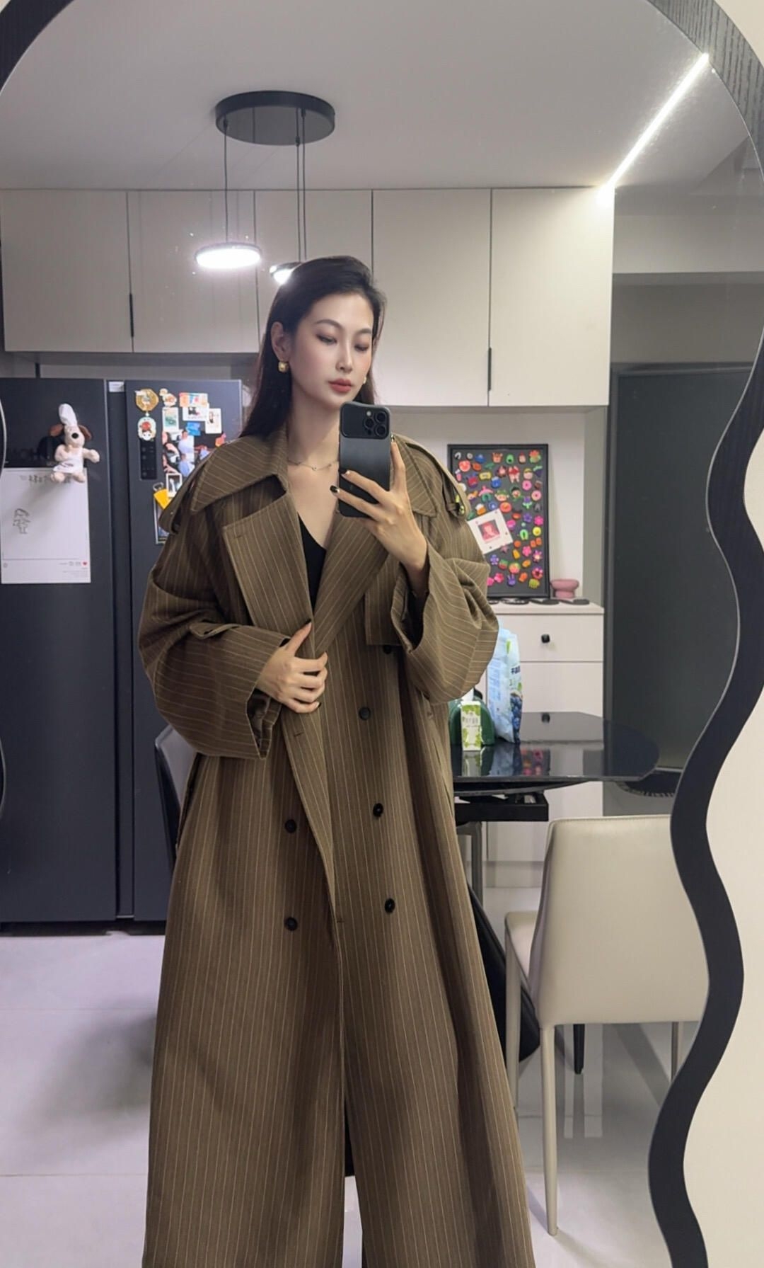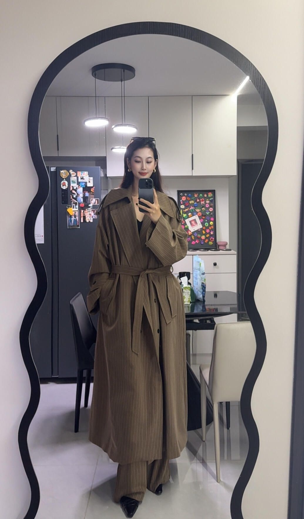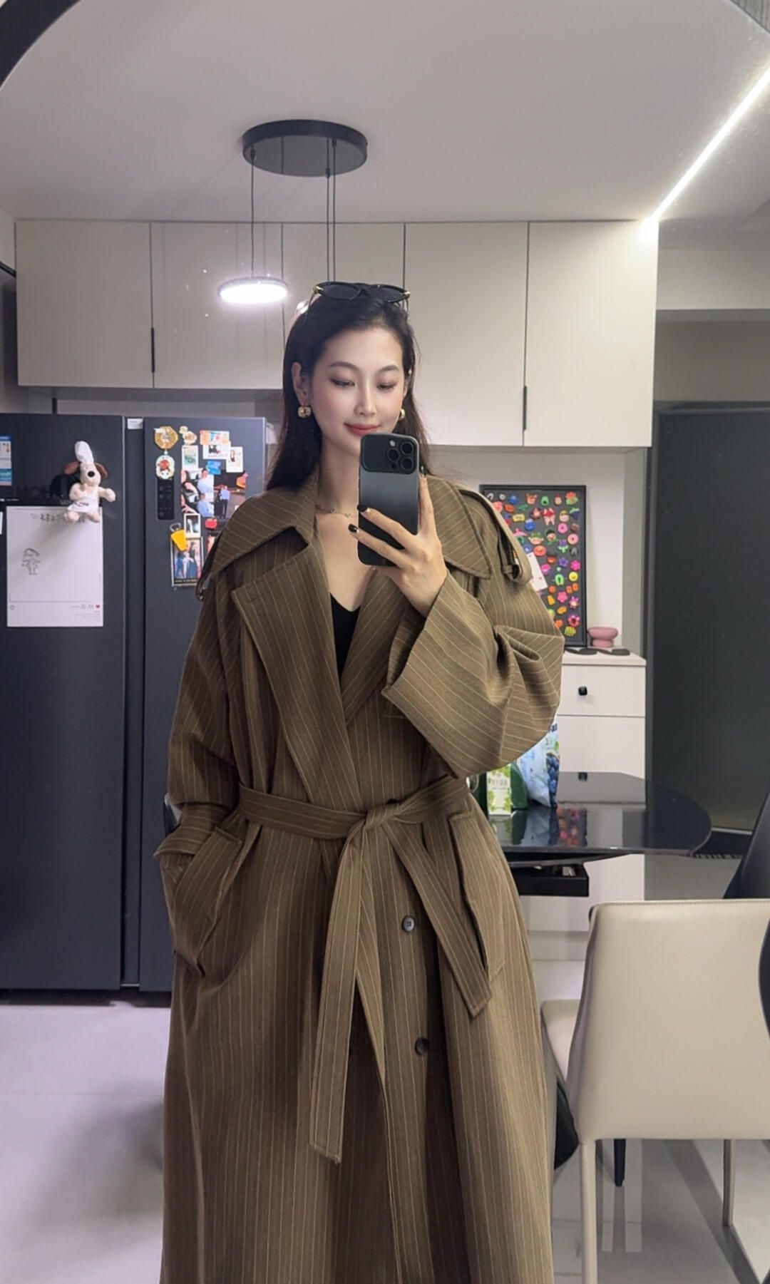 超绝的咖色条纹风衣+裤子套装 衣长140 高个子女生简直狂喜 自带裤子 完全不用考虑怎么搭配下装 懒人必备了 ps : 颜色实际会比照片浅一丢丢