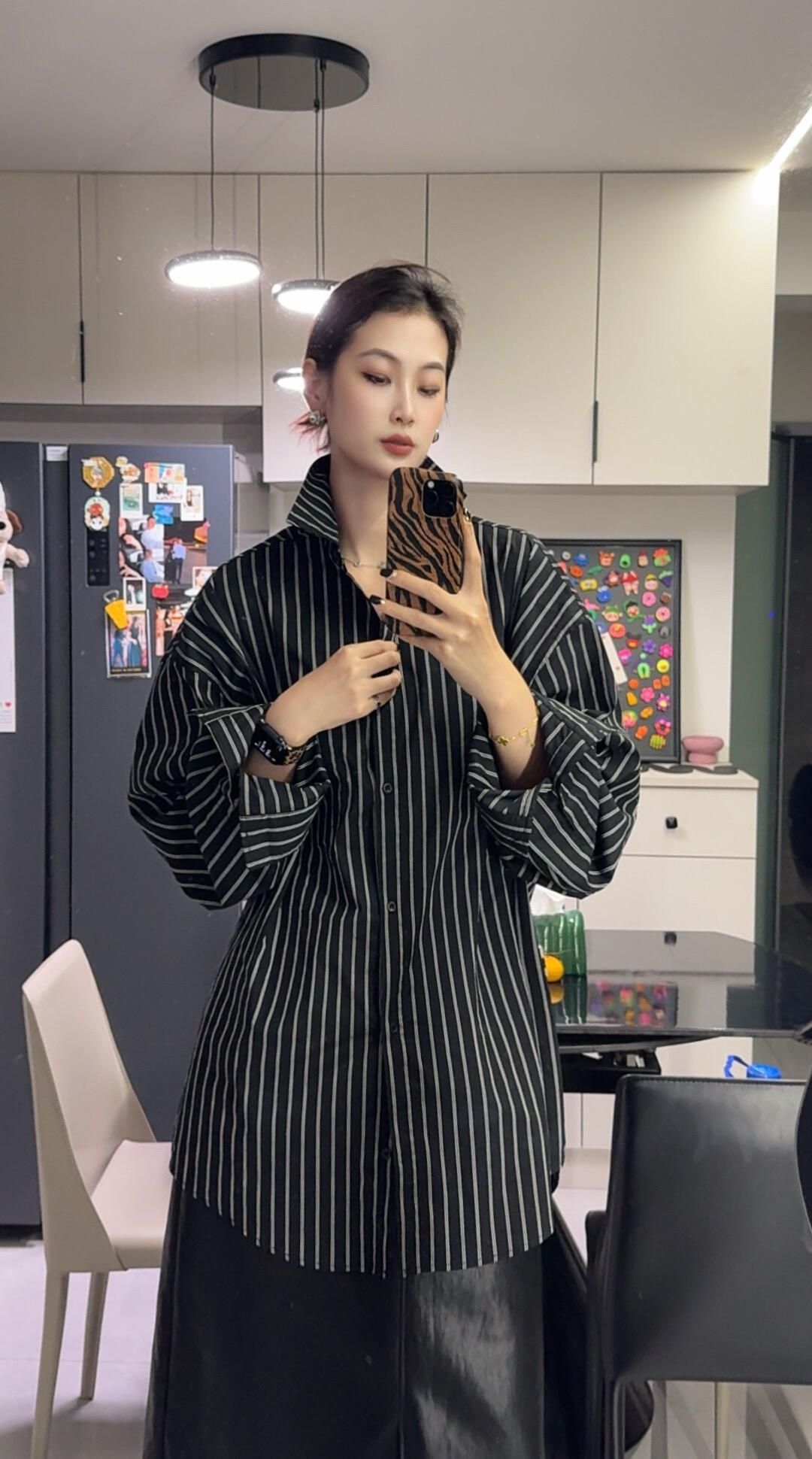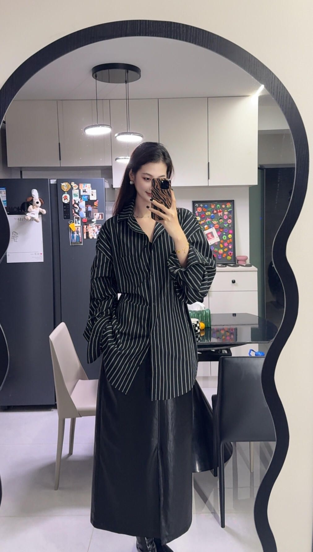 性价比超高的一身 扩版的条纹衬衫特别好穿 搭配直筒皮裙 一点都不显胯 超chill的一套