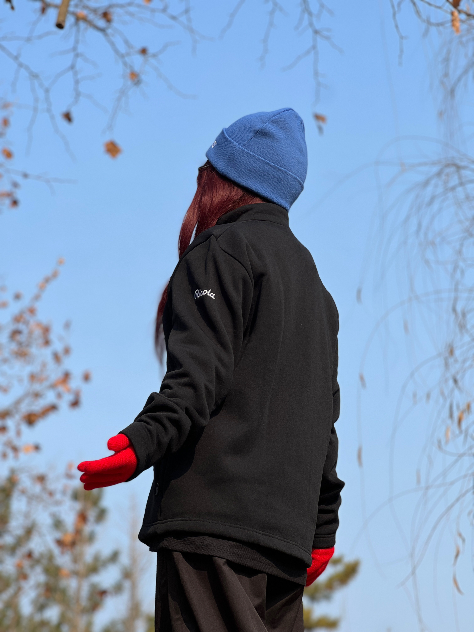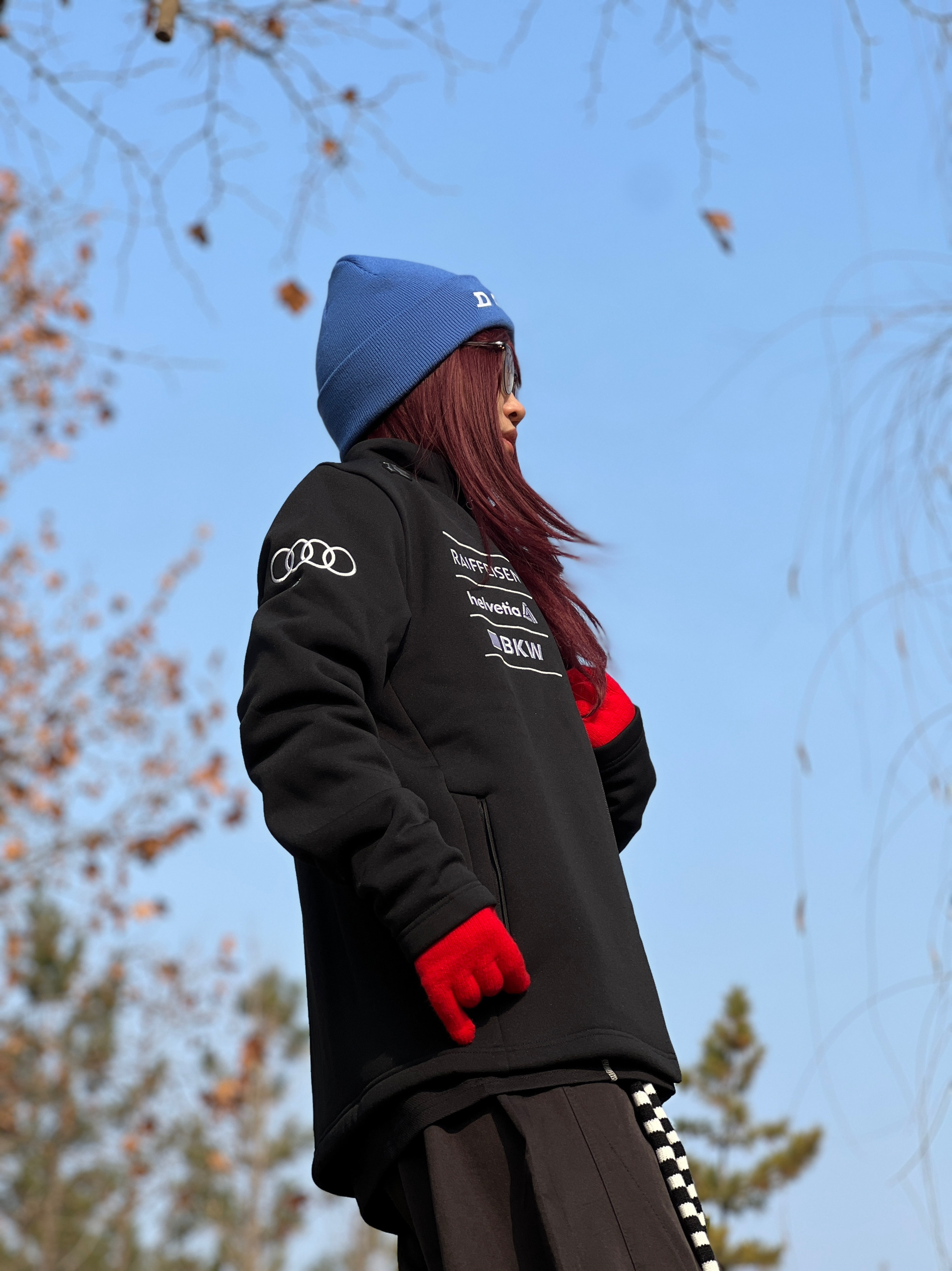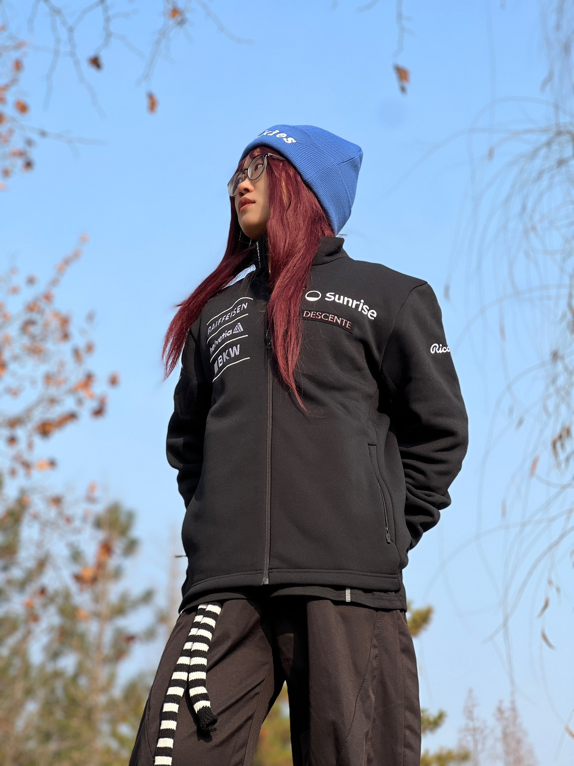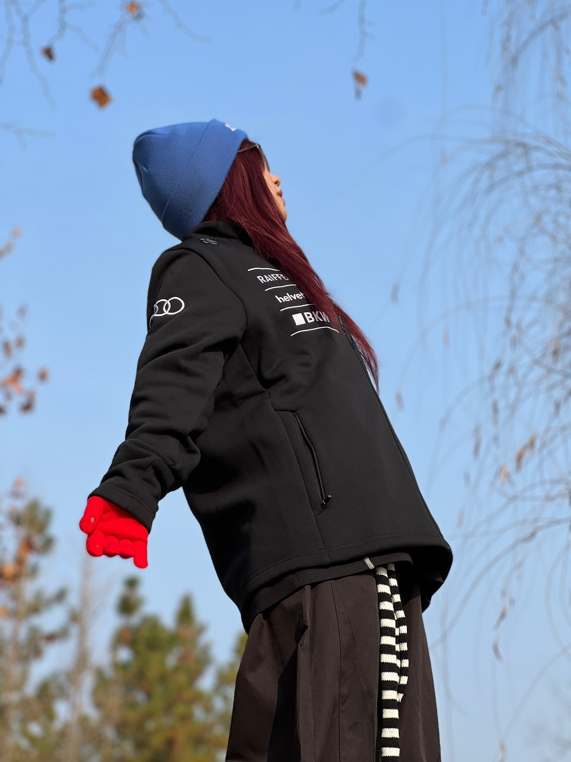 黑色迪桑特加绒立领夹克➕黑色弯刀裤 怕All black太闷? 这波用克莱因蓝💙冷帽撞正红手套🧤,直接把“低调里蹦跶点野”焊在身上。 黑白条纹针织小配饰再添点跳脱感,松弛感这不就来了❓