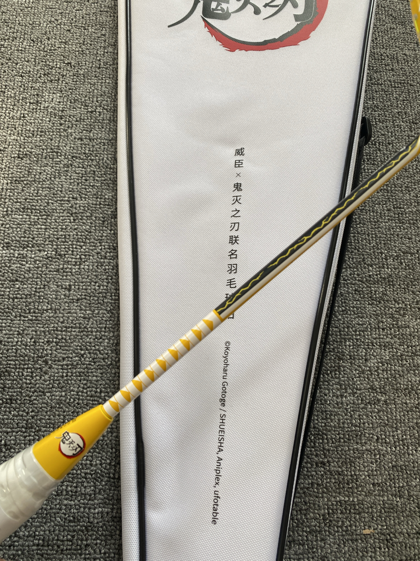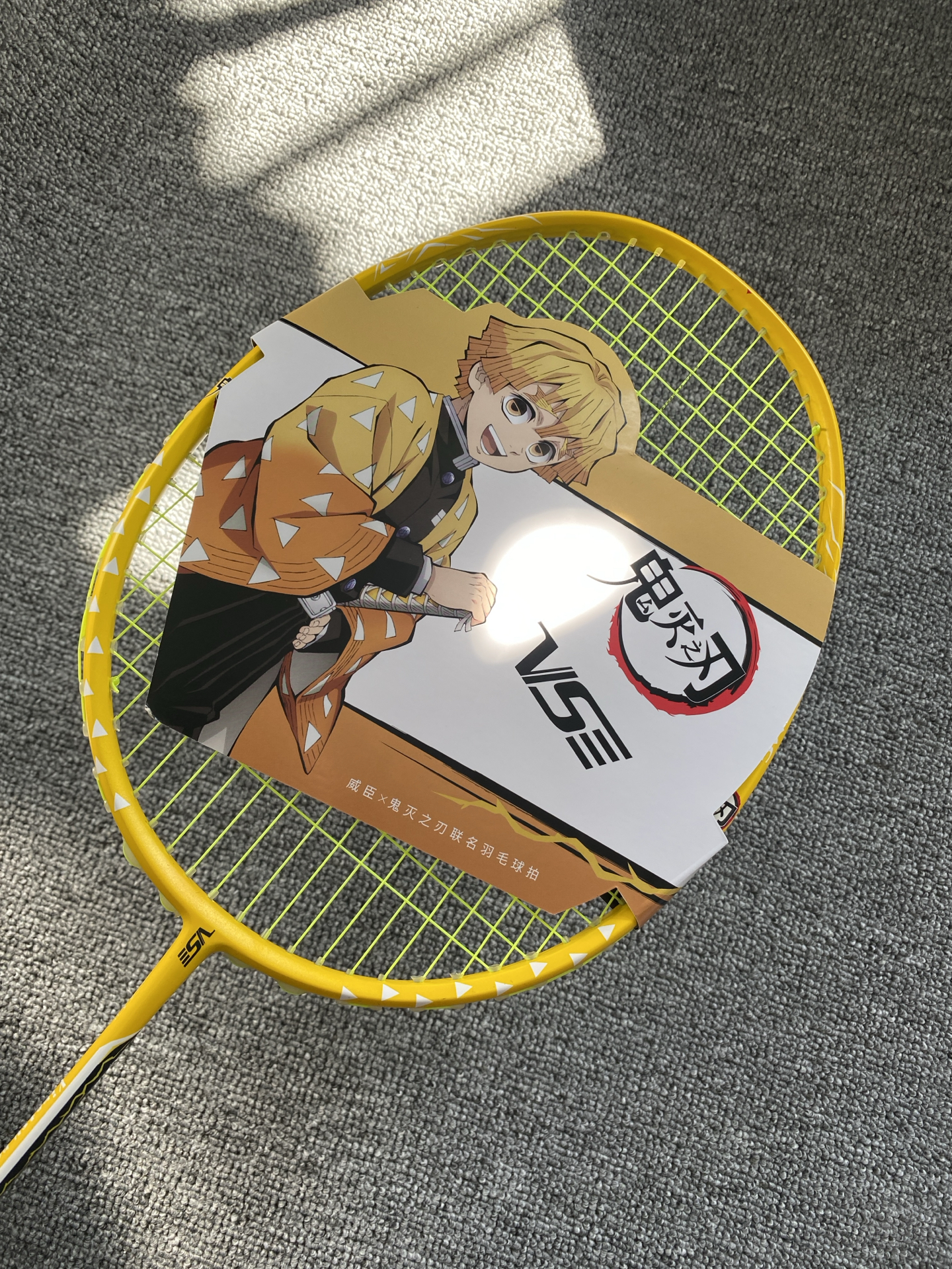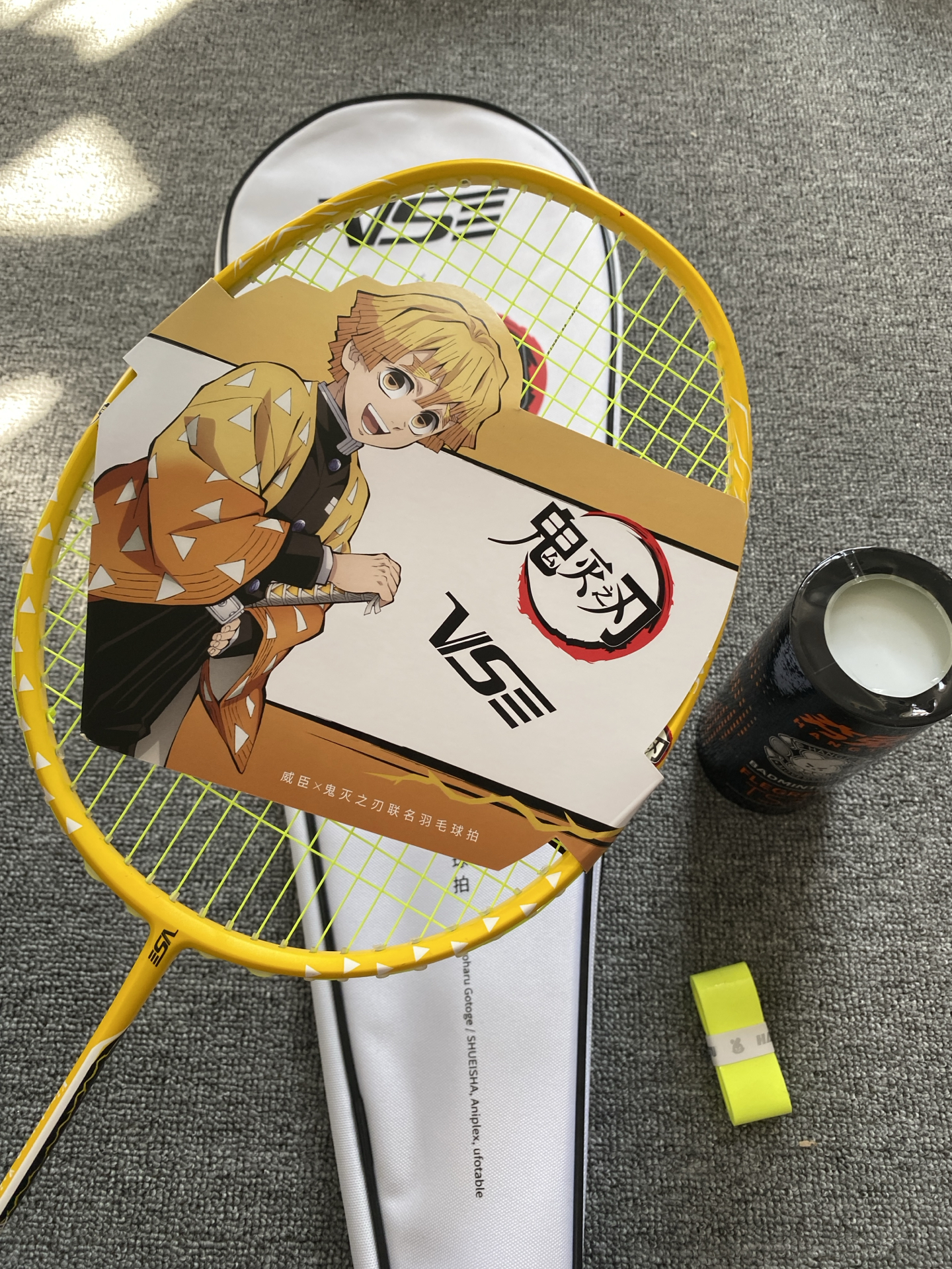 我发现鬼灭联名羽毛球拍啦!粉黄配色好亮眼,全碳素才约83g,挥着轻还稳~不过穿线磅数≤30磅,专业选手可能觉得上限低😅 我这种追番又爱打球的,室内外玩都很搭呀🎾