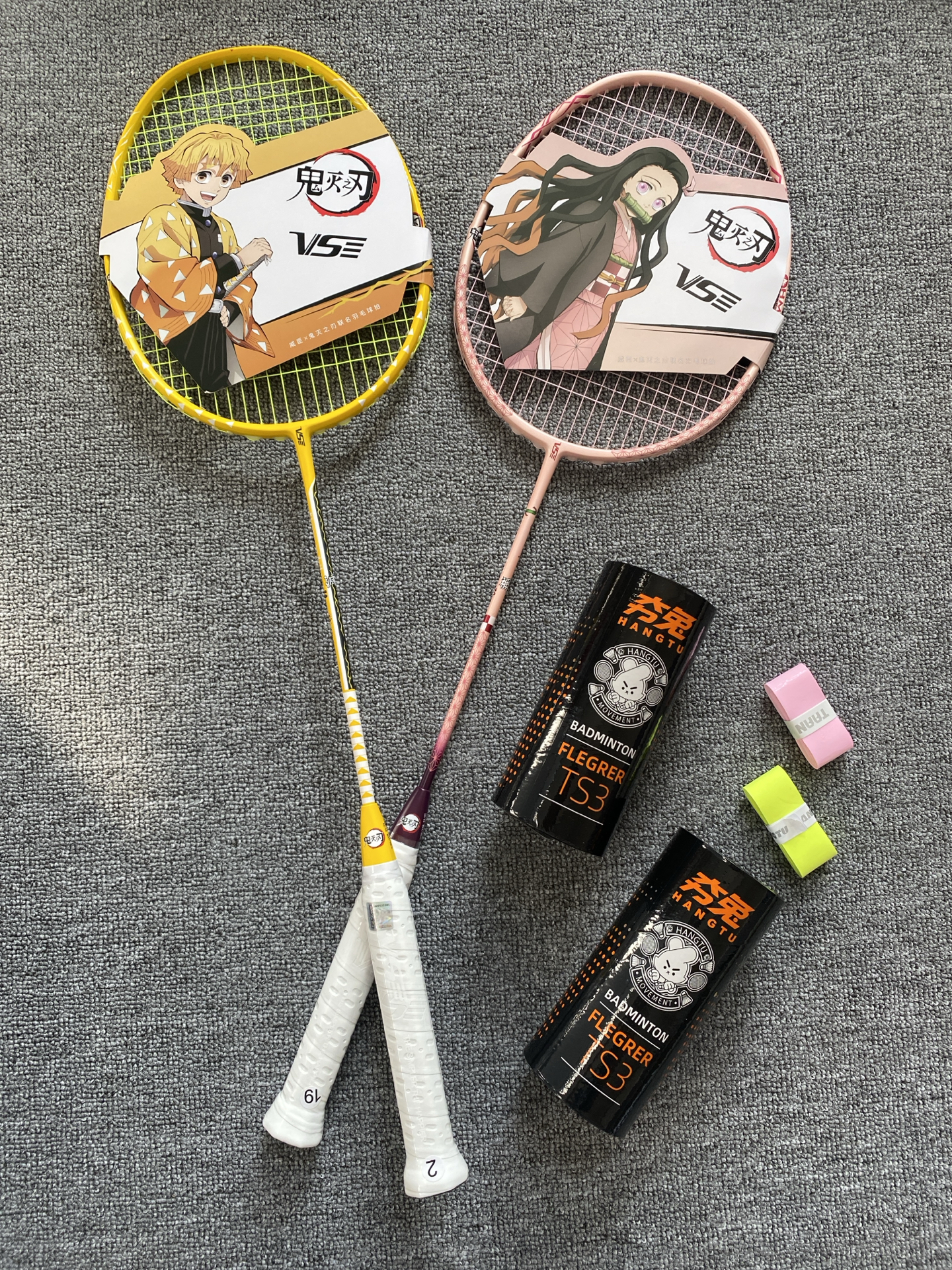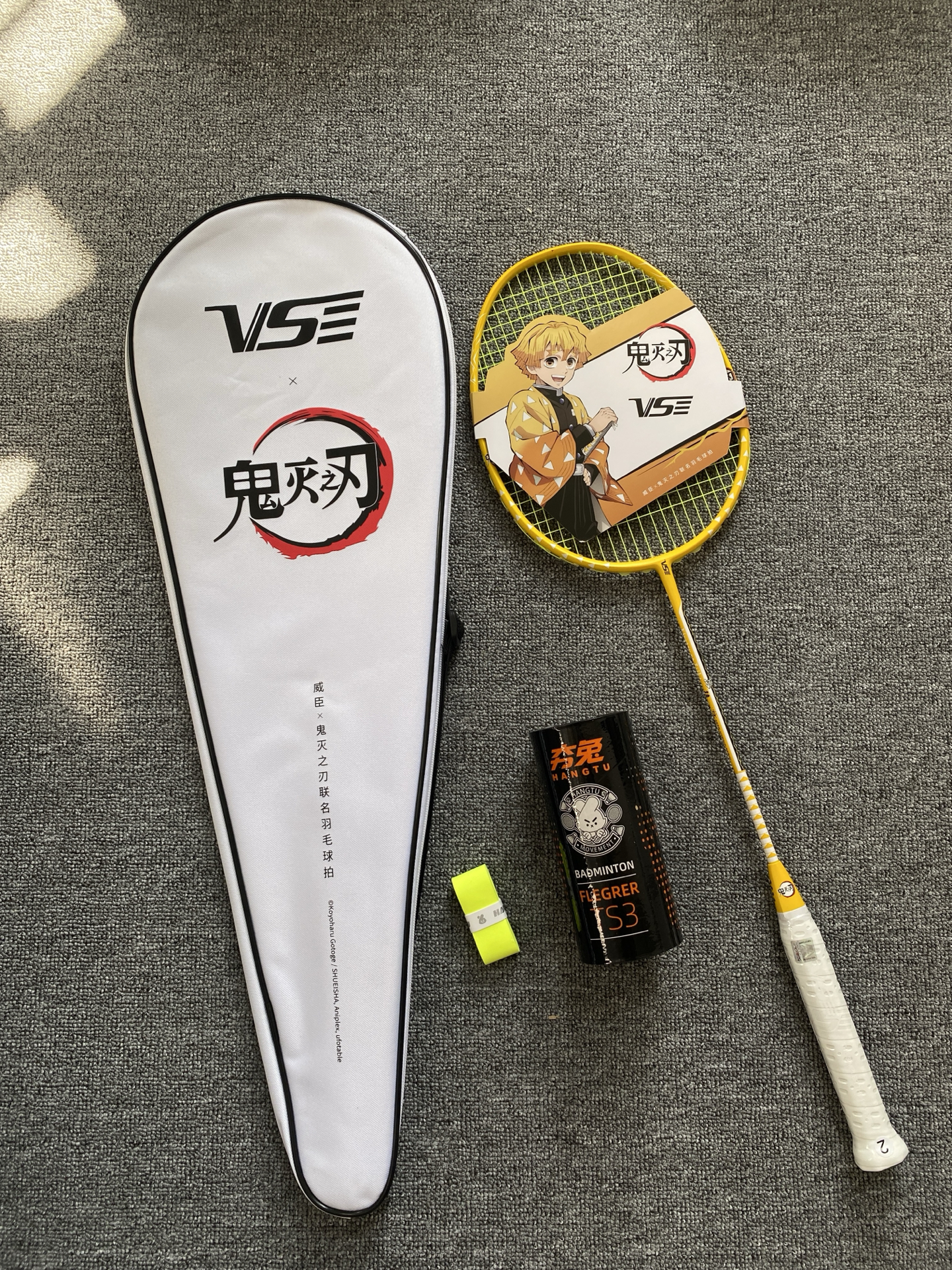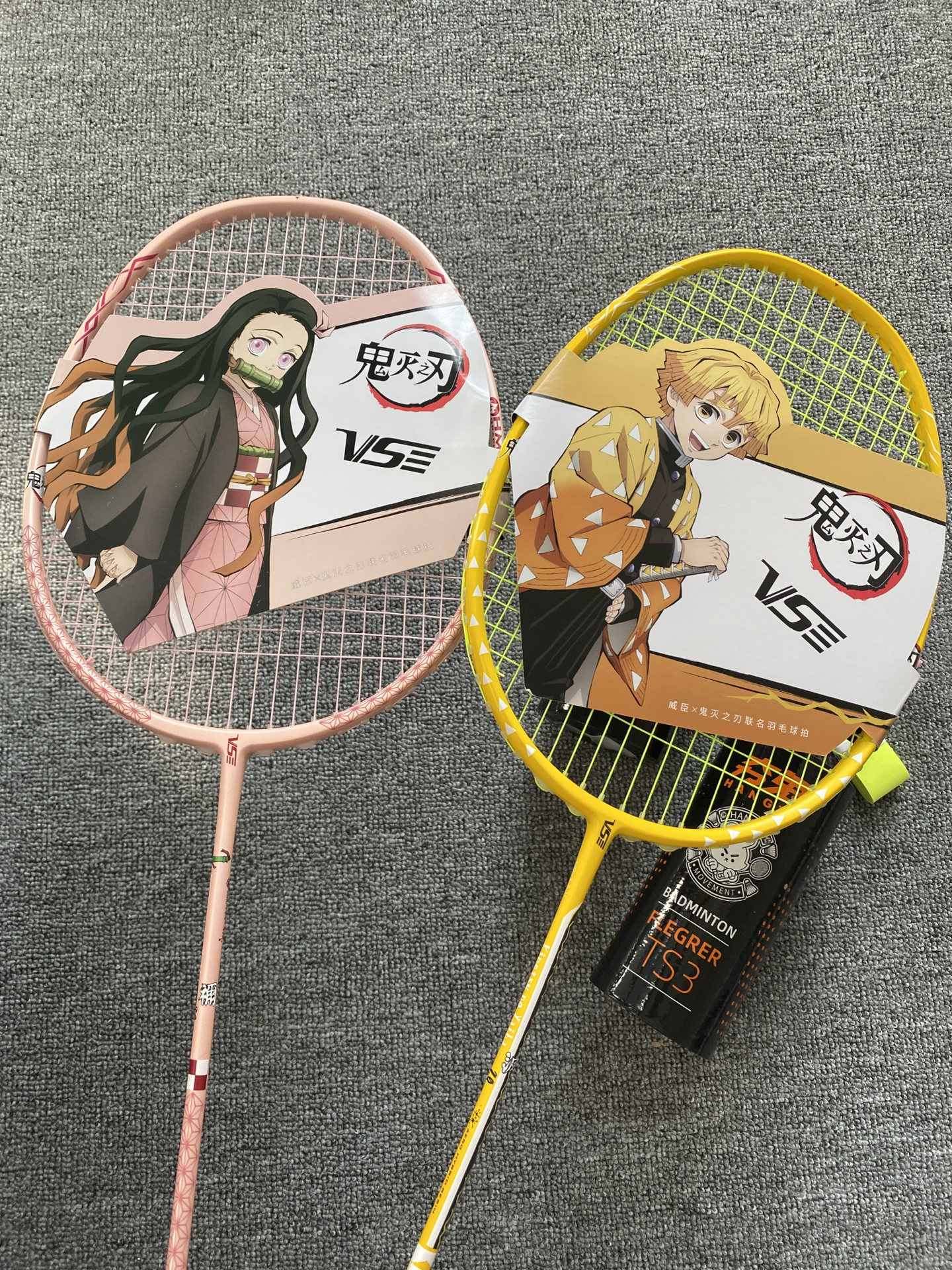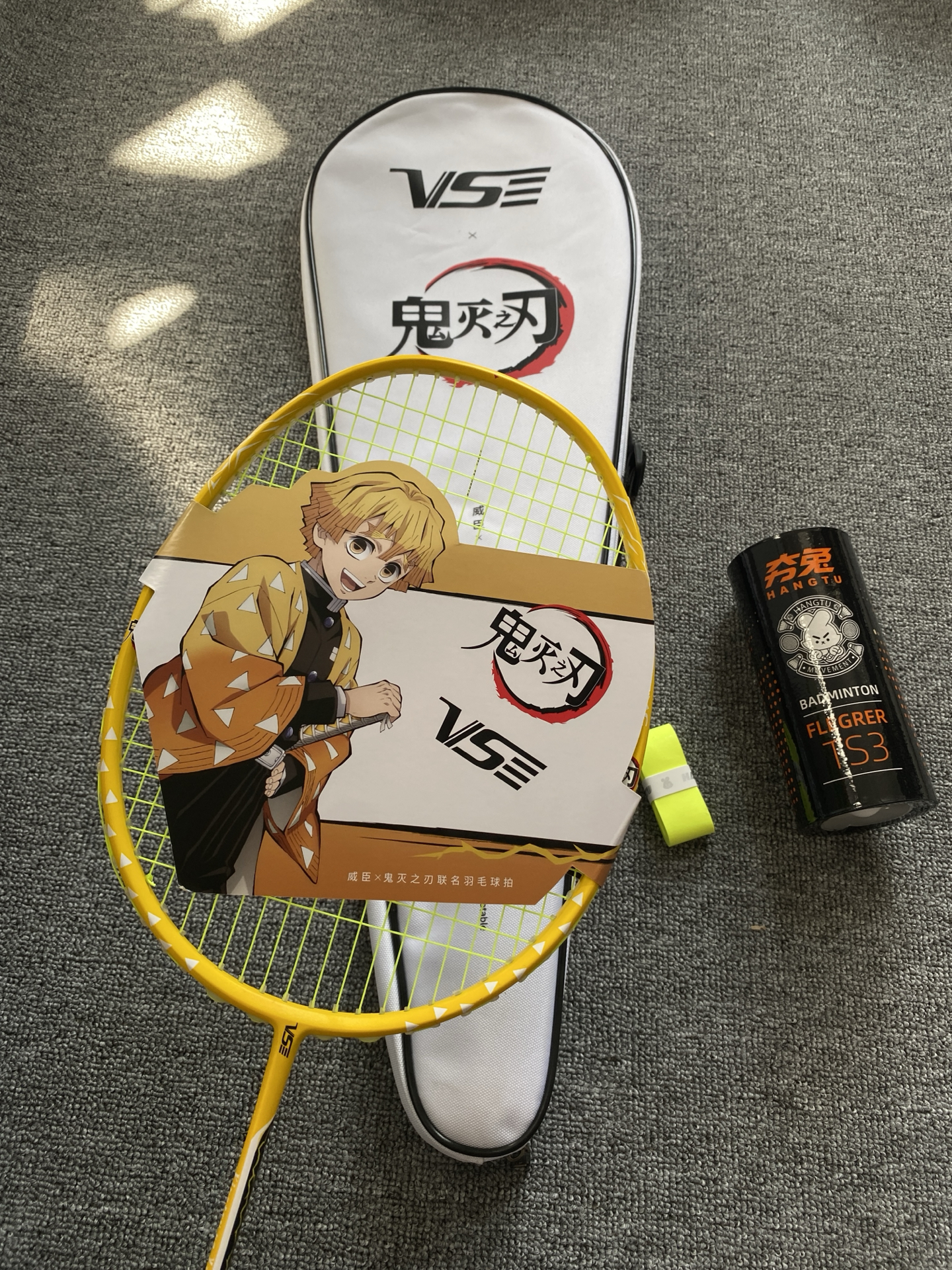 我发现鬼灭联名羽毛球拍啦!粉黄配色好亮眼,全碳素才约83g,挥着轻还稳~不过穿线磅数≤30磅,专业选手可能觉得上限低😅 我这种追番又爱打球的,室内外玩都很搭呀🎾