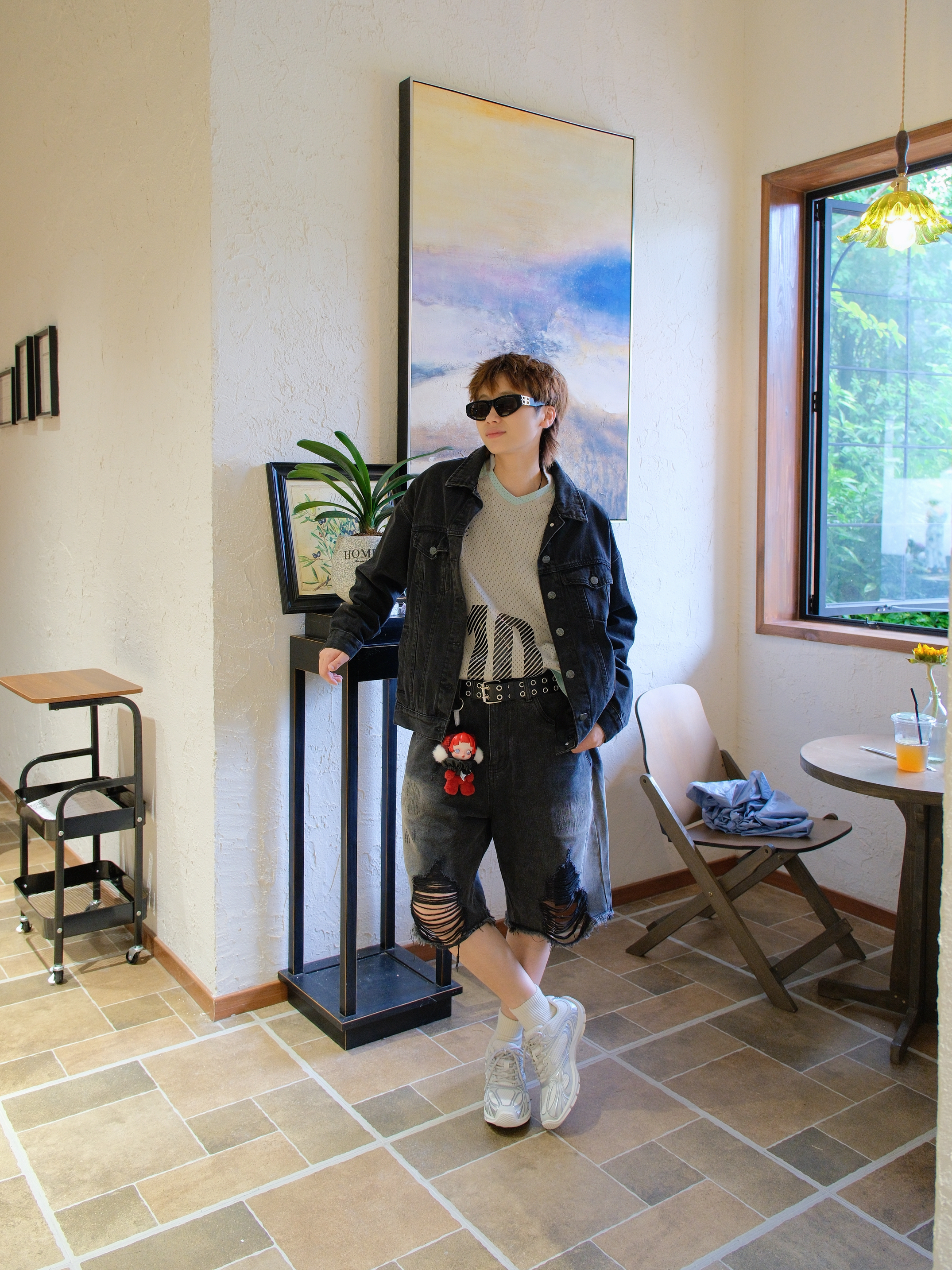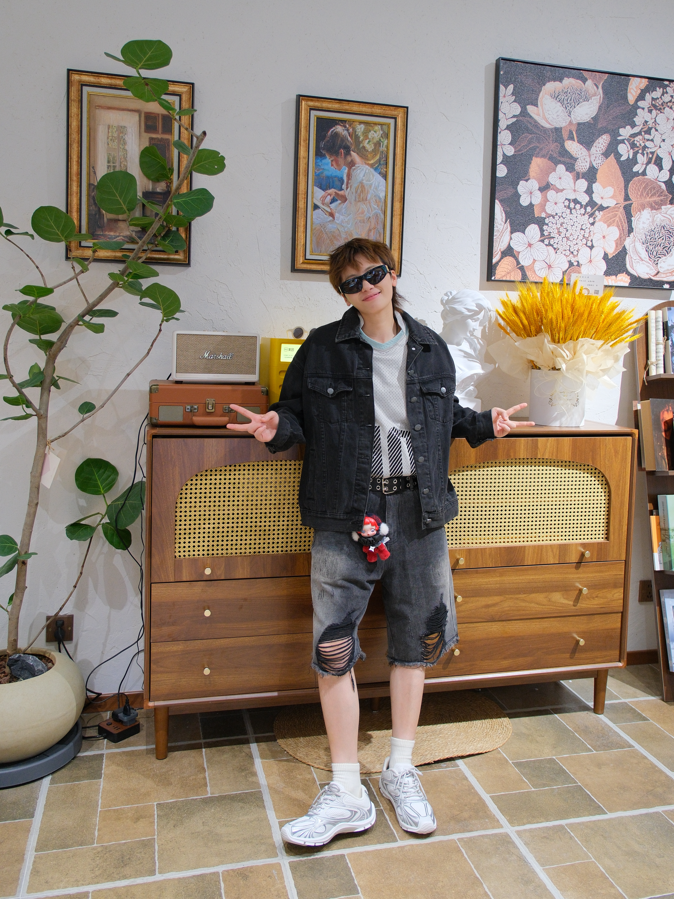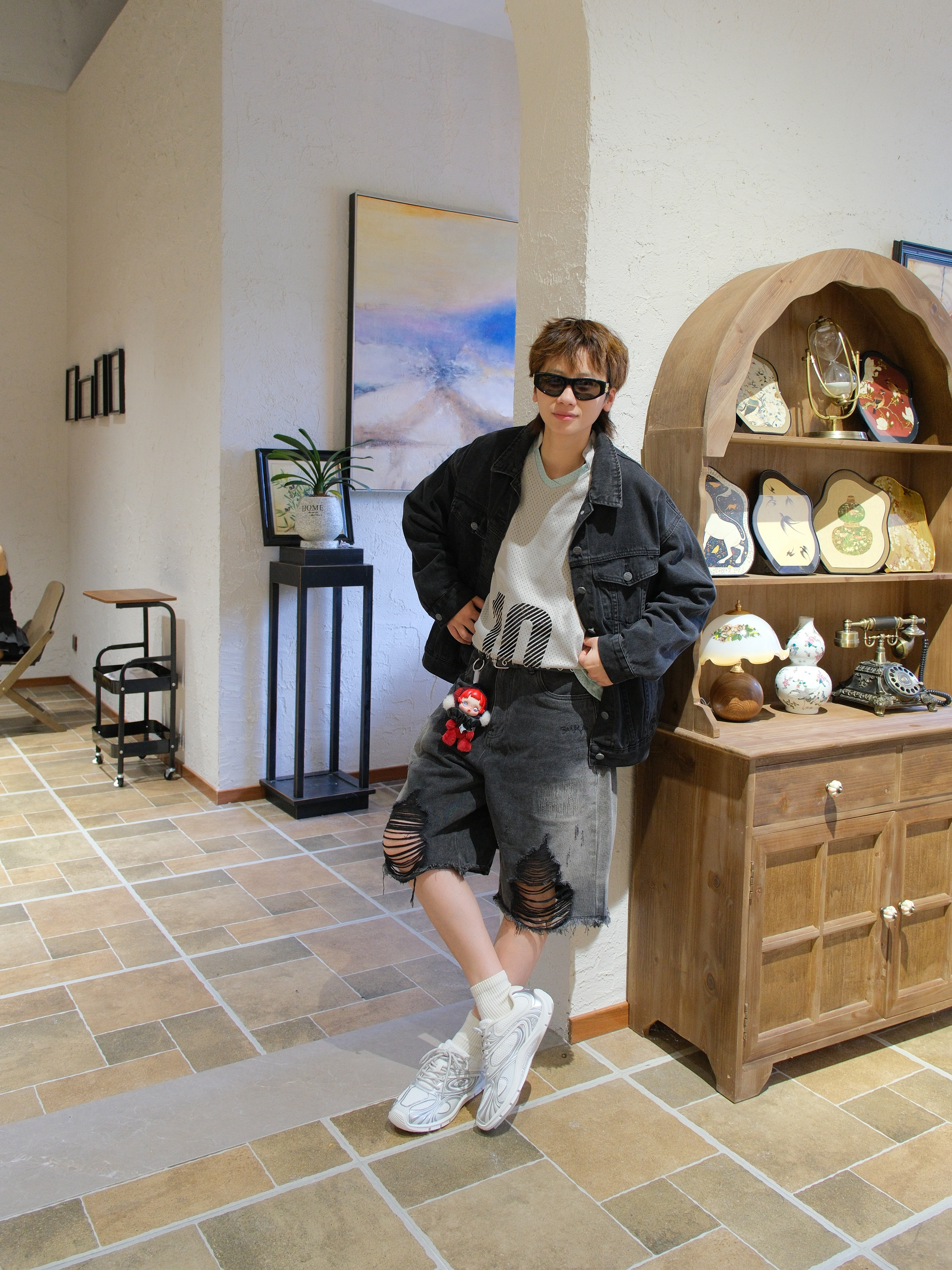鹿晗最近的演唱会穿搭火出圈 刷到物料直接被他的审美拿捏🤏🏻 上身选了一件黑色牛仔外套 内搭灰绿色速干衣 (没有这种徽章蓝牛外套,找了个平替) 下面搭配黑灰色破洞牛仔裤 膝盖处的破洞倒是一模一样 加入黑色腰带和撞色的挂件装饰 可以拉高腰线增加层次感 最后来一双OGR同款德训鞋 白银配色加上机能感鞋身,上脚很吸睛 薄底鞋外观,但是隐形增高3cm左右 满足了小个子星人,既能增高又好看