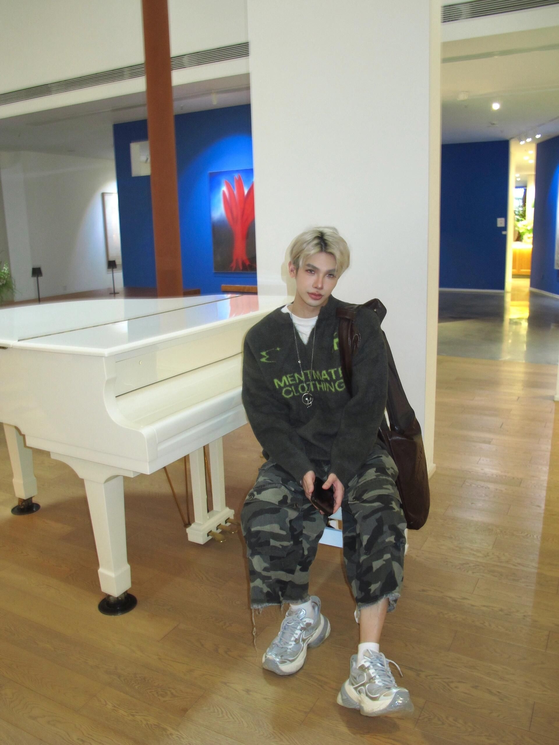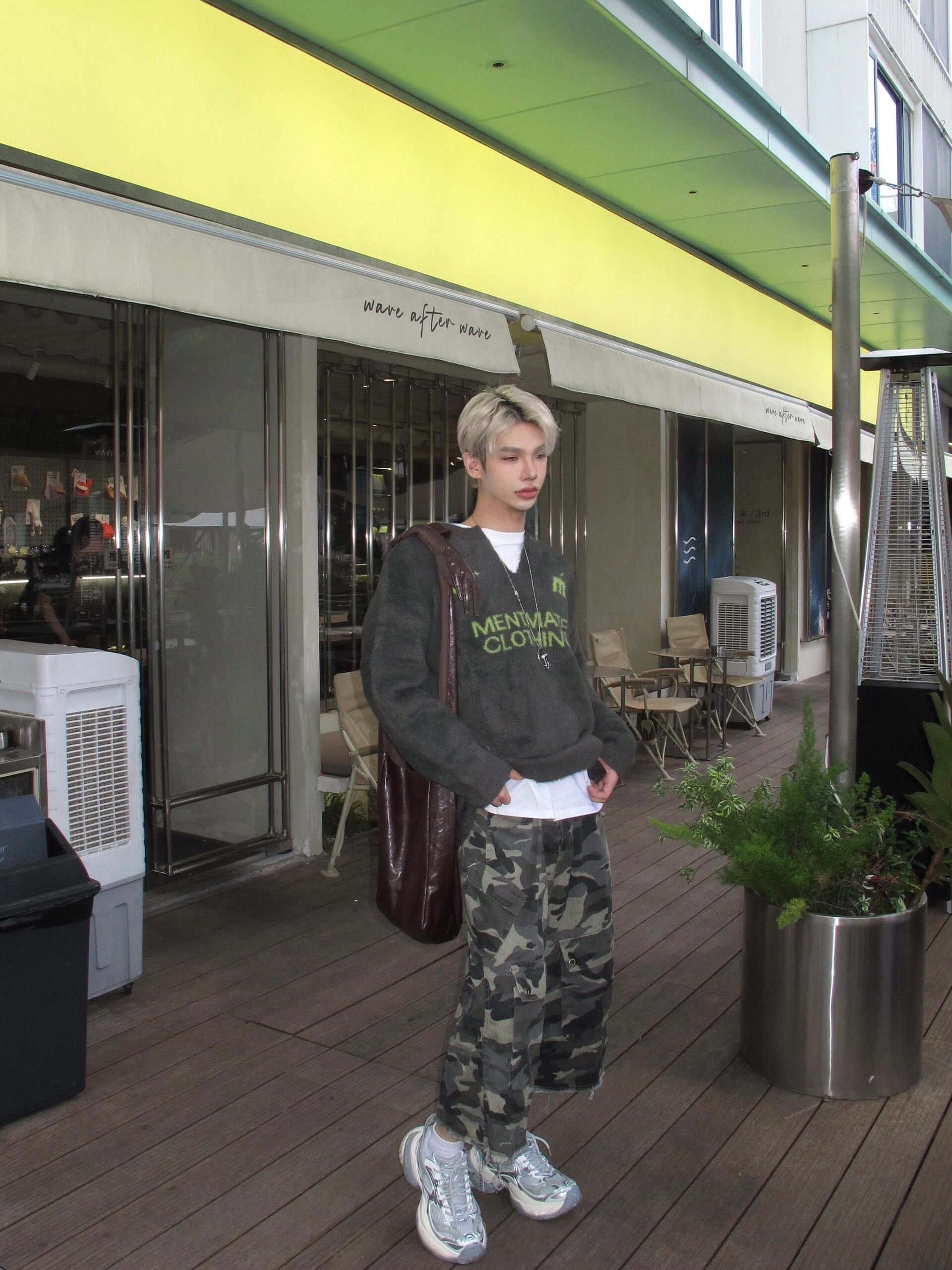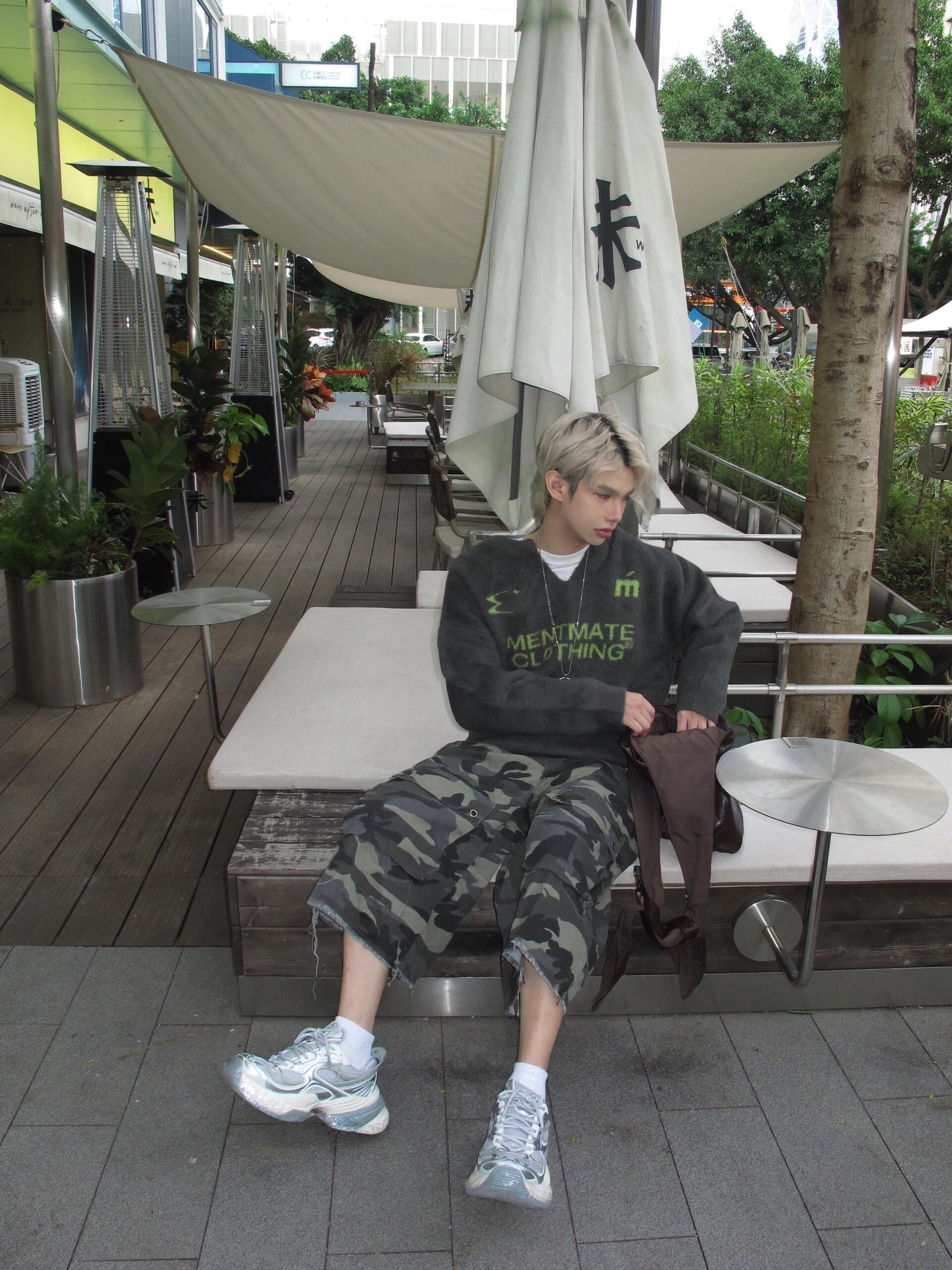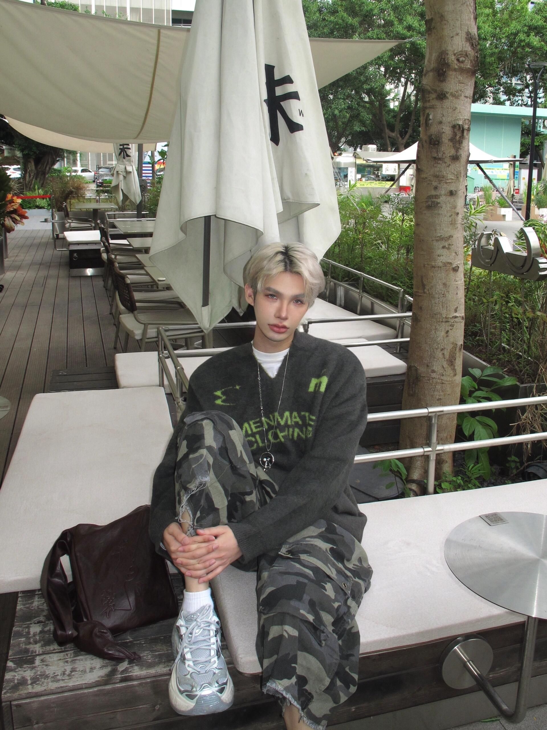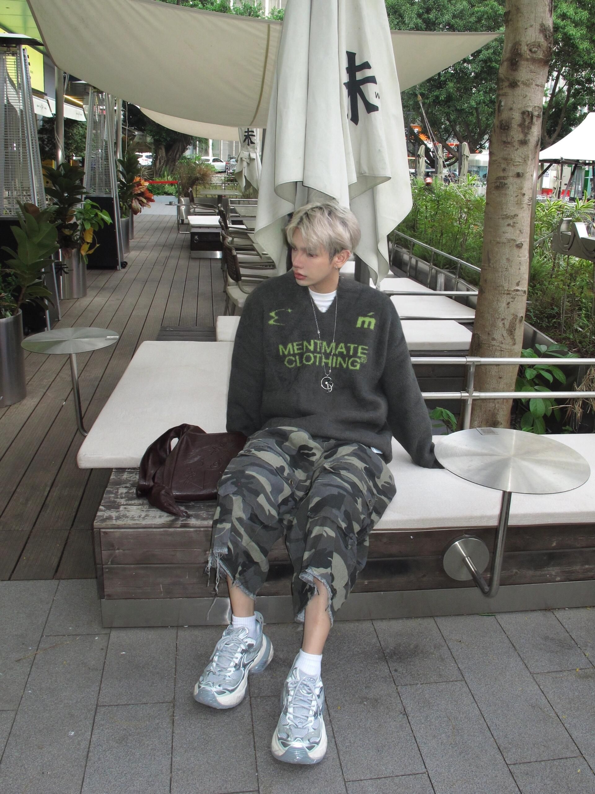 秋冬季节 适合这种比较透气的穿搭 深绿色毛衣+迷彩直筒中裤 藏肉又显比例 配上银色老爹鞋 视觉上拉长腿型 通勤上学 社交都能穿的一套基础look