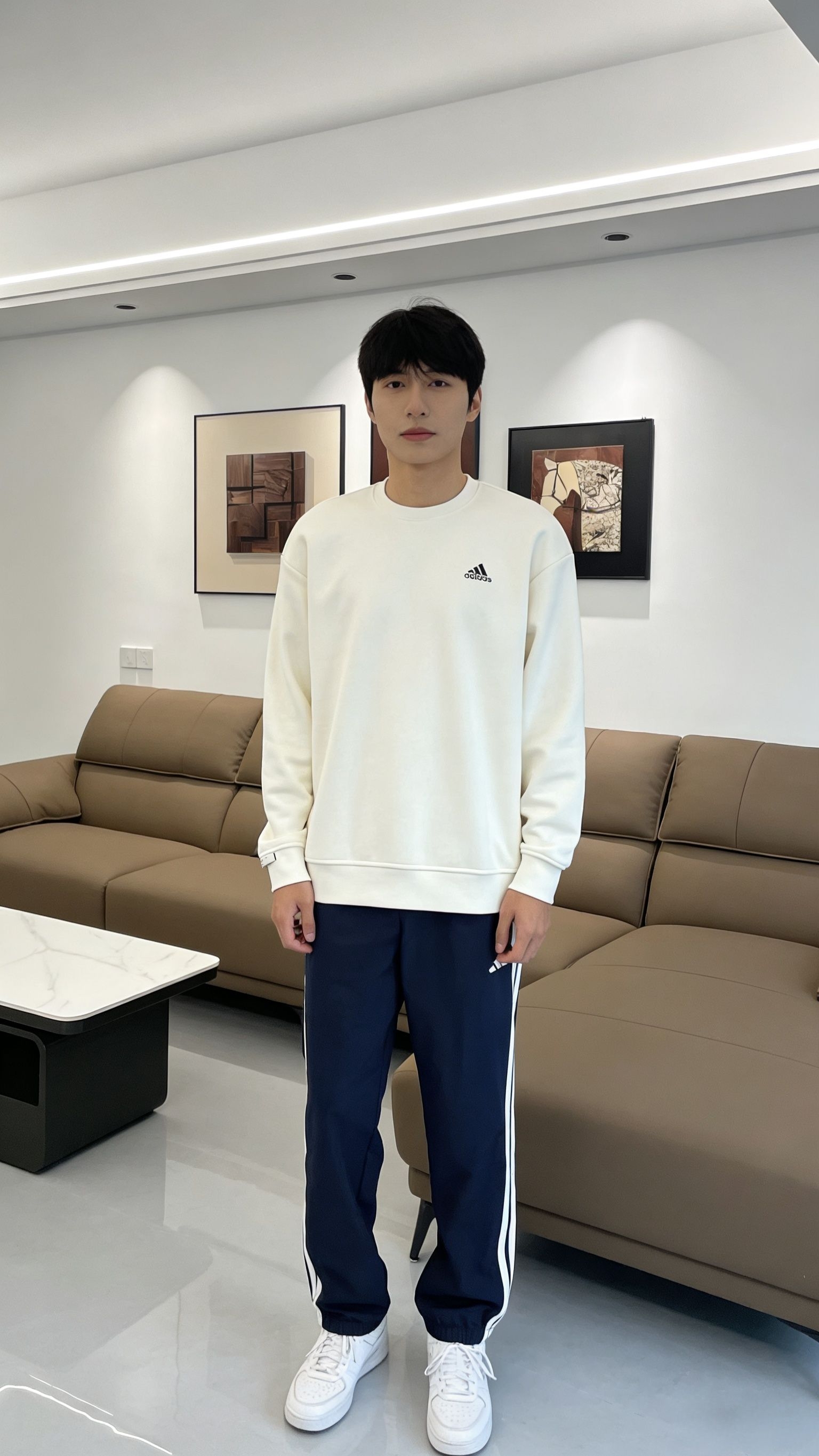 家人们谁懂啊!这款阿迪套装我直接焊身上了💯米白色卫衣软乎乎糯叽叽,贴身穿巨亲肤不闷汗,小logo低调又耐看✨藏青裤子三条杠经典款,垂感绝了还显腿长,面料顺滑不起球!宅家瘫沙发🛋️出门遛弯都合适,码数超正,性价比直接拉满,闭眼冲不亏!