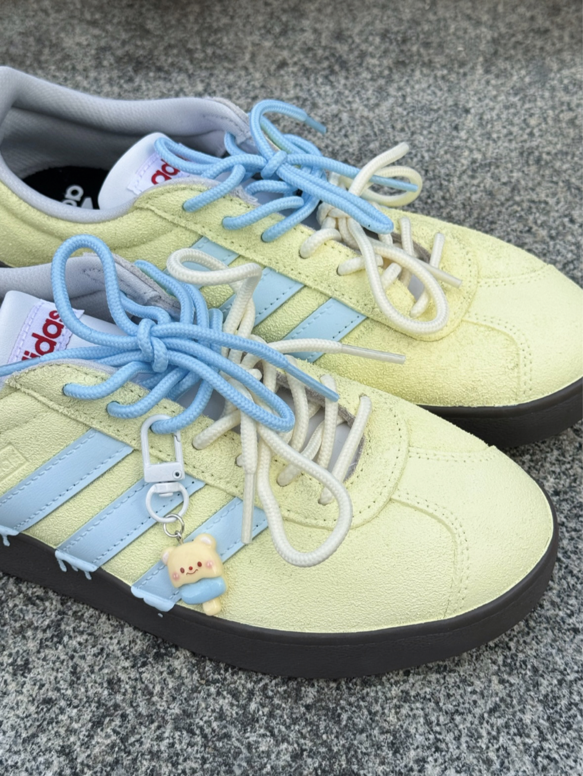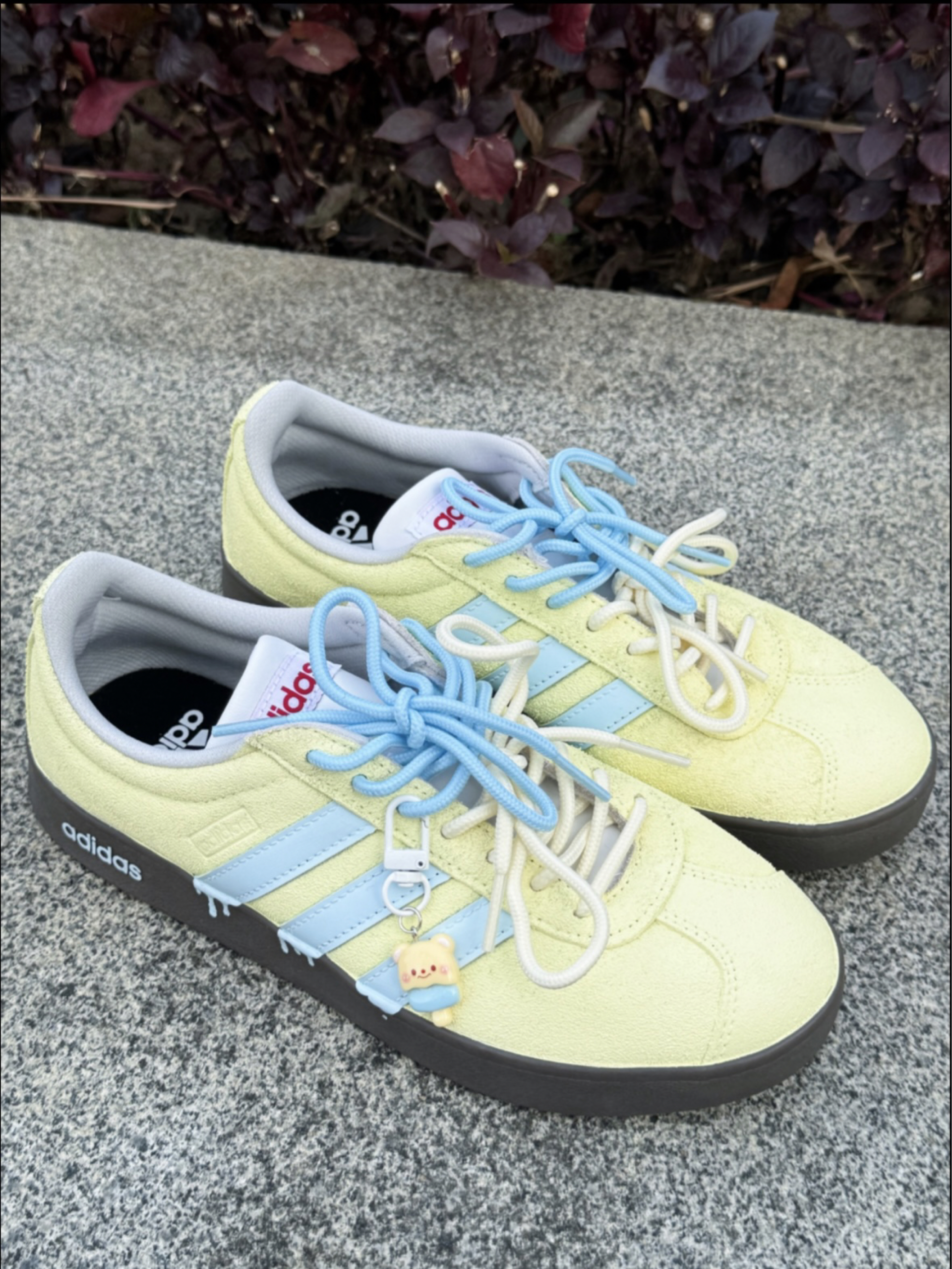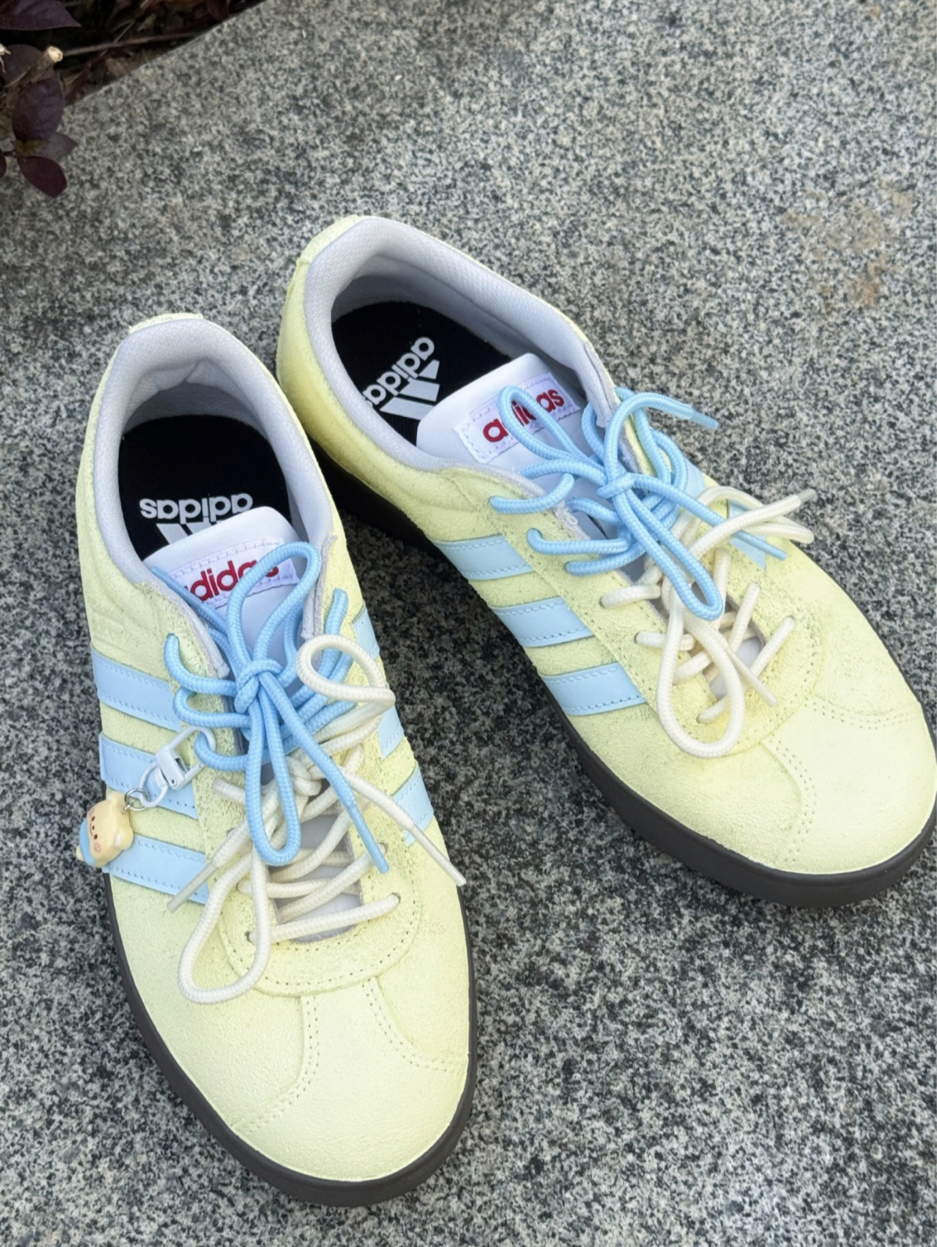 谁懂啊!这双adidas海盐小熊板鞋👟 配色真的软萌又耐看😍 黄蓝配色搭起来清清爽爽的 翻毛皮摸着手感也很舒服~ 芭蕾风+德训的感觉,搭裙子裤子都好看 而且防水还耐磨,上脚走路很轻便透气😎 最近天天穿它出门哈哈哈 (*^▽^*)