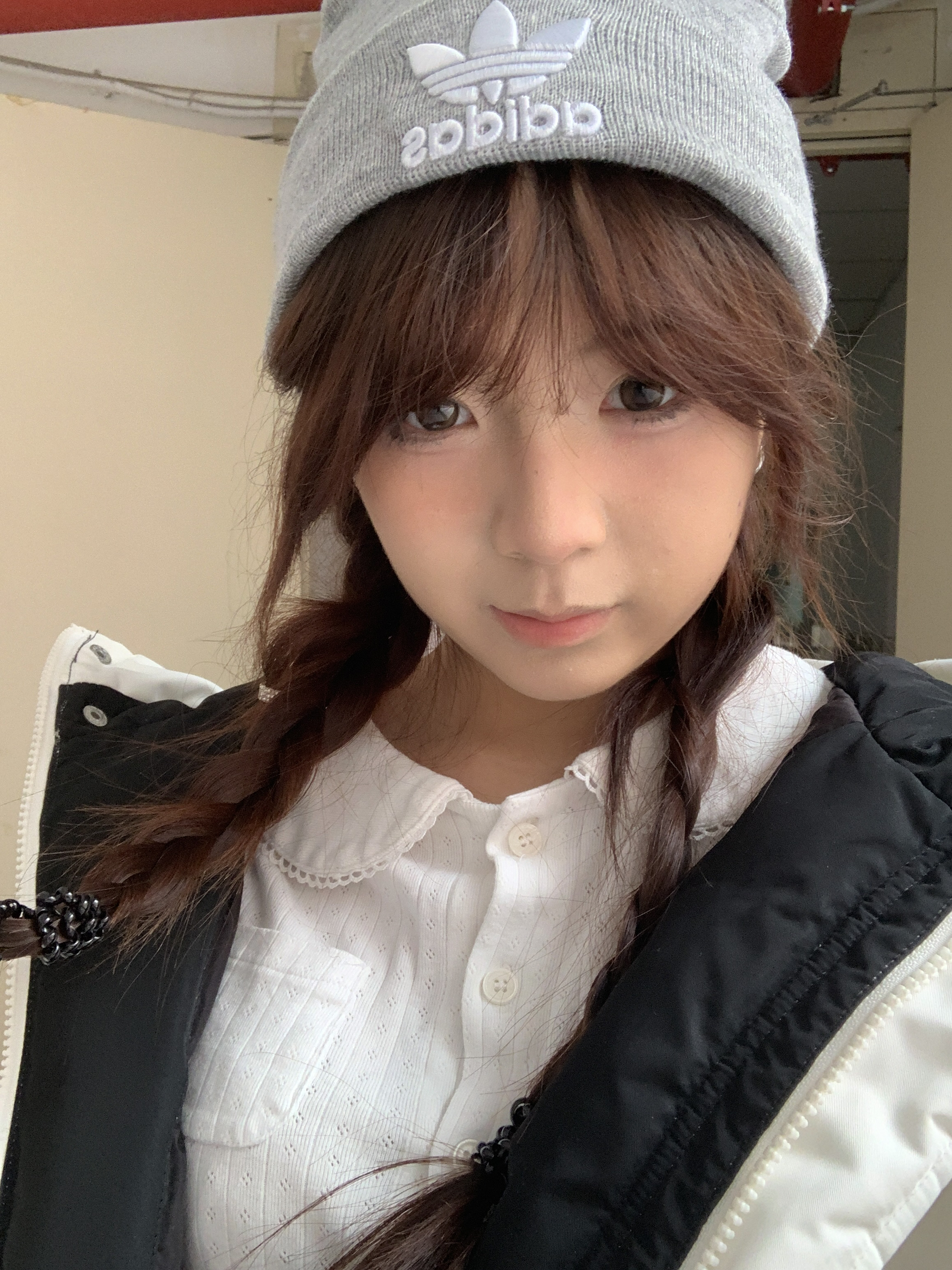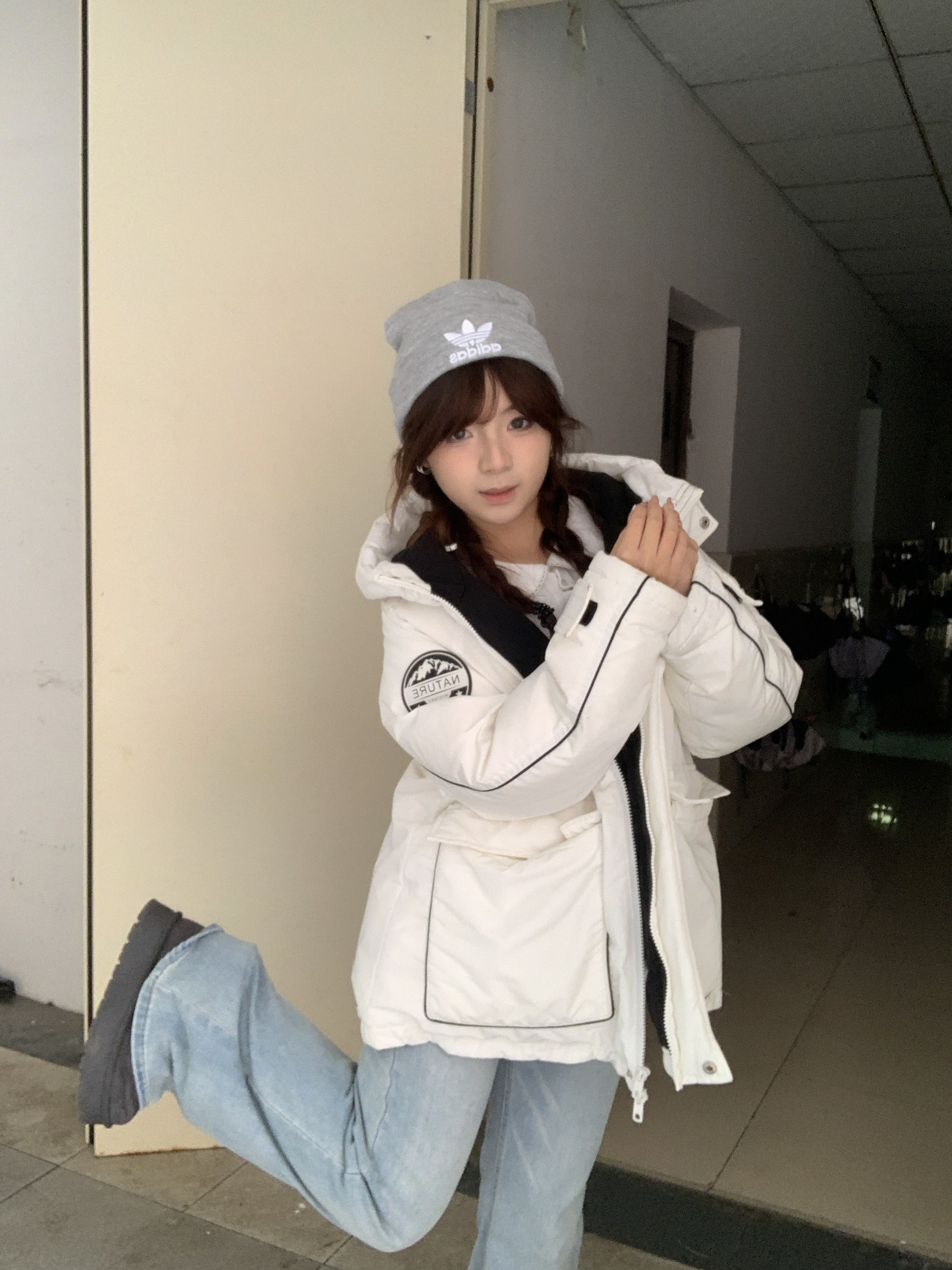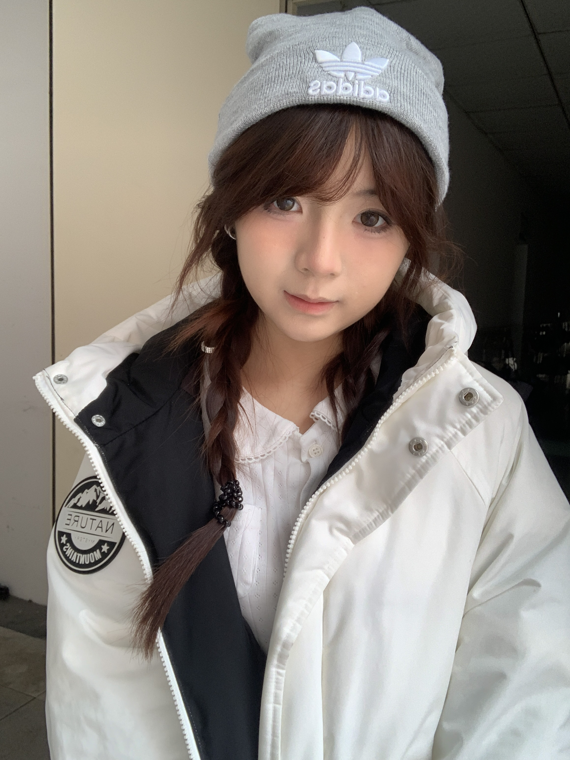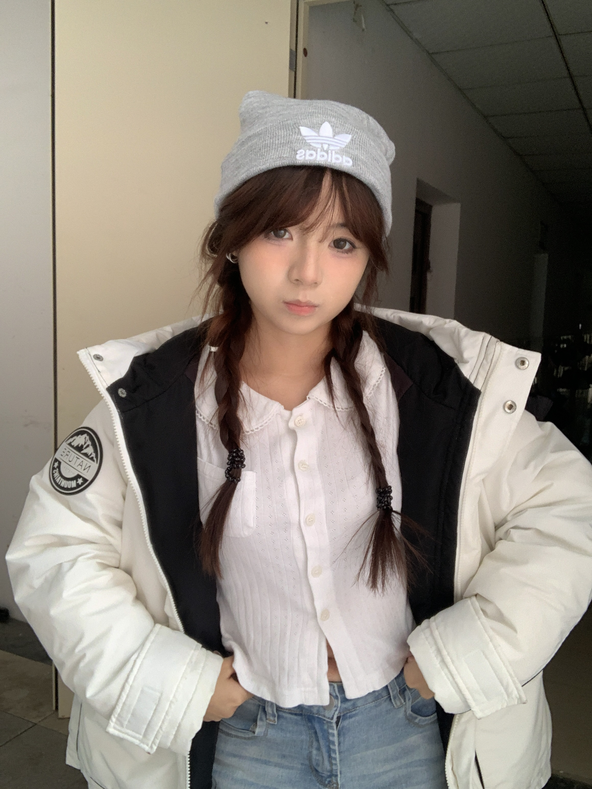 冬日穿搭主打一个温暖又好看~白色羽绒服蓬松又轻便,一点不臃肿,内搭白衬衫简约又清爽。配上灰色针织冷帽,甜酷感直接拉满,双麻花辫的造型还添了几分软萌,随手拍都很出片,冬日休闲风这么穿准没错~