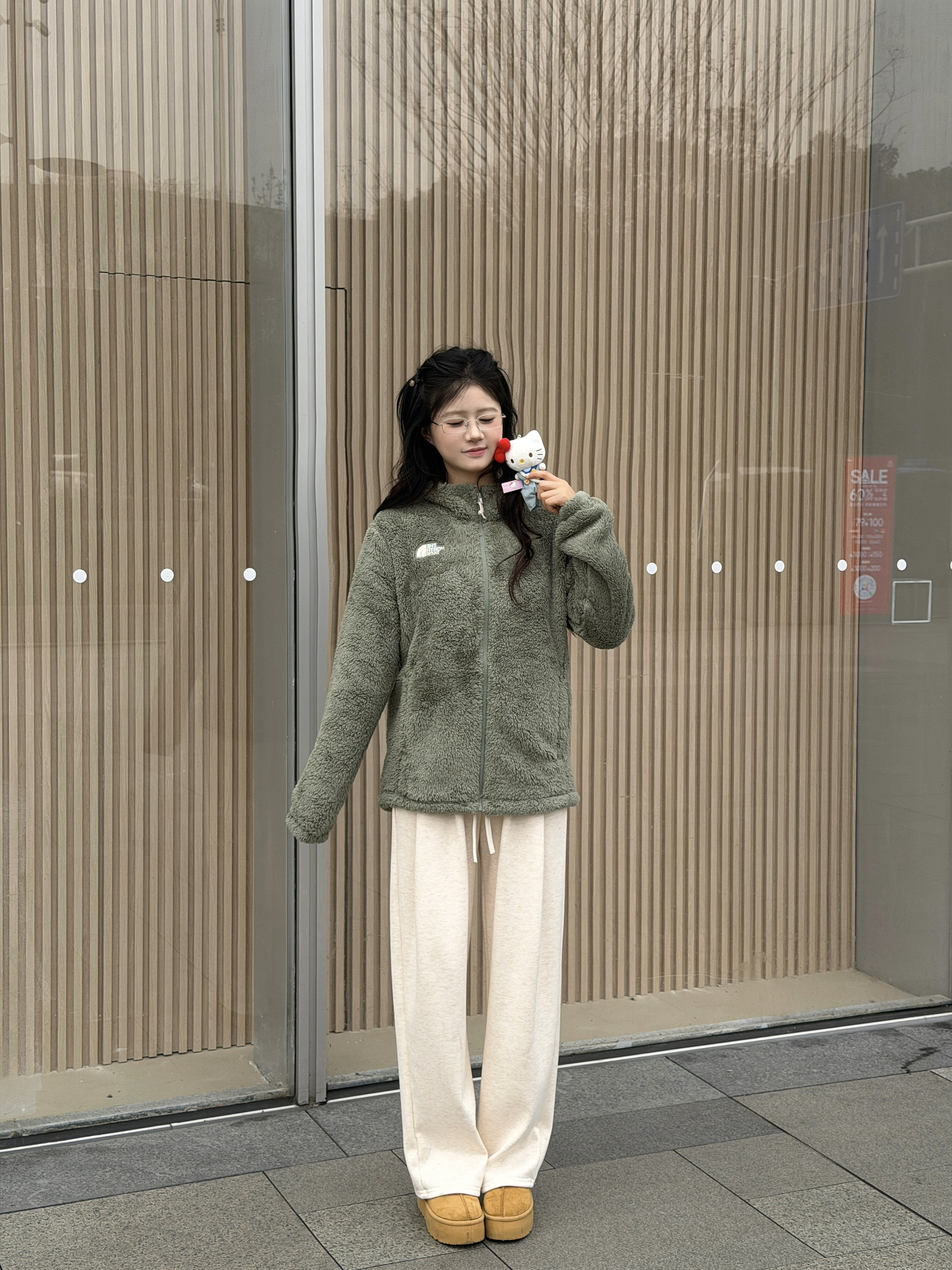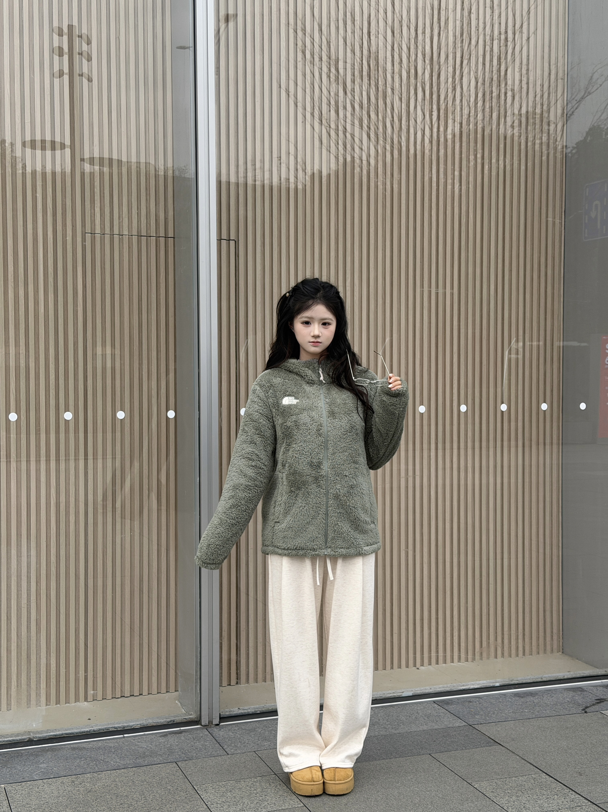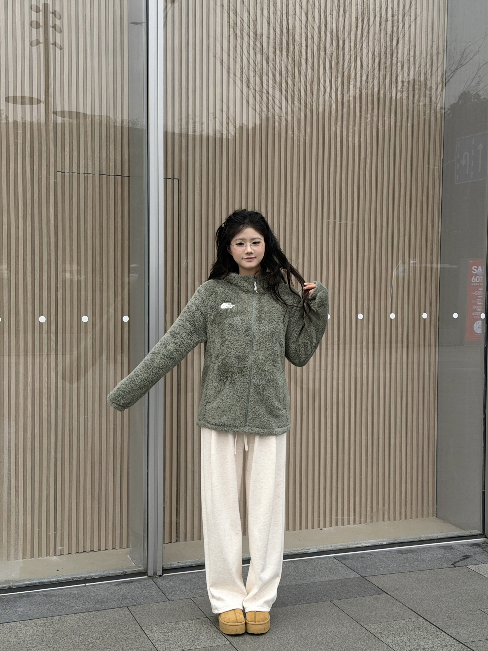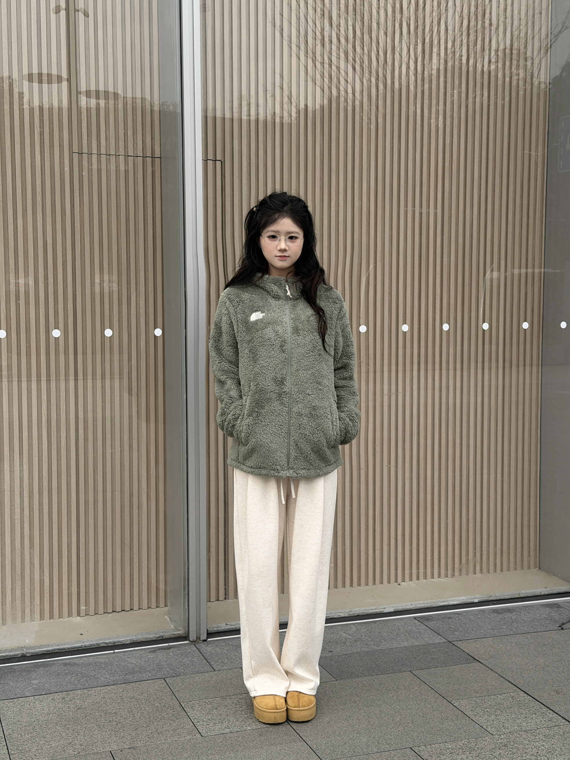 今年的第一件羊羔绒就选这件啦!谁懂啊!这件羊羔毛外套也太韩了吧,橄榄绿色颜色炒鸡显白!毛茸茸好可爱匈冬天与羊羔毛的适配度拉满,侧面也不显臃肿,下身可以搭配浅色系长裤,今天我还加上了厚底雪地靴