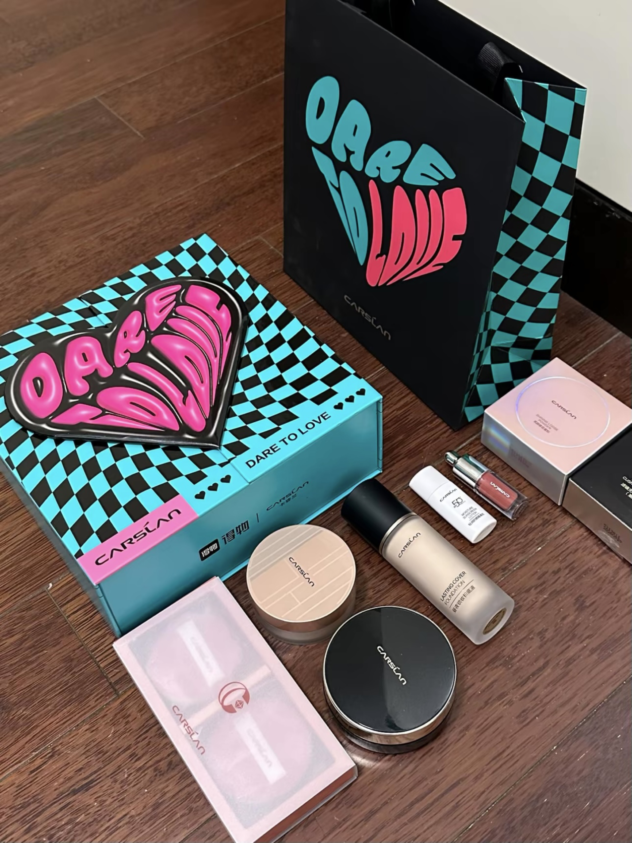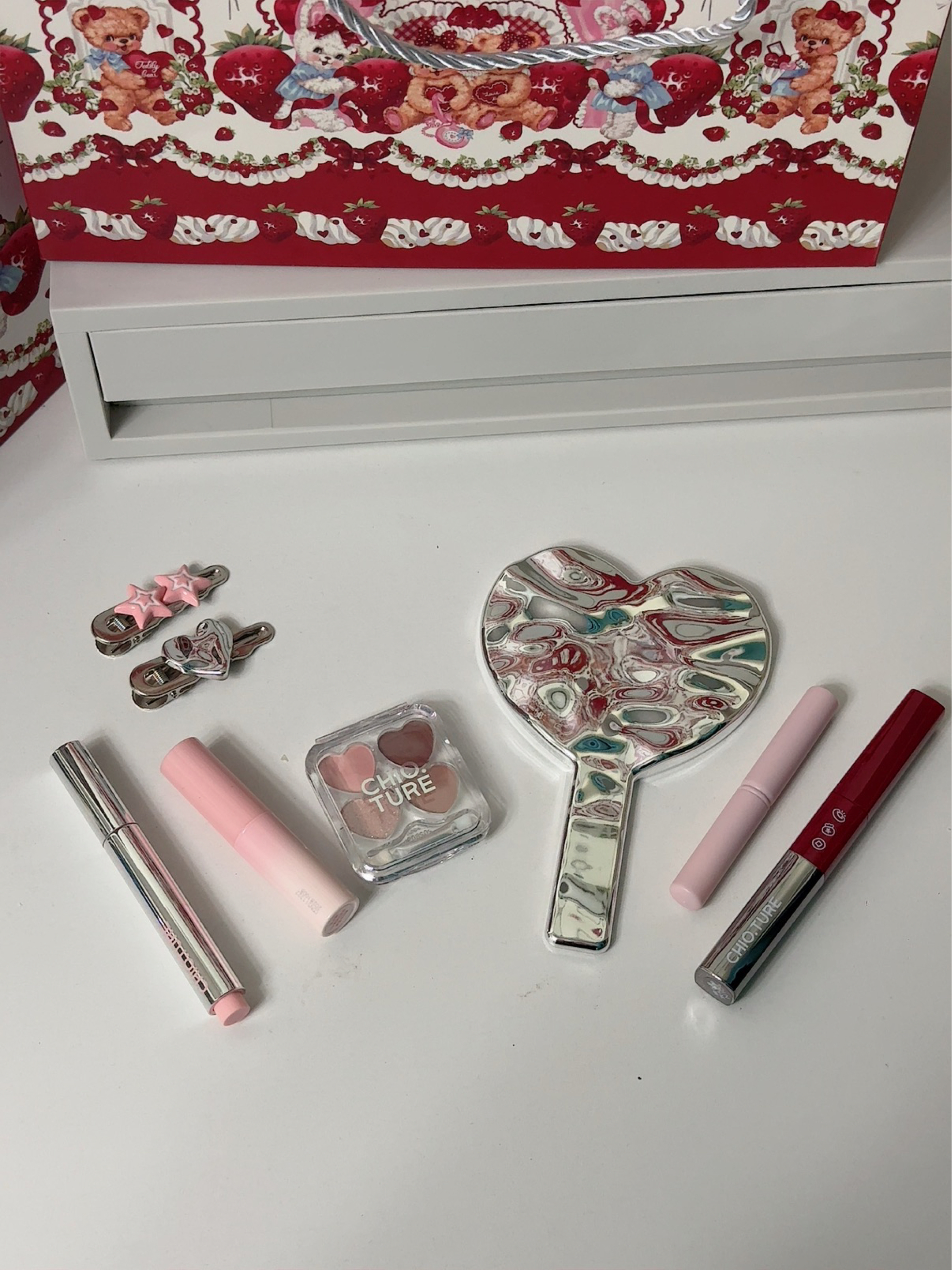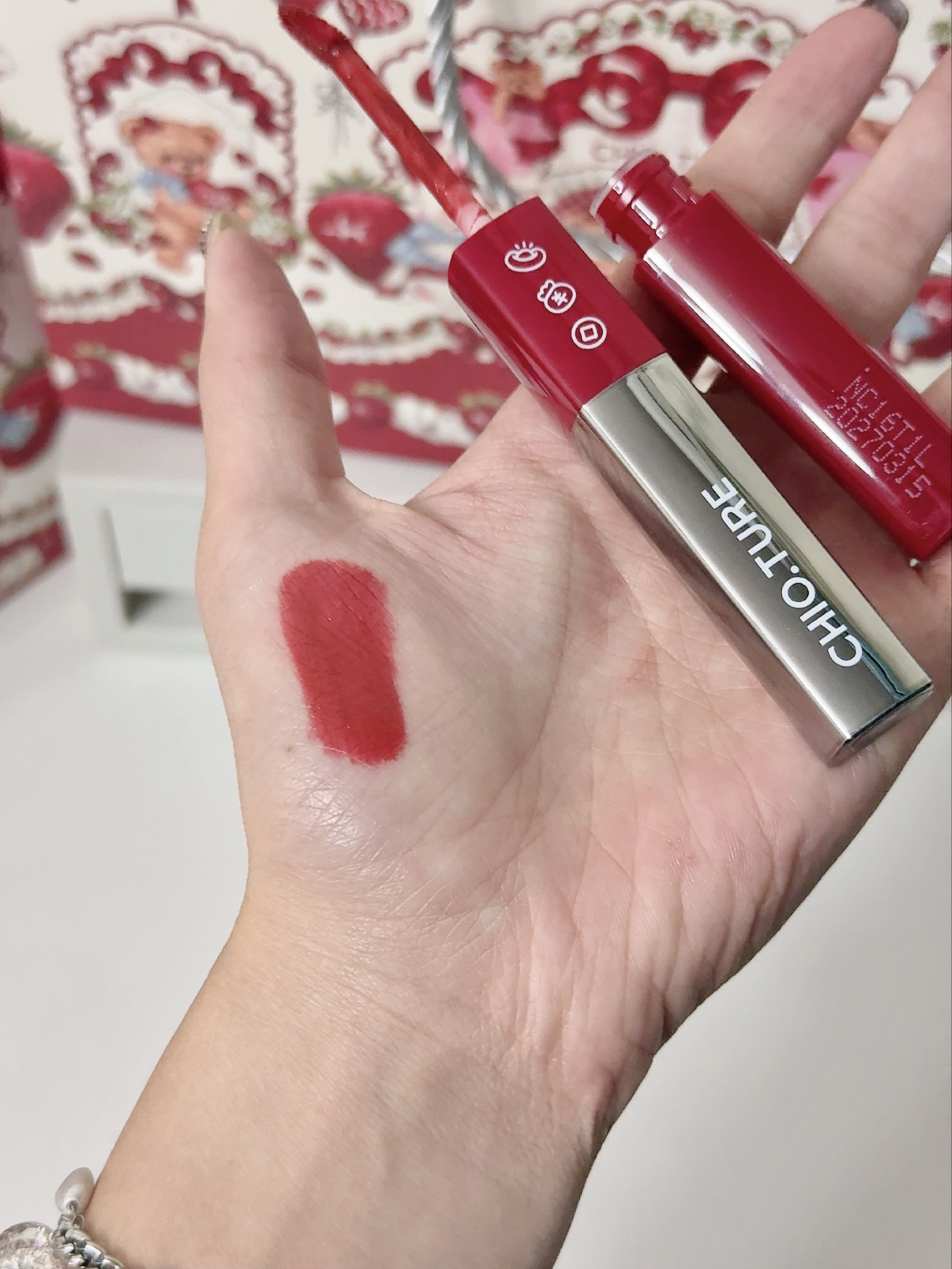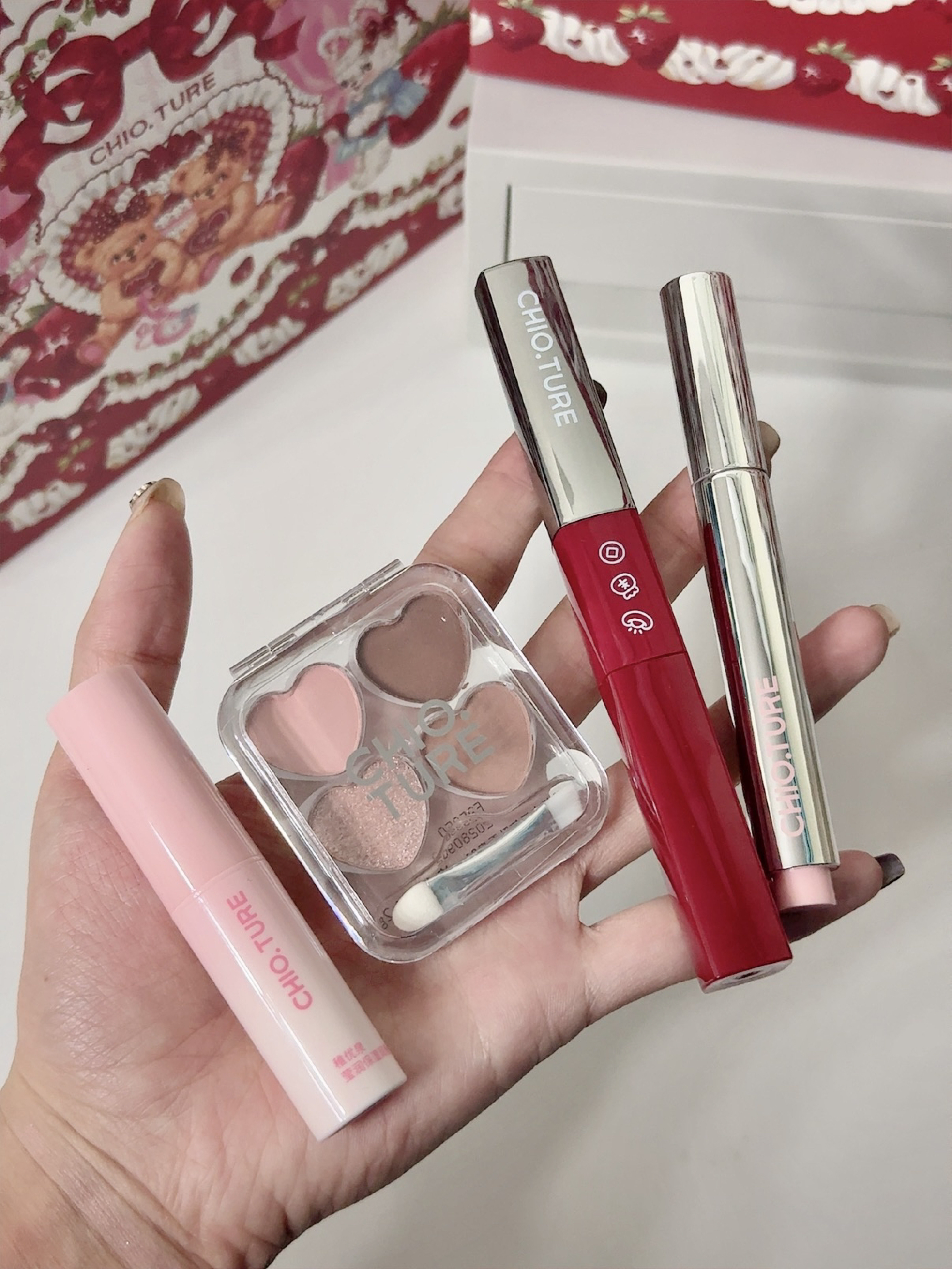 真是不得不说稚优泉你小子好会呀 光看这个盒子就有满满的新年仪式感啦 还有礼袋 红红的很适合送人❤️ 里面有固体唇蜜+罐罐唇泥+罐罐腮红泥+七色眼影盘+唇刷+可爱红色对夹+手持镜+围巾+手提包 真的是有点多的数不过来🤔🤔 都是那种粉粉嫩嫩的很日常的颜色 无论是黄黑皮还是新手都可以轻松驾驭 想要小预算又显贵的可以选它