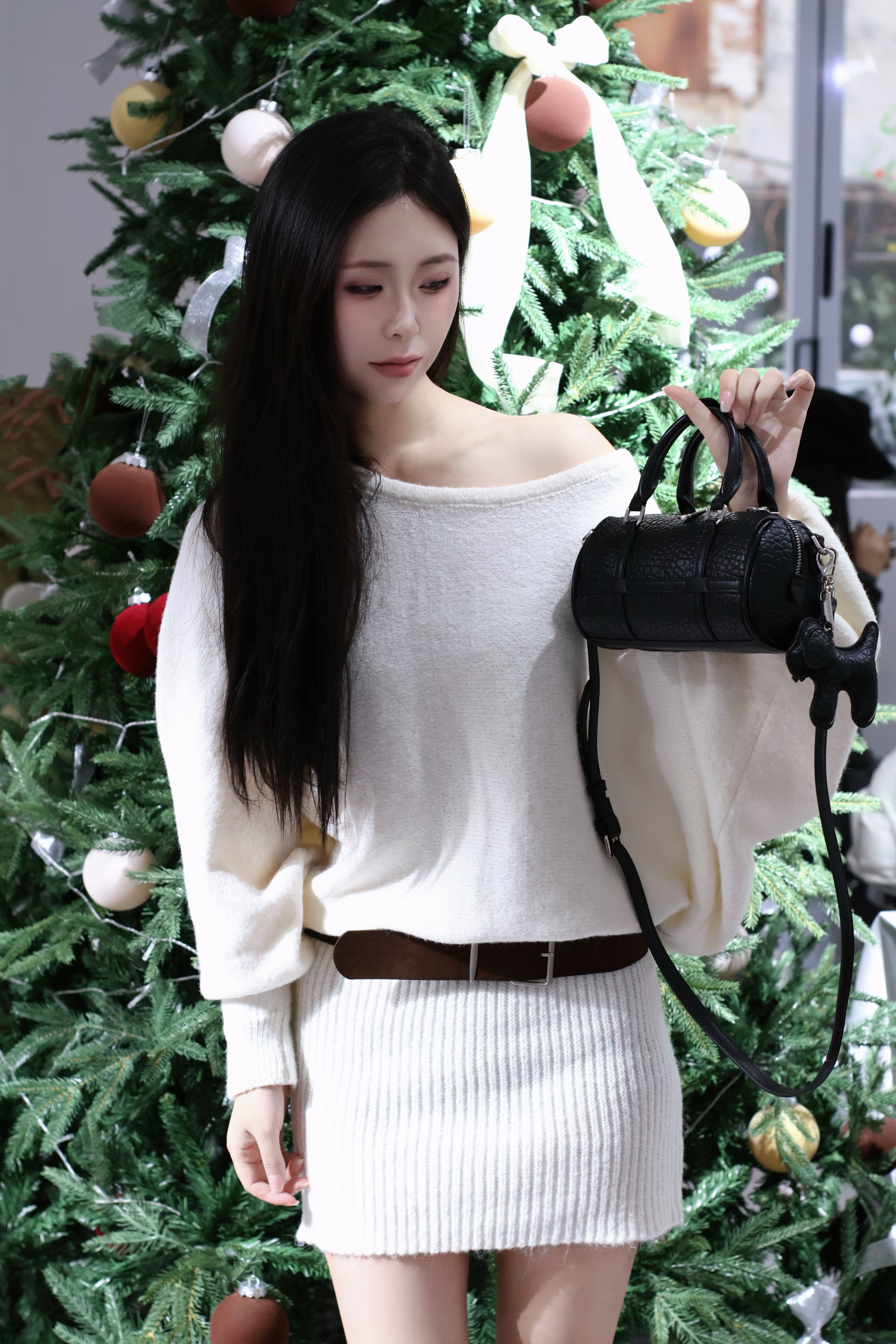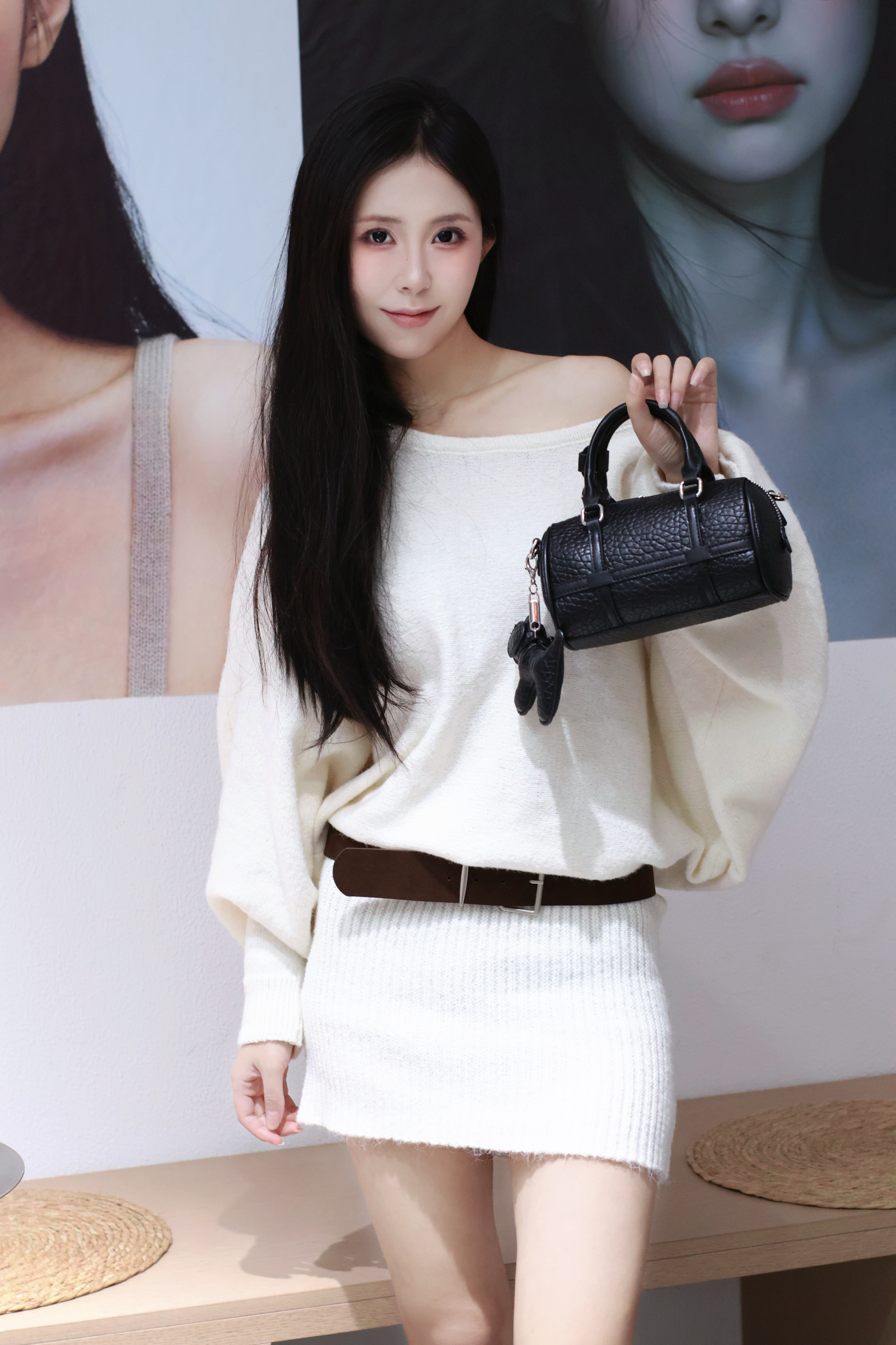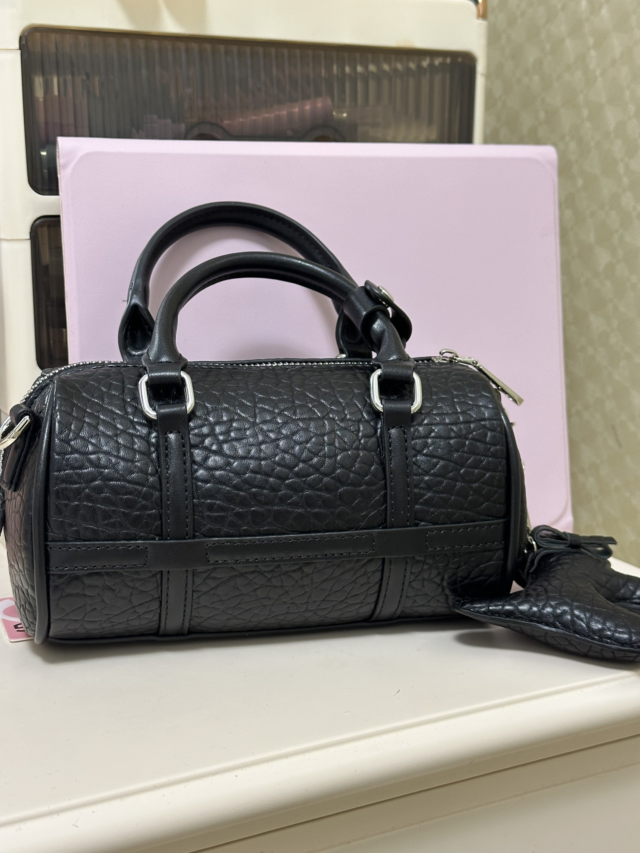 新入的黑色圆筒包真的戳中我! 鳄鱼纹皮质摸起来超有质感,迷你尺寸装下口红、钥匙这些小物件刚好,手提斜挎都好看。#甜妹美女孩宝藏包包分享 搭配白色露肩毛衣,甜酷感直接拉满,细节处的挂饰还能拆,小众不撞款~