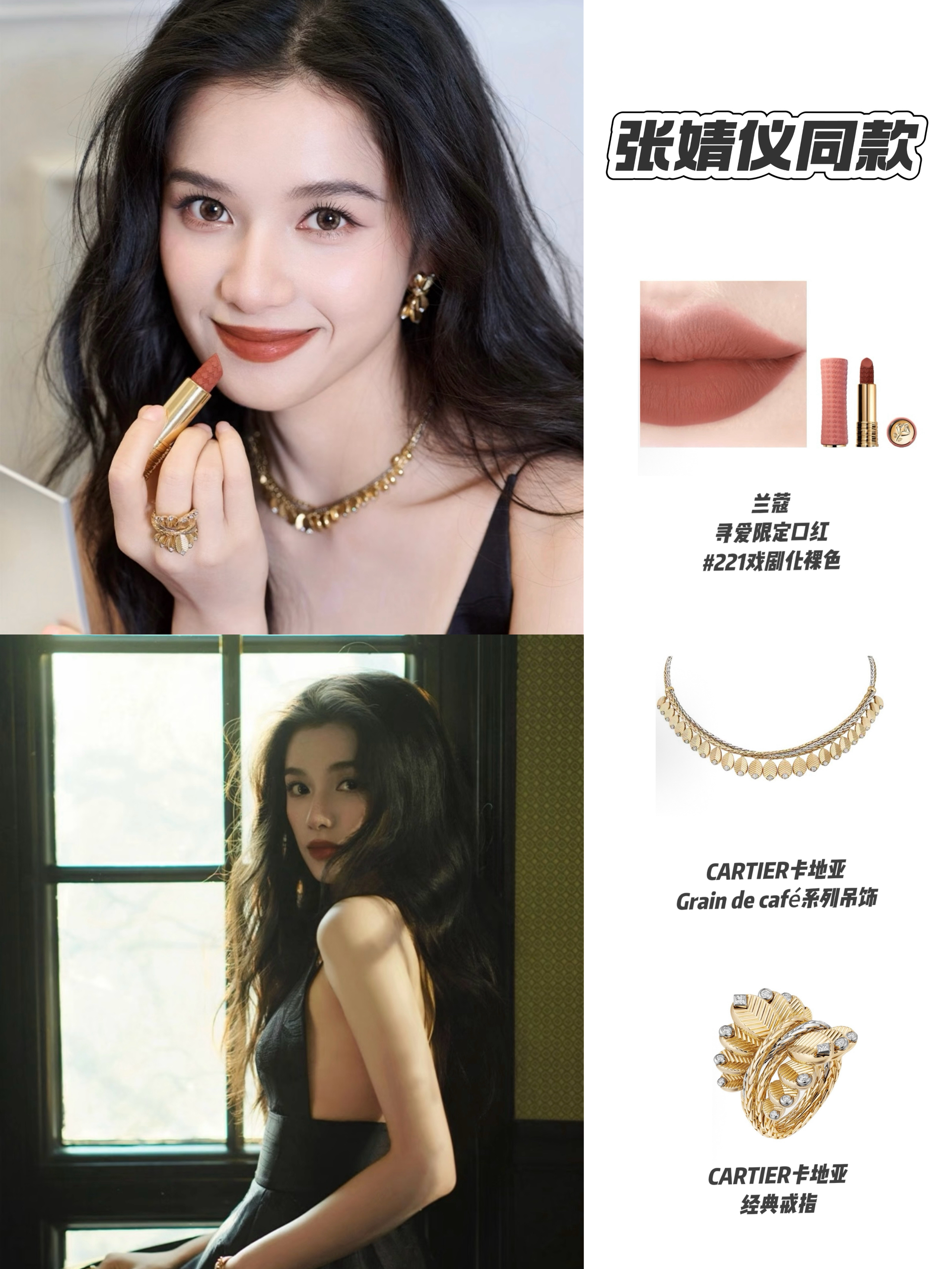 张婧仪这套穿搭是秋冬氛围感的“显贵模板”💰 黑色吊带裙衬出优雅,卡地亚金饰添了贵气质感。 核心亮点是兰蔻221口红 ——秋冬适配的暖调裸棕,上唇是雾面柔焦感,既衬得肤色更透亮显白,又和金饰的复古感完美呼应,是秋冬妆容里“显贵又提气”的点睛之笔