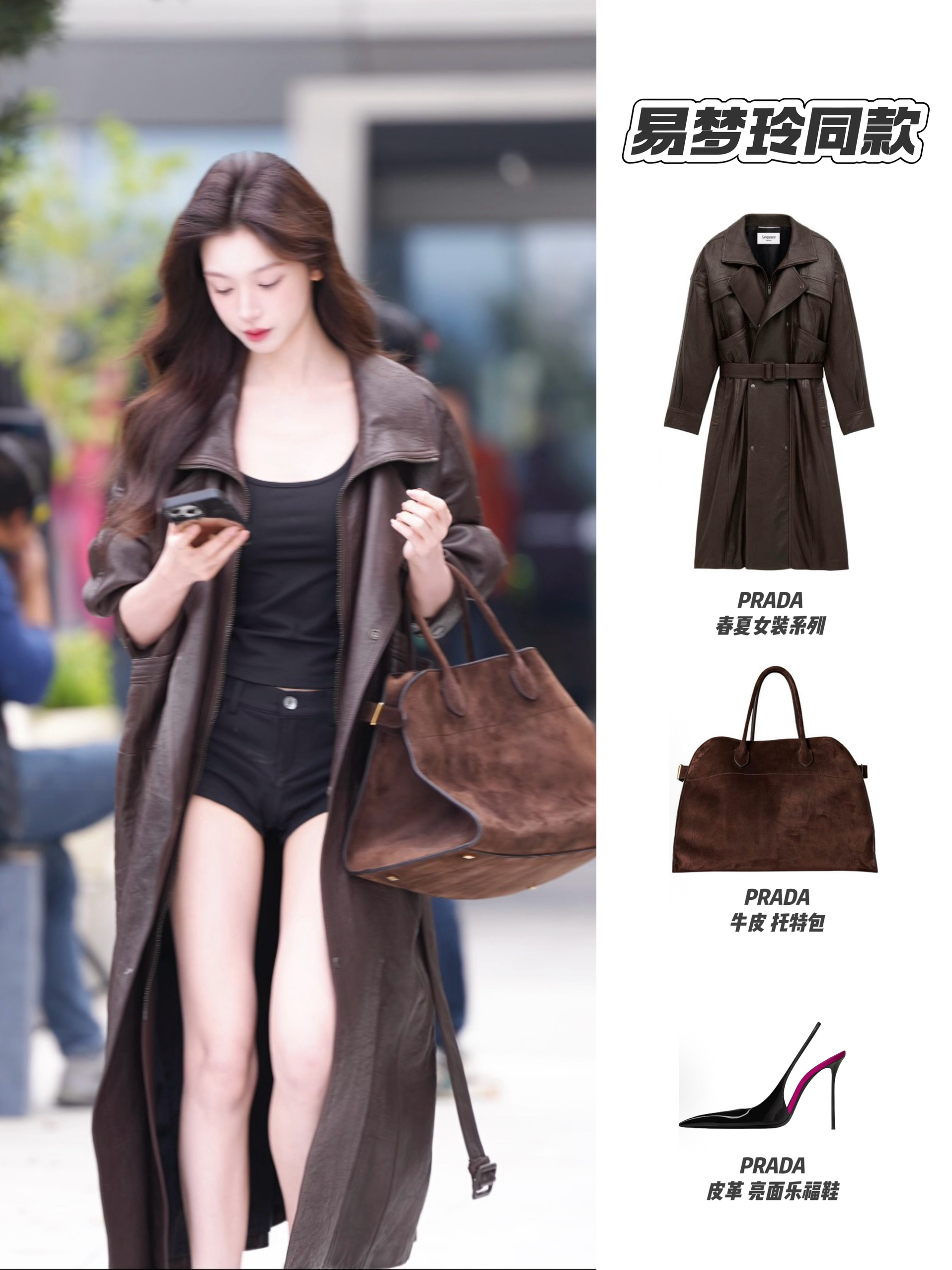 易梦玲今日进组路透,一身美拉德色系慵懒又迷人😻 深棕皮衣长风衣裹出慵懒气场,内搭黑背心短裤平衡厚重感。 THE ROW这只棕托特特别适合通勤——暖棕绒面适配秋冬氛围,软质包型和皮衣的随性质感呼应,大容量能装下秋冬随身物品,实用又撑得起整套穿搭的低调贵气,是秋冬通勤的质感利器。