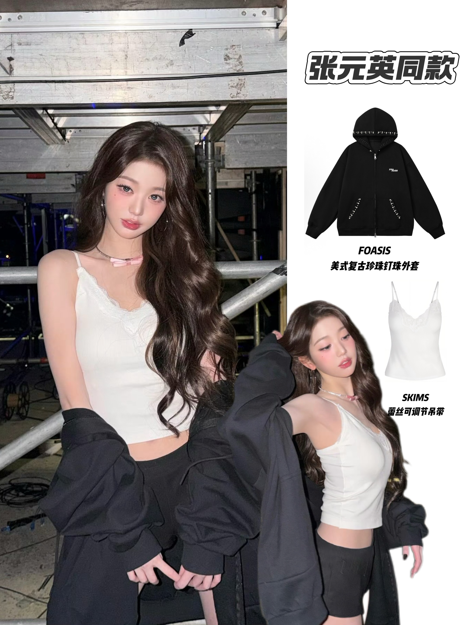 张元英演唱会这件内搭SKIMS蕾丝吊带太加分! 紧身版型衬出线条,蕾丝边又添柔美感,白色自带清透氛围,和黑色外套形成“甜×酷”对冲,松弛又性感,随便搭件外套都能秒出片~