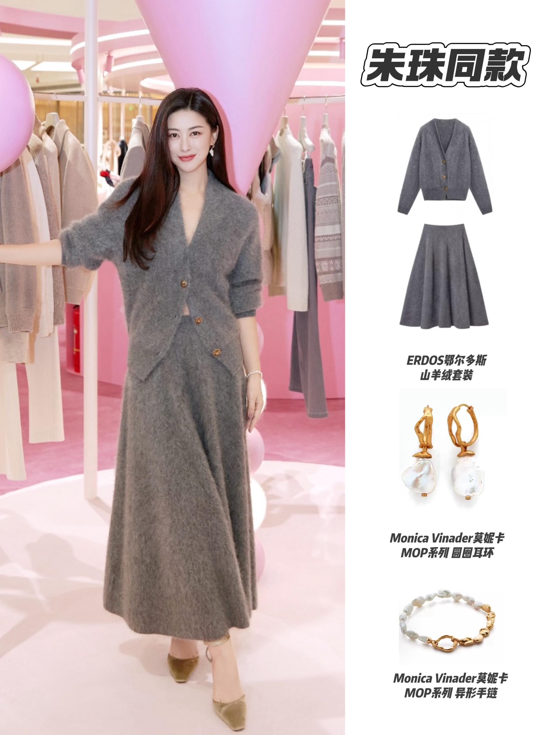 朱珠参加鄂尔多斯活动这套羊绒套装太温柔了😻 灰羊绒套装软乎乎的,短开衫露点腰增加灵动,大裙摆晃起来特松弛。搭配配珍珠首饰和浅棕鞋,温柔里还带点贵气。 秋冬穿这一身,不管上班还是约会,都跟自带柔光似的,舒服又好看!