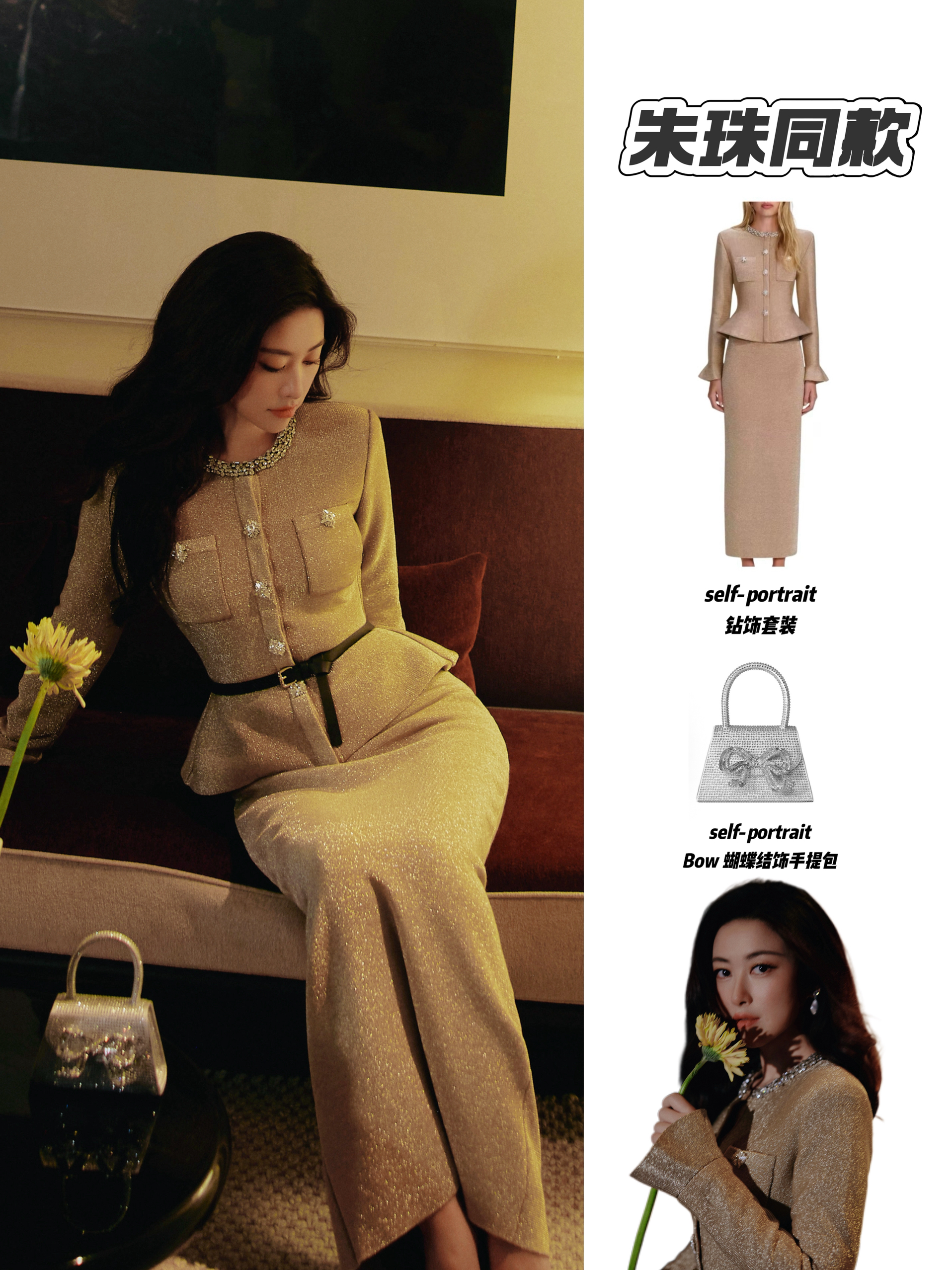 朱珠参加采访的这套穿搭满满的低调奢华感⚜️ 鎏金套装自带精致光泽,收腰+鱼尾摆衬出优雅曲线,钻饰细节和闪钻包呼应,高级感直接拉满。朱珠一穿,像把低调的奢华穿成了日常,贵气又舒展。