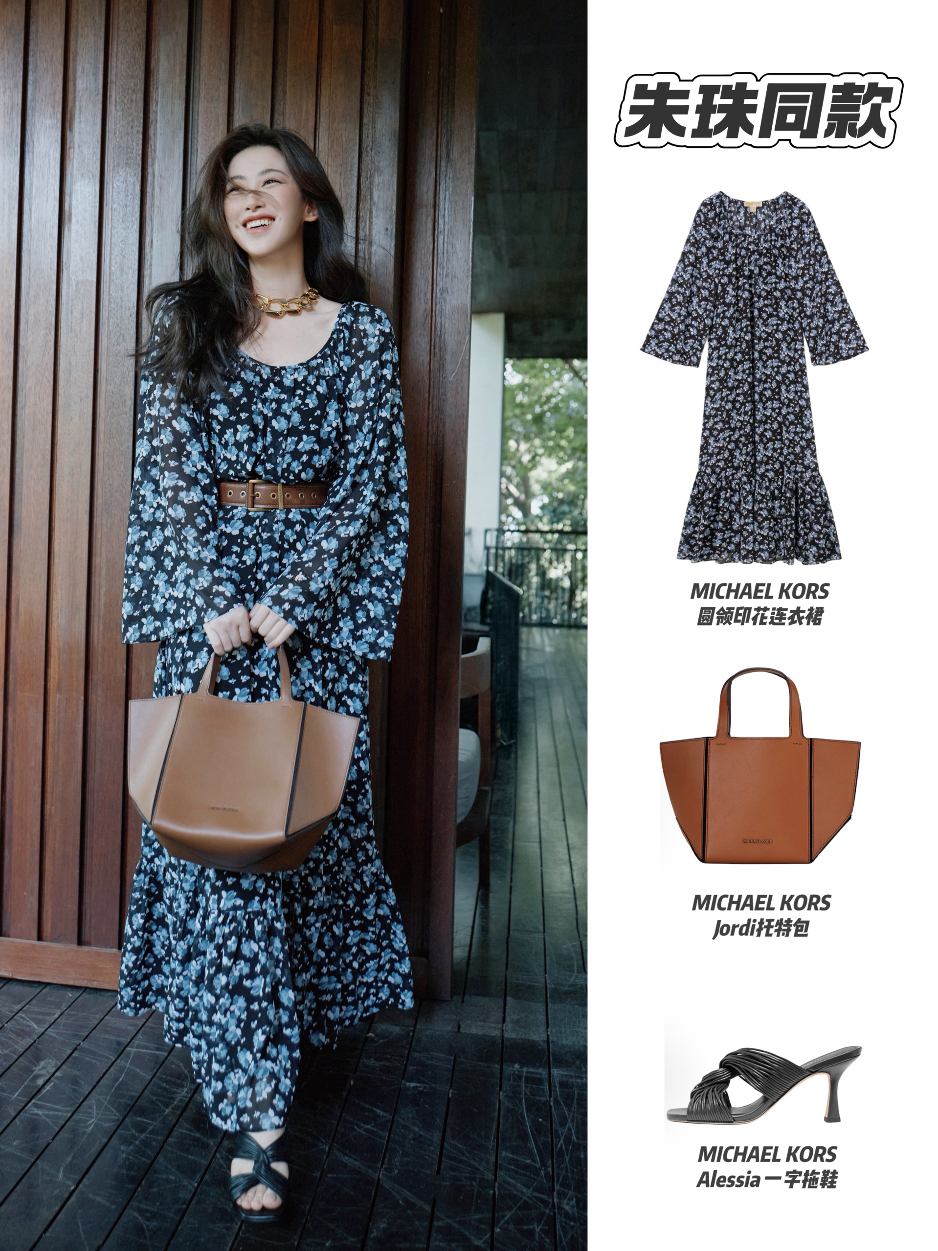 朱珠新剧《他为什么依然单身》正在热播中,姐姐的私服也是可以开穿搭班的程度😻 这套穿搭充满“明媚松弛”感,黑底蓝碎花裙自带温柔氛围,宽袖+大裙摆衬得随性舒展;棕调包包与金链呼应,中和了碎花的柔,让明媚里多了几分慵懒贵气~