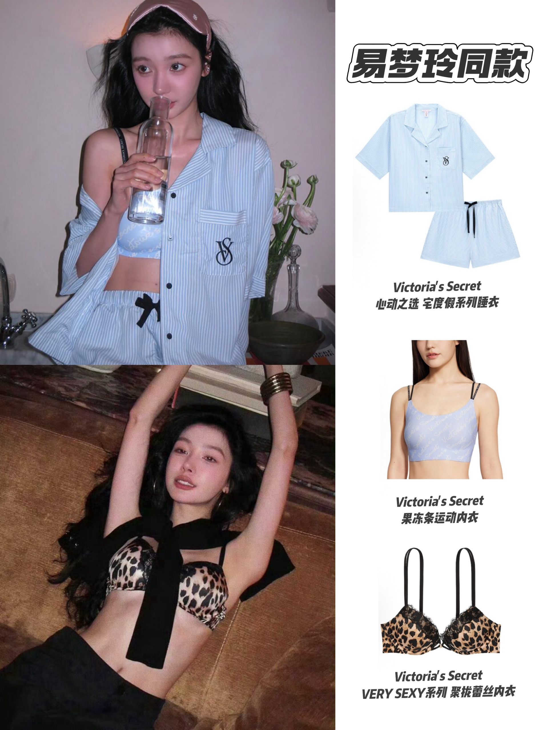 易姐的时尚感即使居家也藏不住 (蓝条纹睡衣+运动内衣):松弛又精致,浅蓝条纹睡衣自带慵懒氛围,搭配同色系运动内衣,露肤度刚好,既舒适又有轻性感,很适合宅家或轻度假的松弛感造型。 (豹纹内衣+黑饰):野性又魅惑,豹纹内衣自带性感张力,搭配黑色装饰增加酷感,慵懒姿势放大了随性妩媚,是很有女人味的辣妹风。