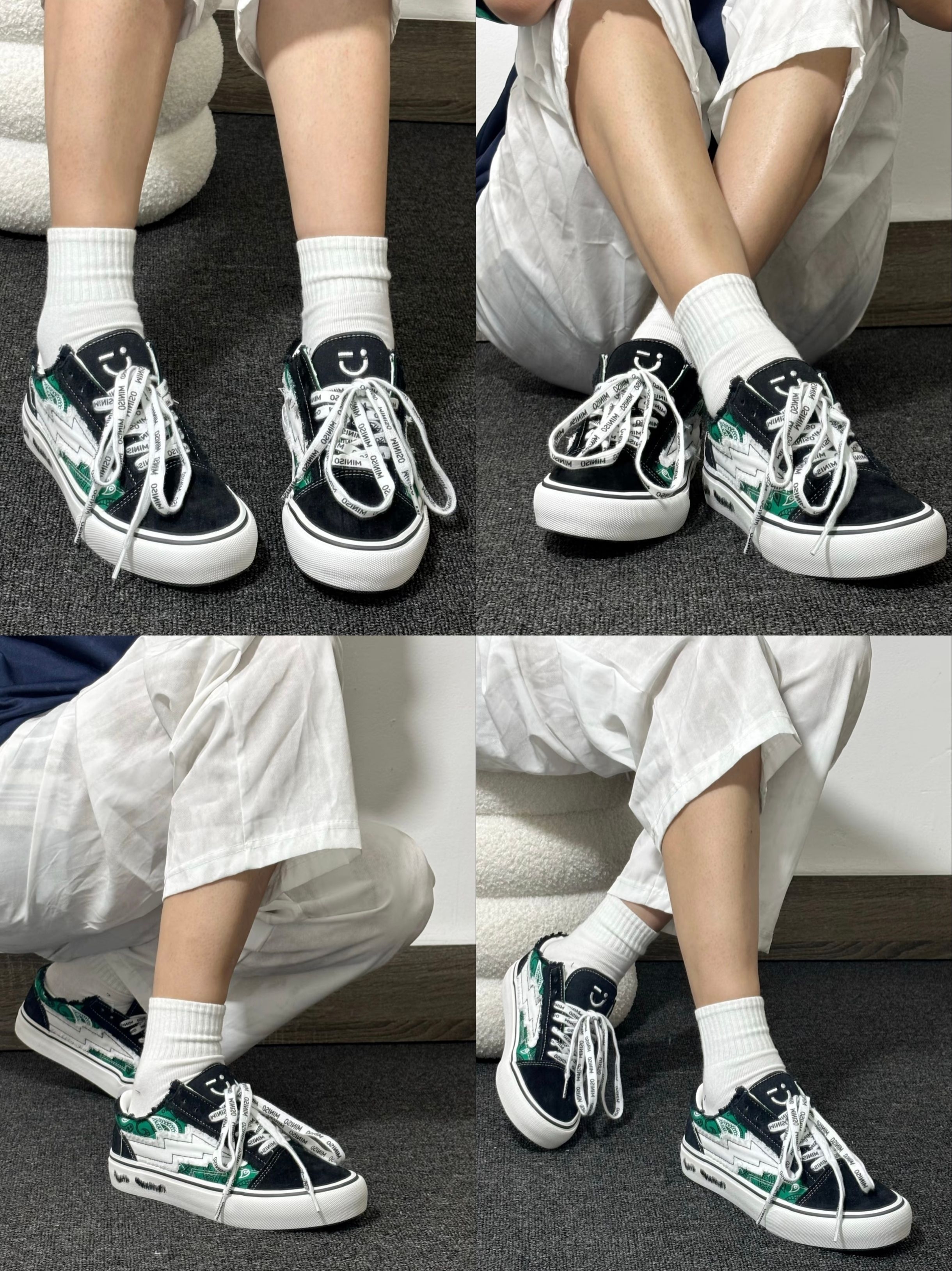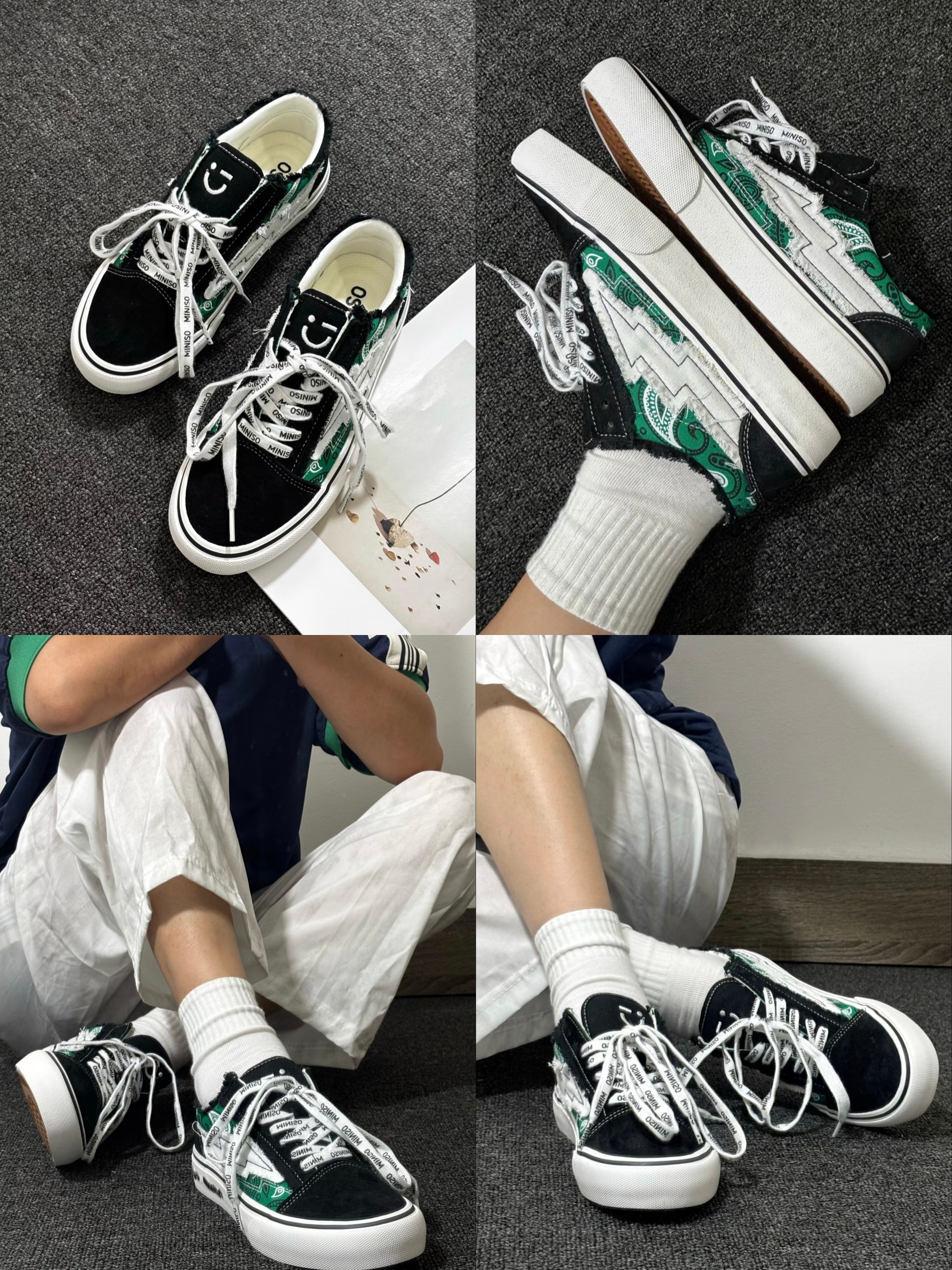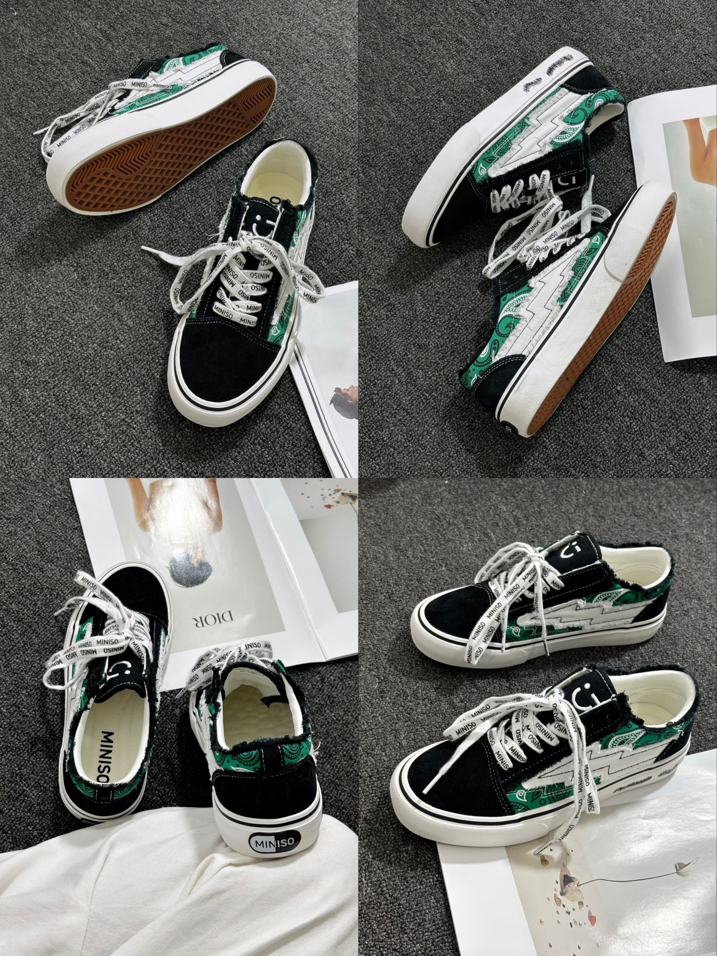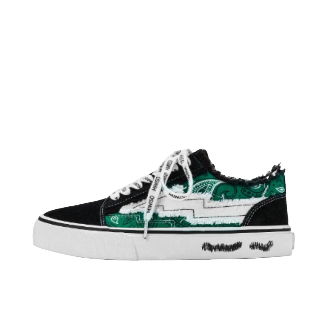 最近想找一双能应付日常走路、又有点设计感的板鞋,在店里看到MINISO这双就试了试。侧面那道黑绿拼接的闪电条纹是它最特别的地方,搭配满印LOGO的织带鞋带,经典板鞋的版型里加了点街头小巧思。 上脚体验:我按平时运动鞋的尺码选的,穿上刚好。鞋子不重,帆布鞋面比较挺括,不会软塌塌的。鞋垫有一定弹性,走起路来能感觉到缓冲,逛了半天街脚底不会酸。最让我满意的是它的橡胶底,纹路比较深,下雨天走过湿滑的人行...