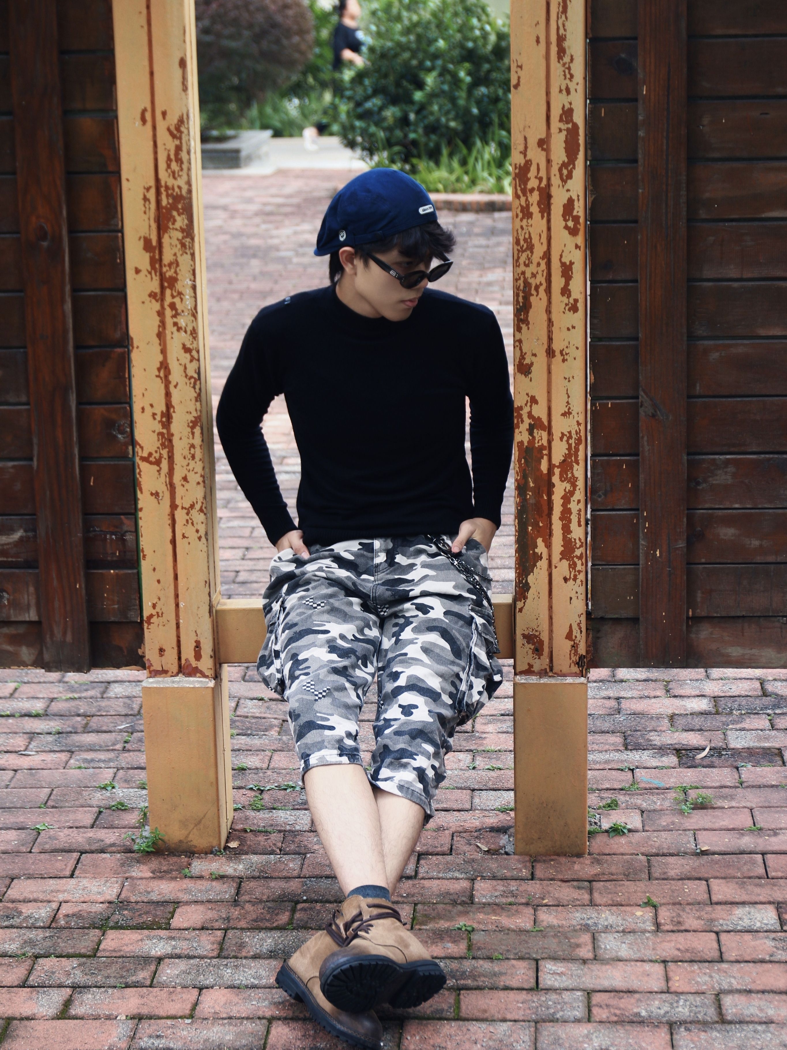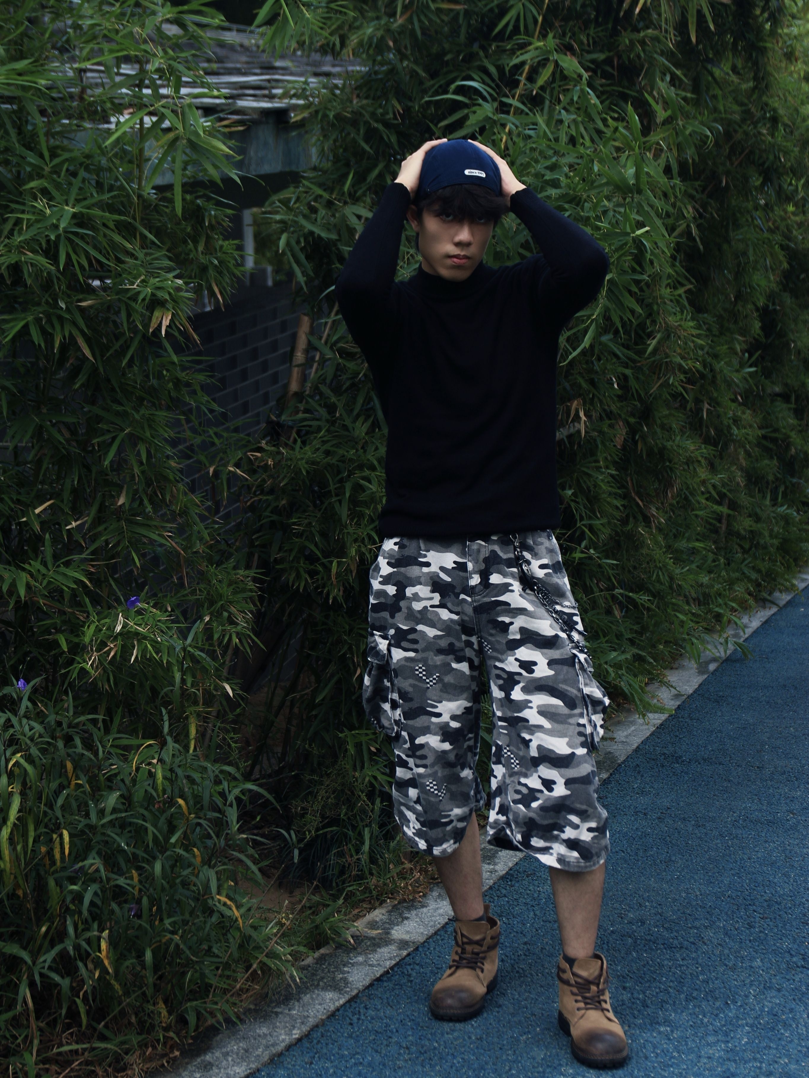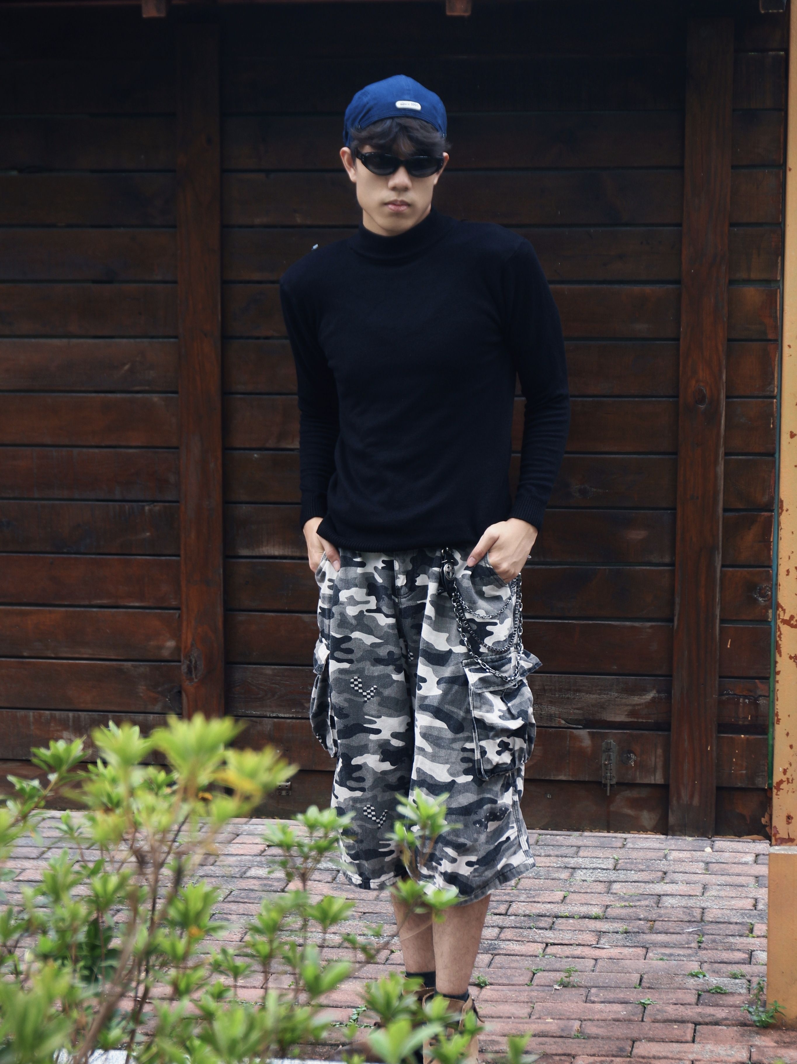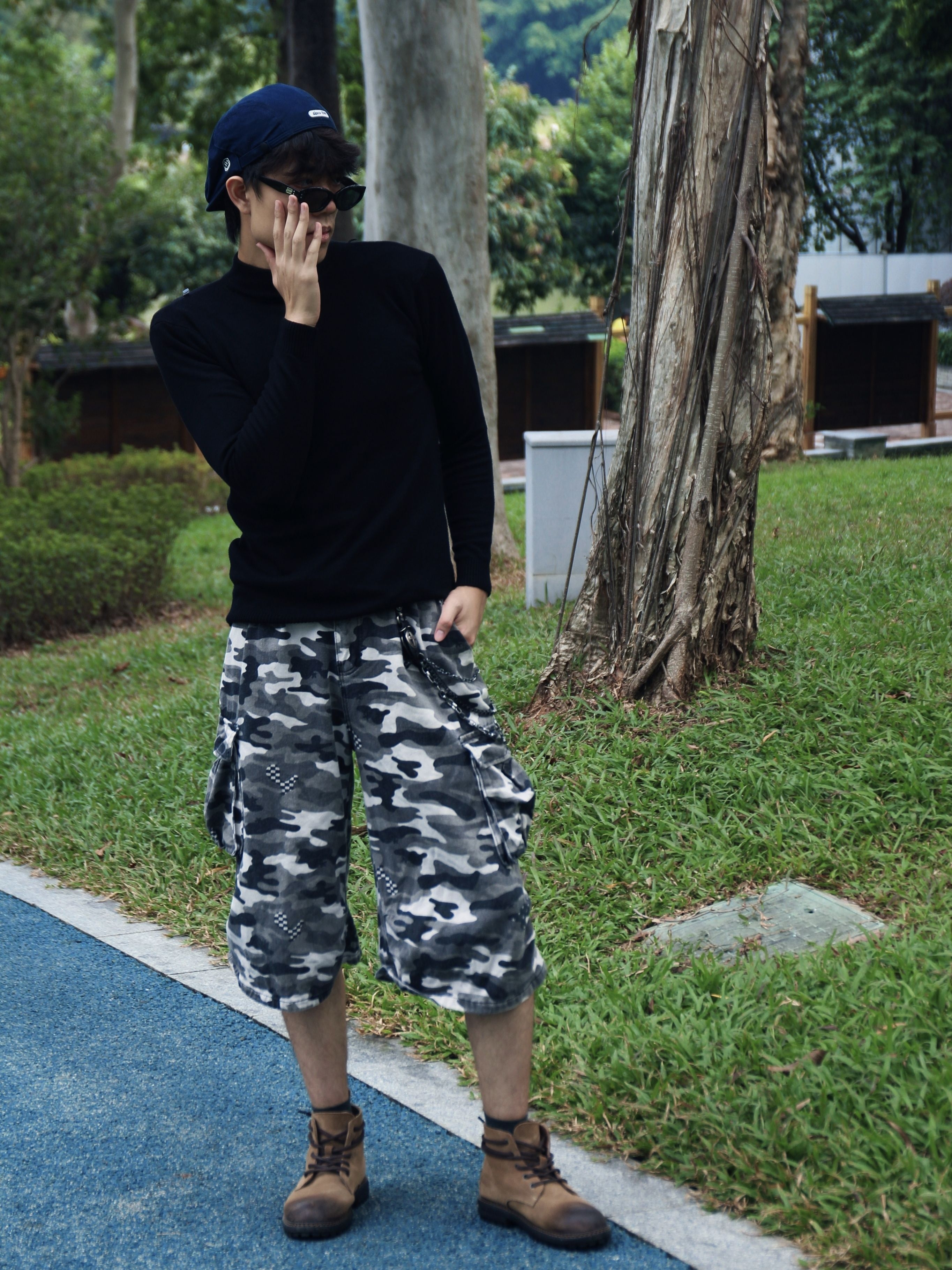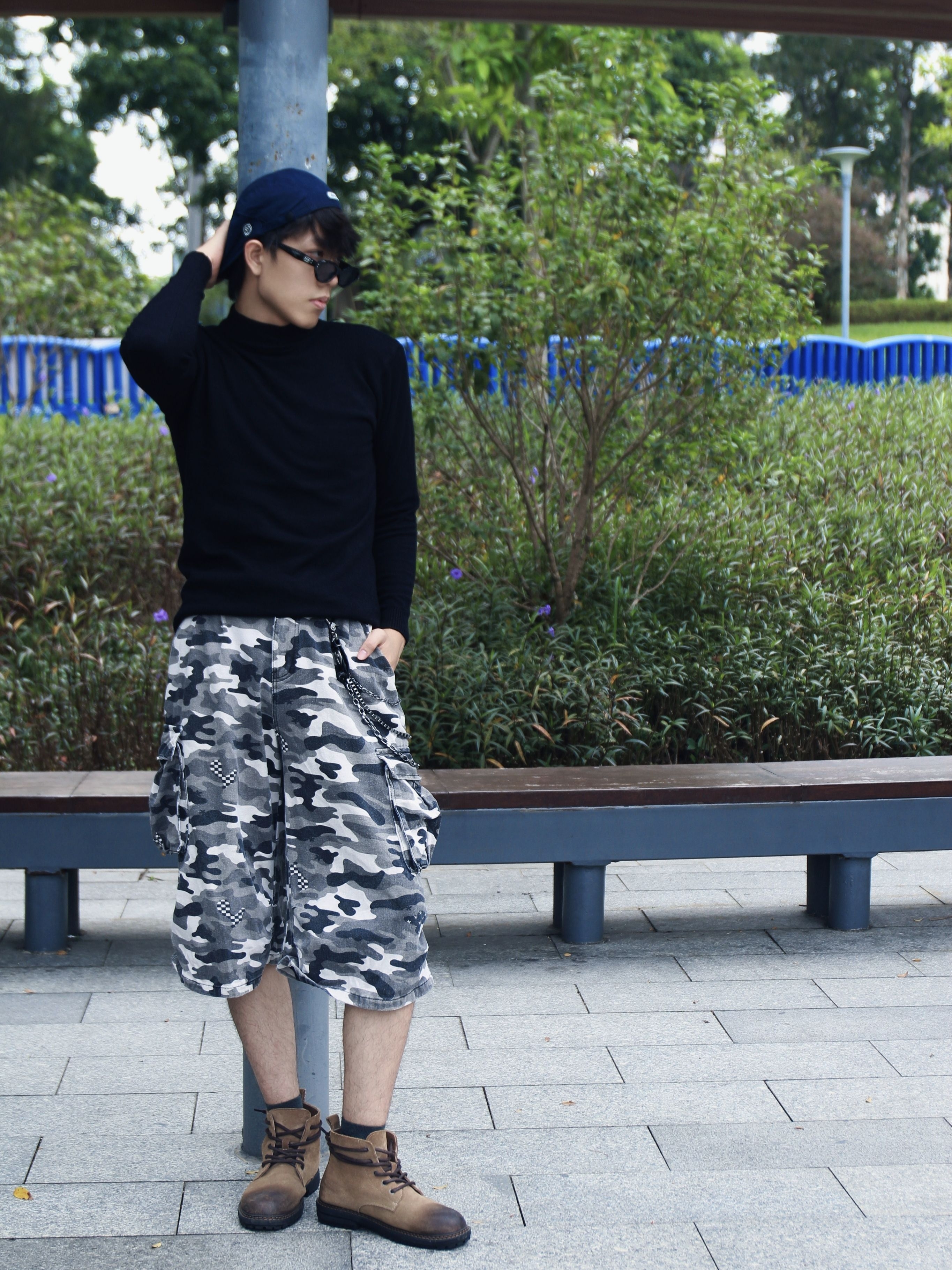 今天这套穿搭通过黑色高领衫,搭配迷彩工装七分裤与金属链饰,再衬蓝色棒球帽产生颜色碰撞💥💥 使得风格在休闲与街头潮酷间切换🥰🥰🥰 即随性又不失个性,即突出又不显得过于张扬😎😎😎 简直是是复古工装风的清爽演绎,怎么样,这套简单街头穿搭你get了吗😍😍😍
