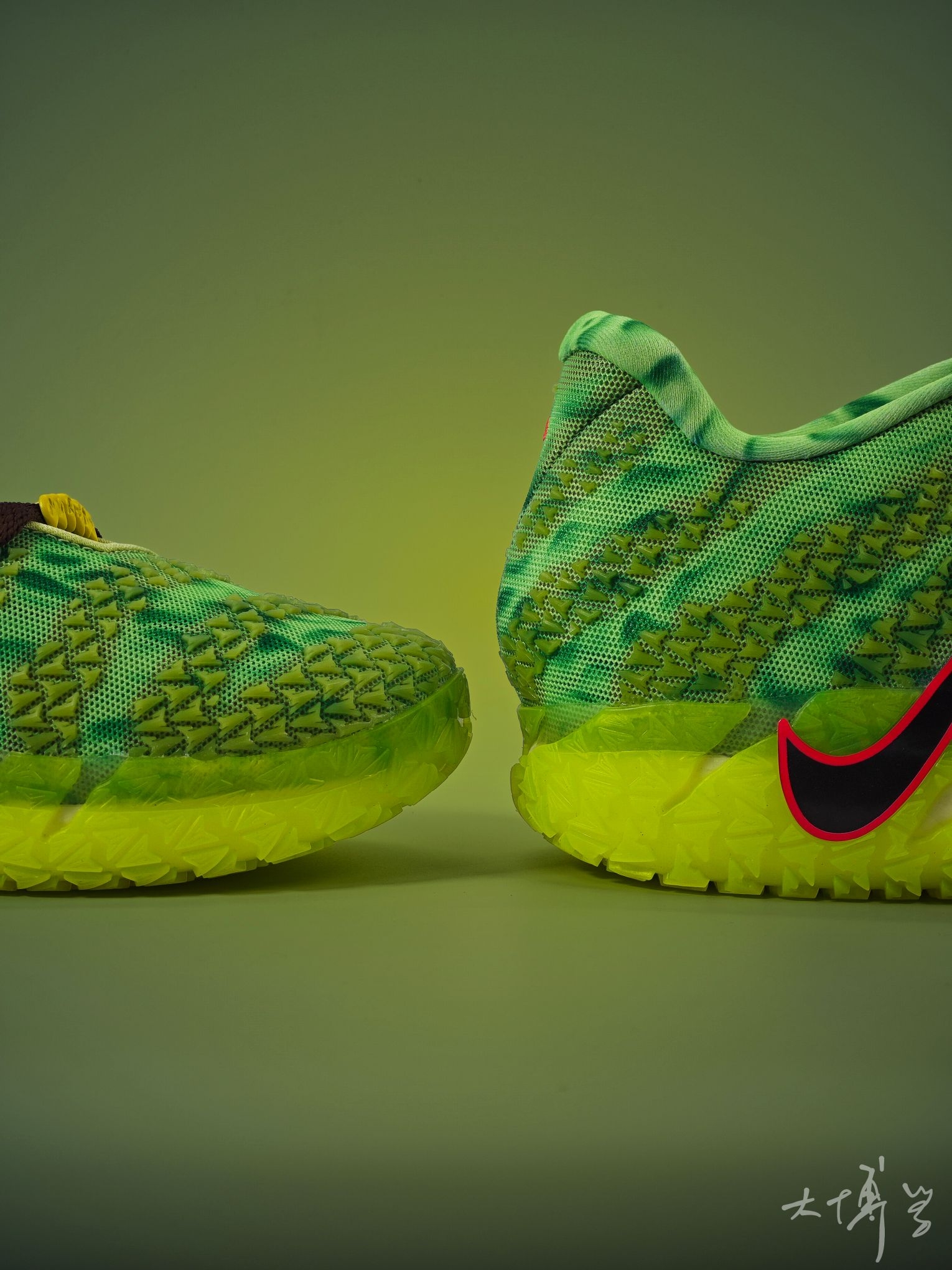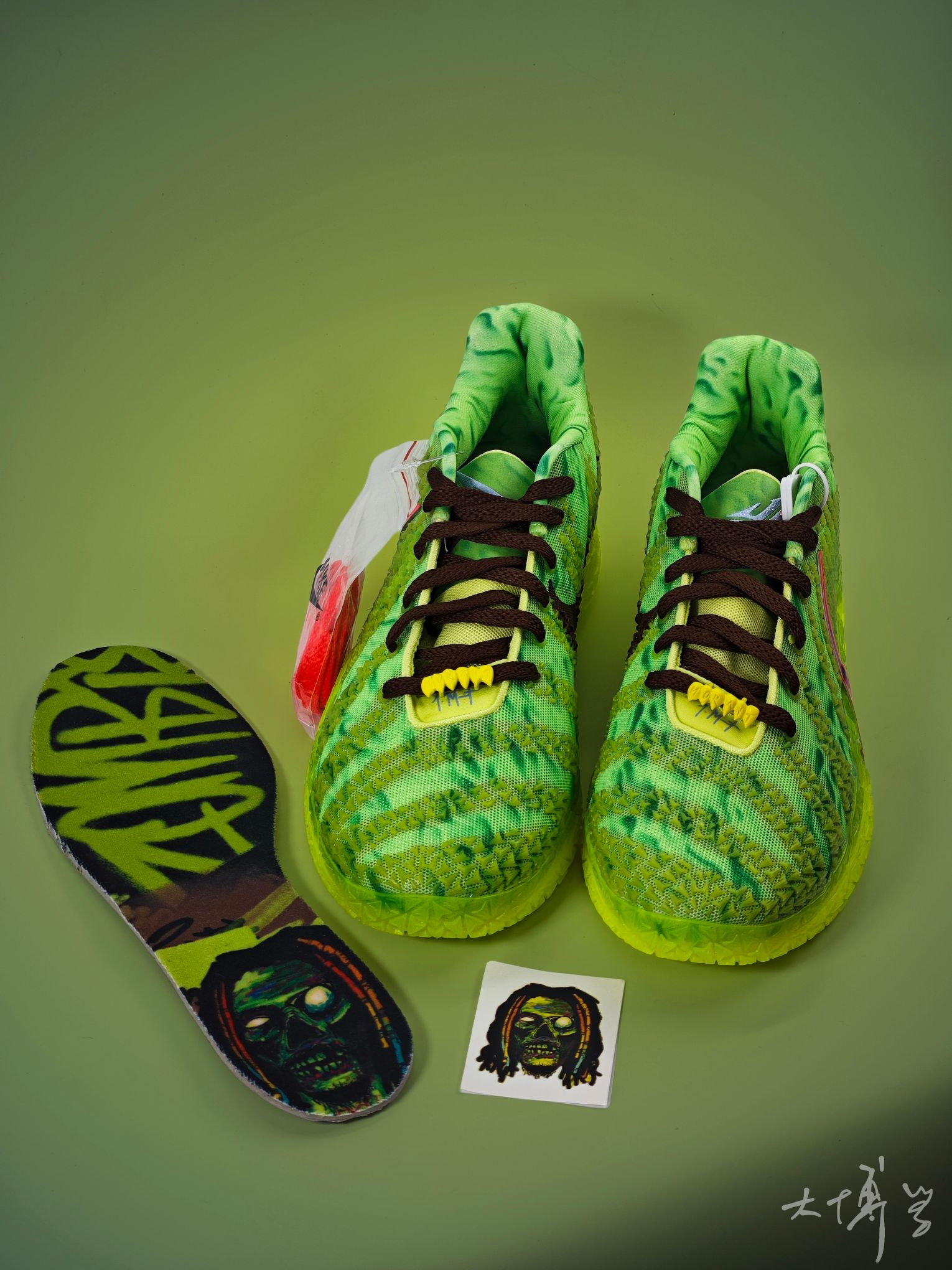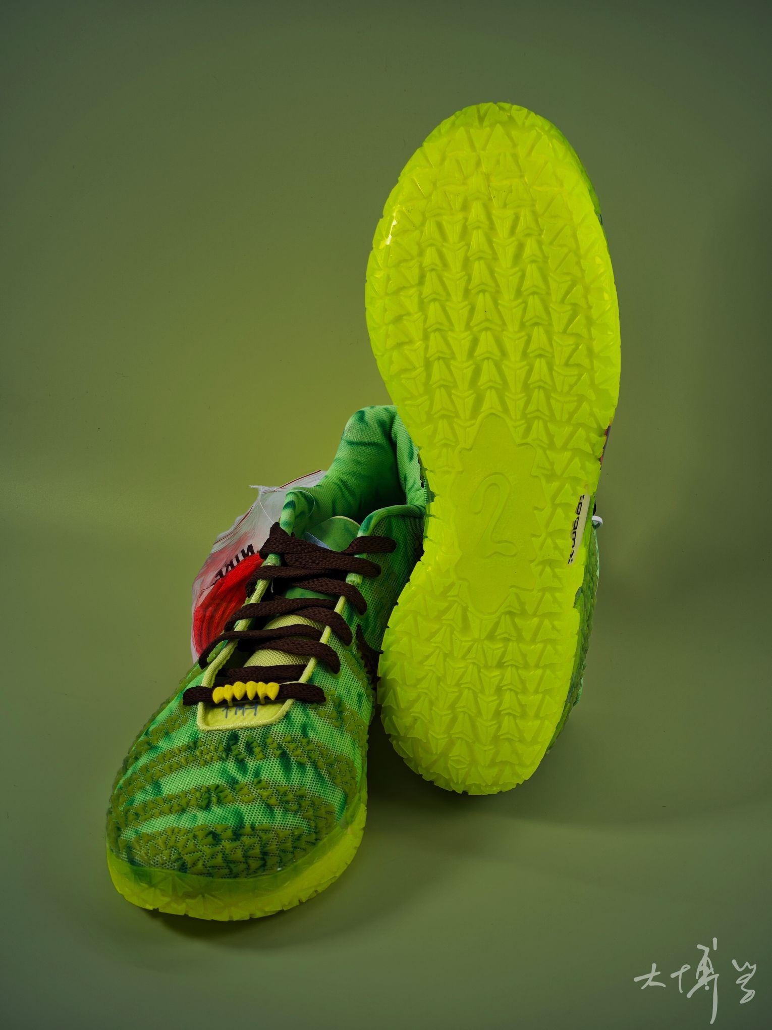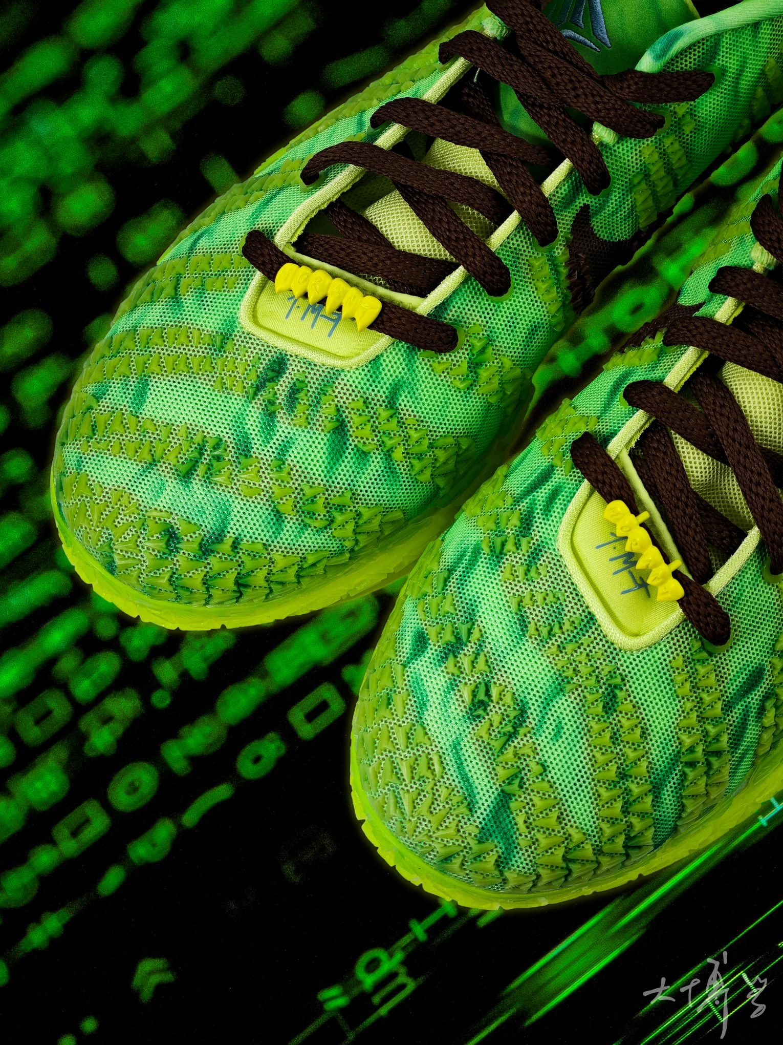 一双莫兰特三代签名鞋 我觉得是颜值与实战兼顾的潮流实战鞋 亮点集中在外观设计和ZoomX中底科技 同时也确实存在实战细节短板 荧光绿+黏液绿渐变的鳞纹鞋面 搭配红边黑Swoosh形似爪痕 獠牙鞋带扣,鞋垫还印有僵尸化莫兰特肖像 外底、鞋面骨骼纹理带夜光材质 暗处呈现幽绿荧光,这点我非常喜欢 鞋楦偏瘦,窄脚适配度高 宽脚建议选大半码 单看颜值的话,我还是很喜欢这双ja3的