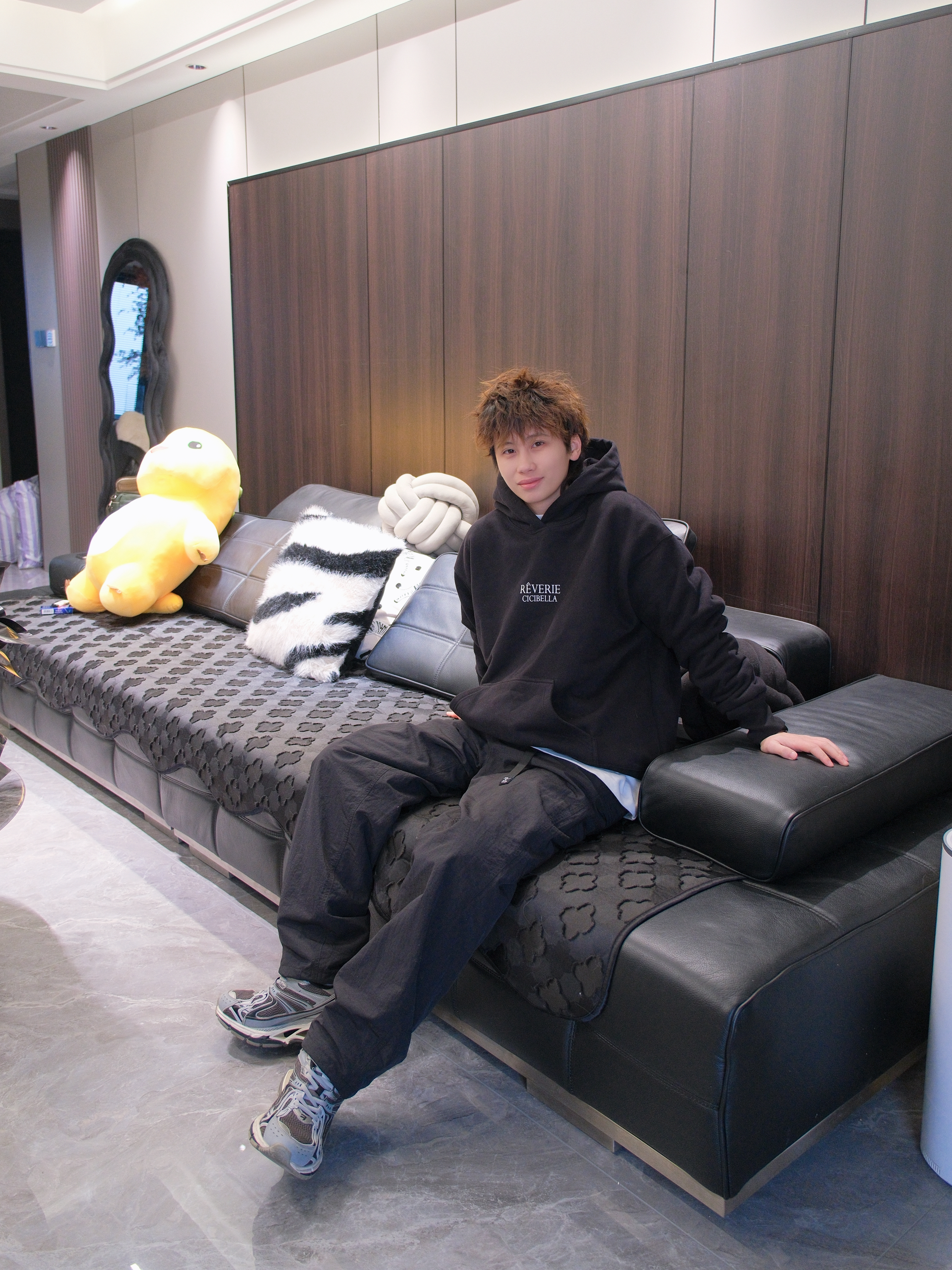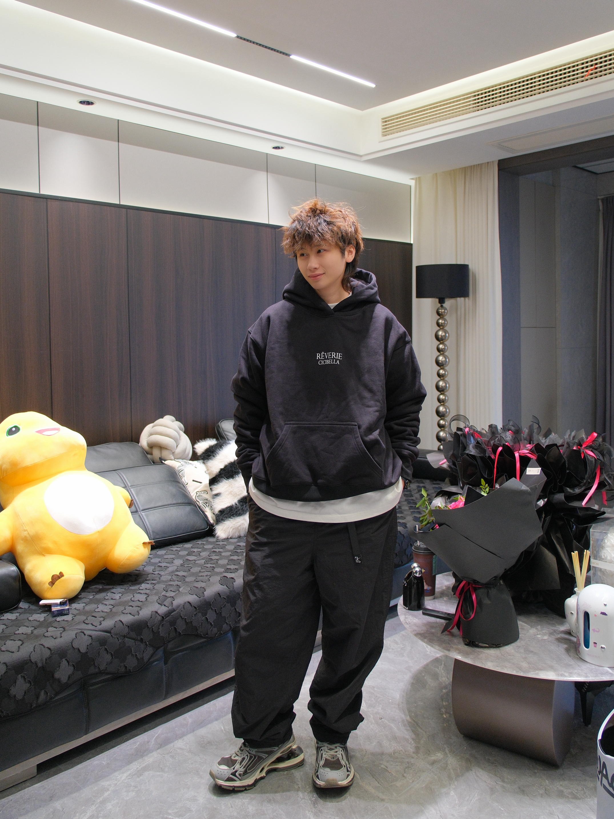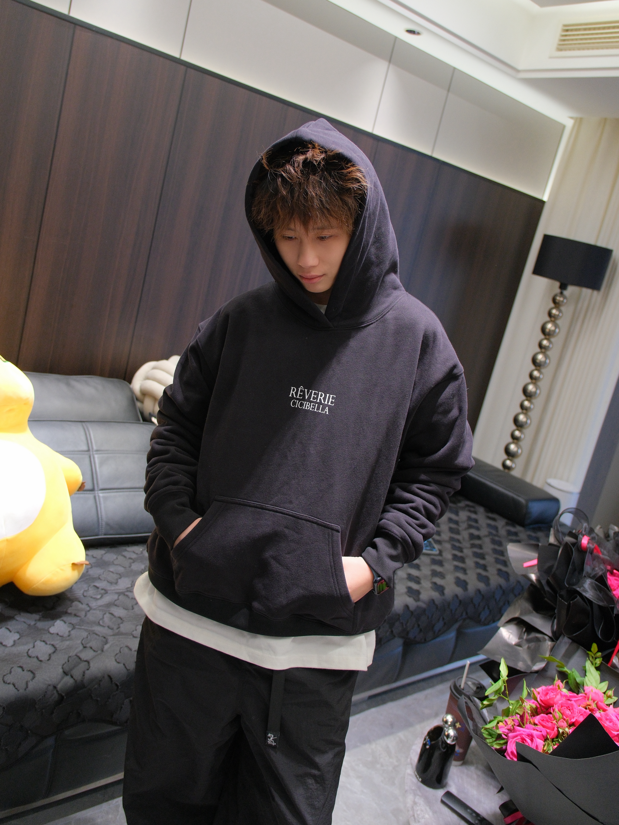 搞笑男突然营业,有一说一新发色太适合他了 今天来一套他的同款allBlack风格穿搭 黑色连帽卫衣搭配黑色运动裤和老爹鞋 胸口字母logo图案 给人一种简单干净的少年感 内里加绒设计也比较保暖 我这里叠穿了件白T,增加下层次感 尺码参考:163cm/46kg 上身S码