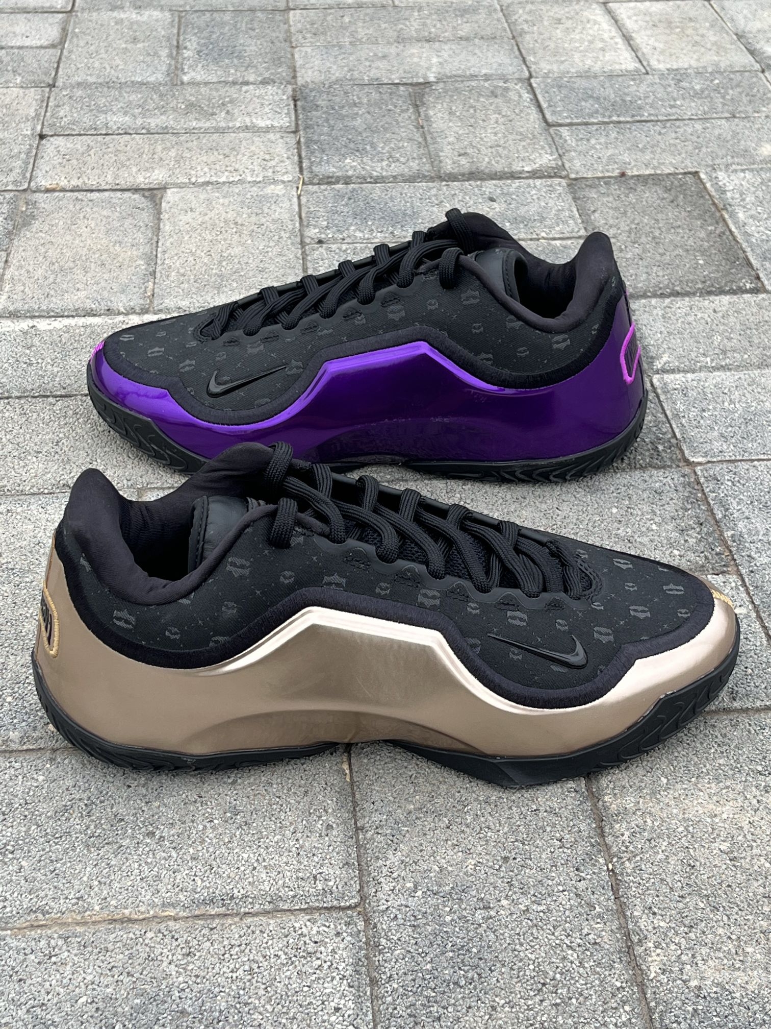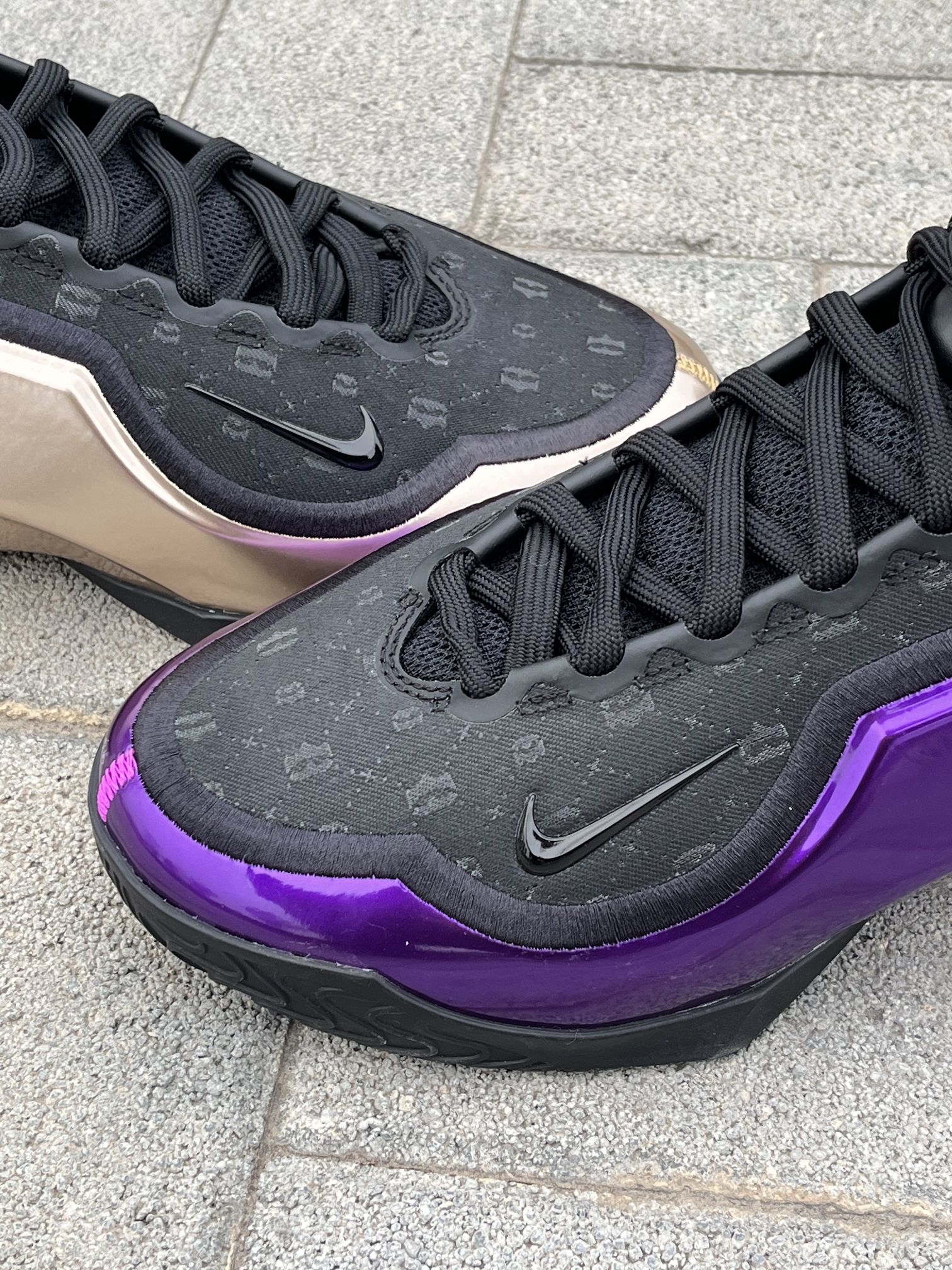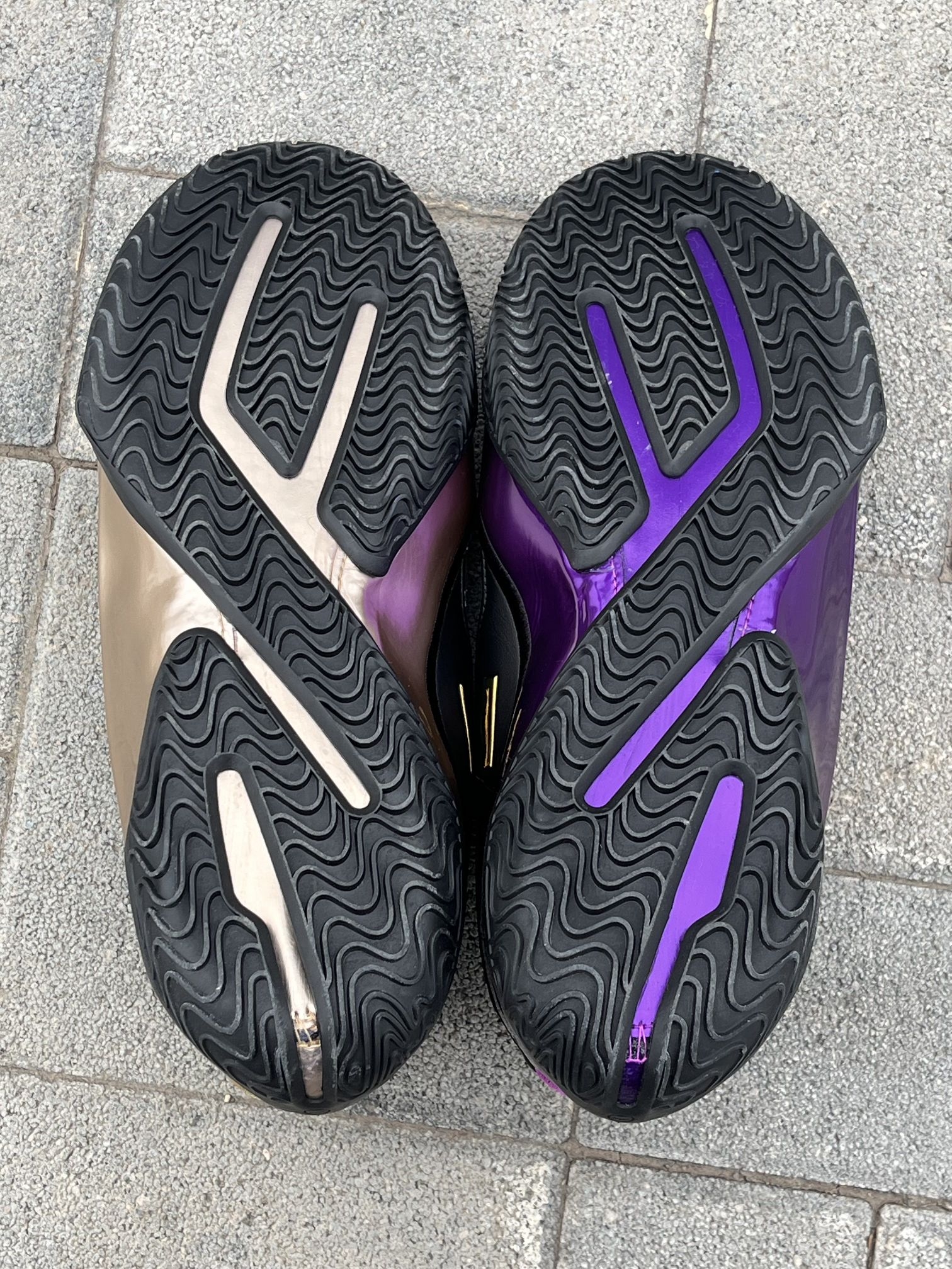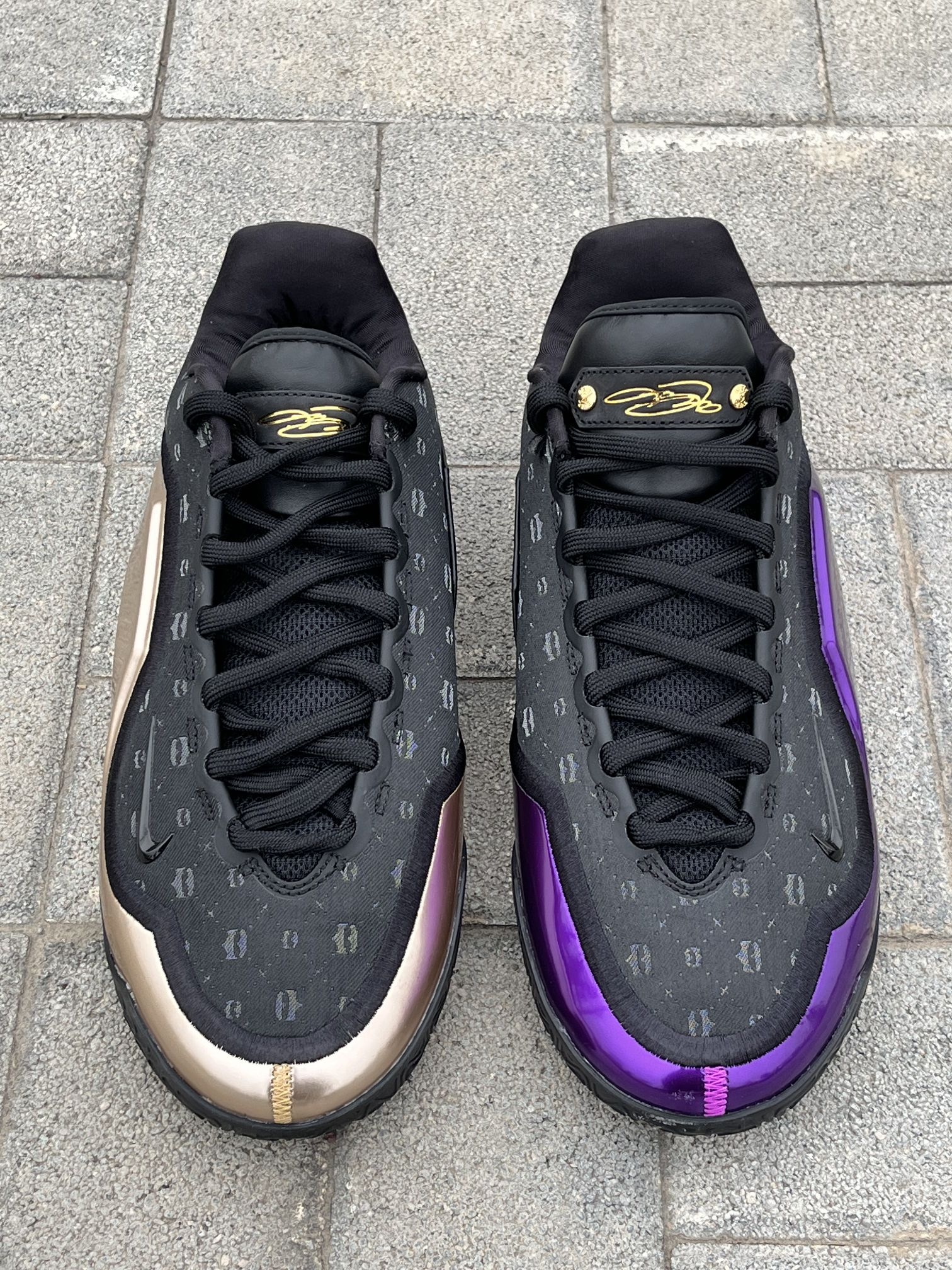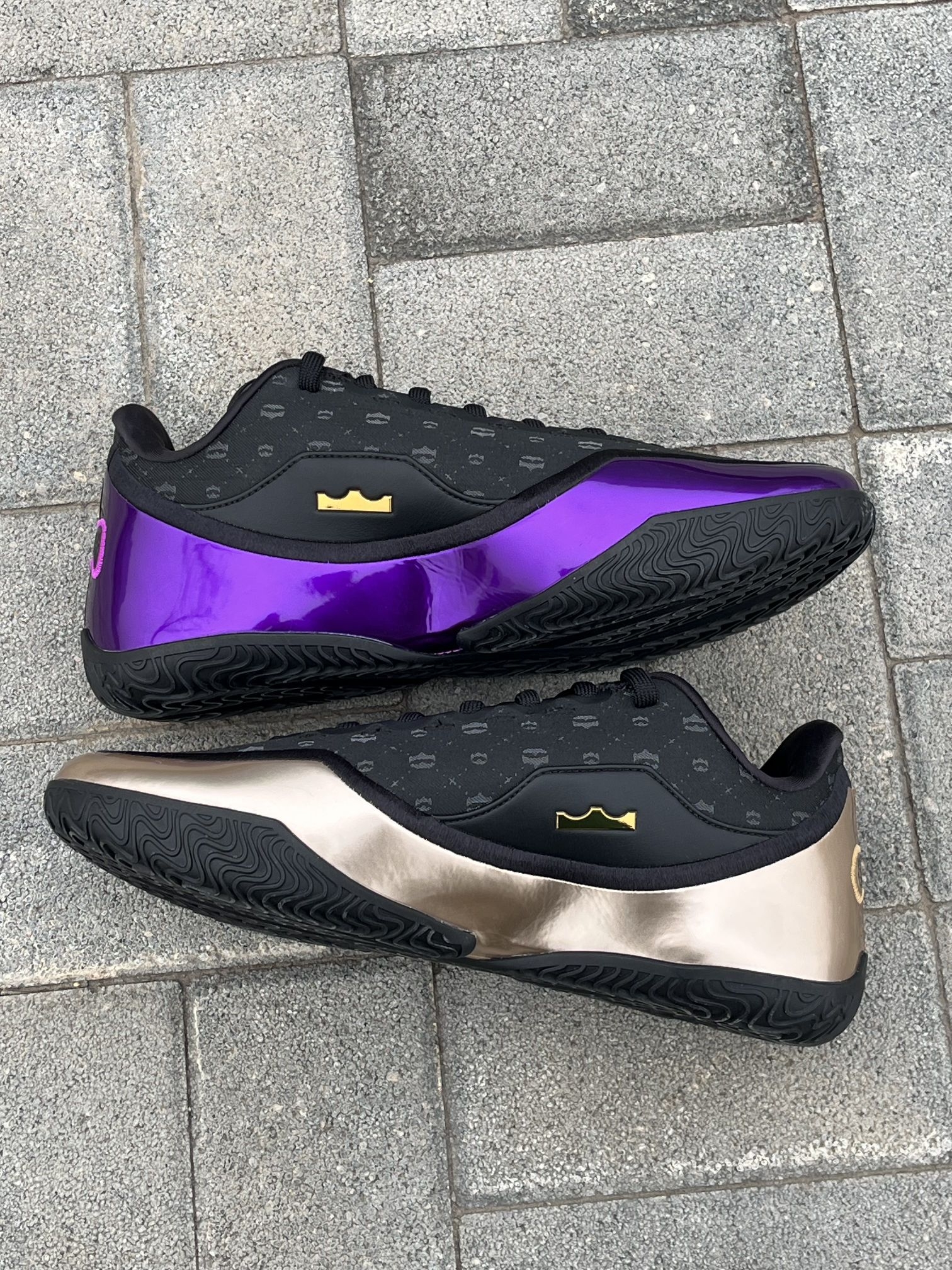 给兄弟们分享一双詹姆斯“父子局”鸳鸯篮球鞋。 这双鞋的以黑色为主,紫金的鸳鸯配色看起来非常有特色,鞋面上的烫印图案摸起来手感很不错,这双鞋子整体的颜值特别高。 鞋子采用皇冠👑的造型,看起来非常霸气。我42的脚这双鞋我穿42码,大家按照自己平时穿的尺码选择就可以。