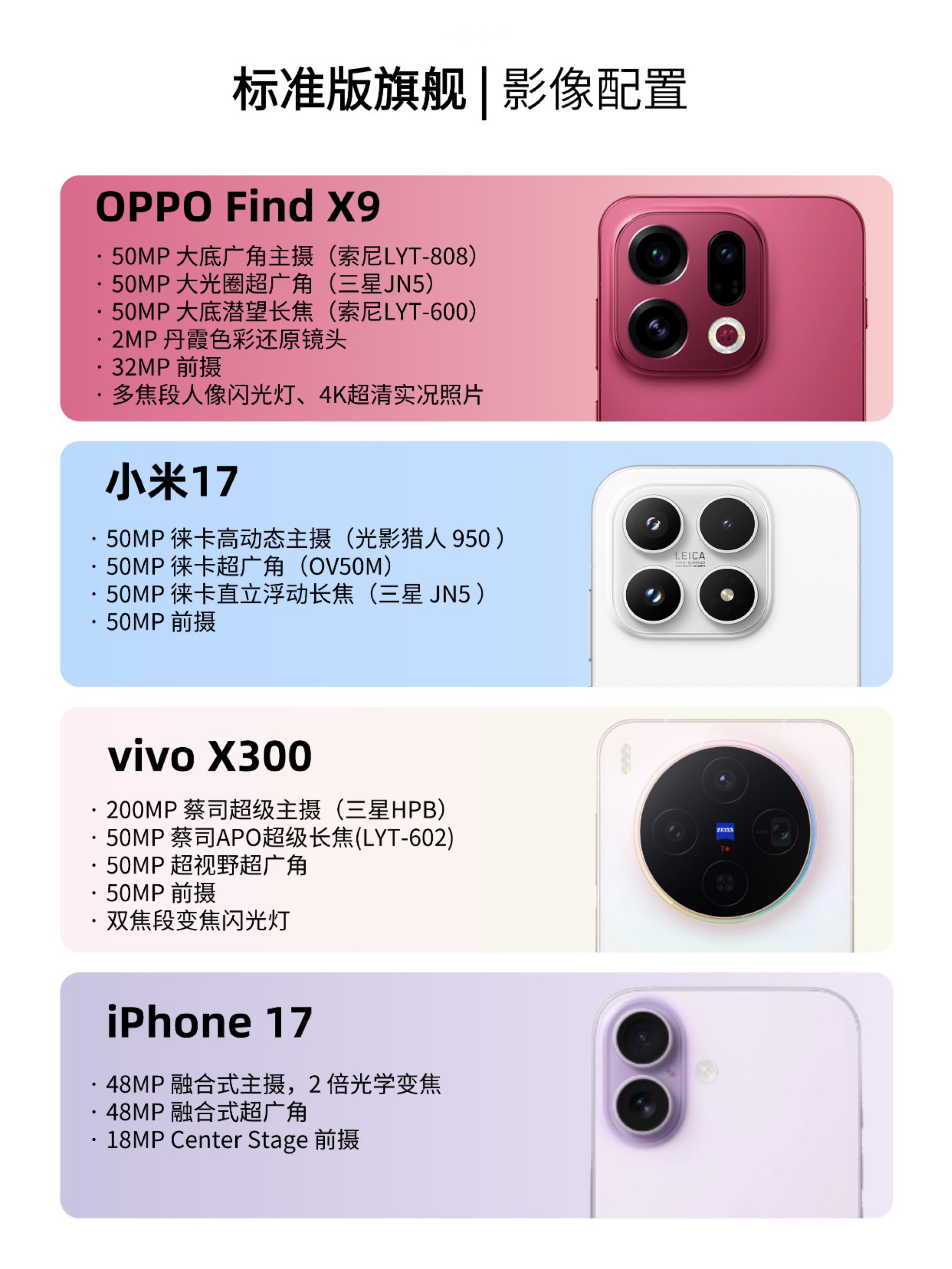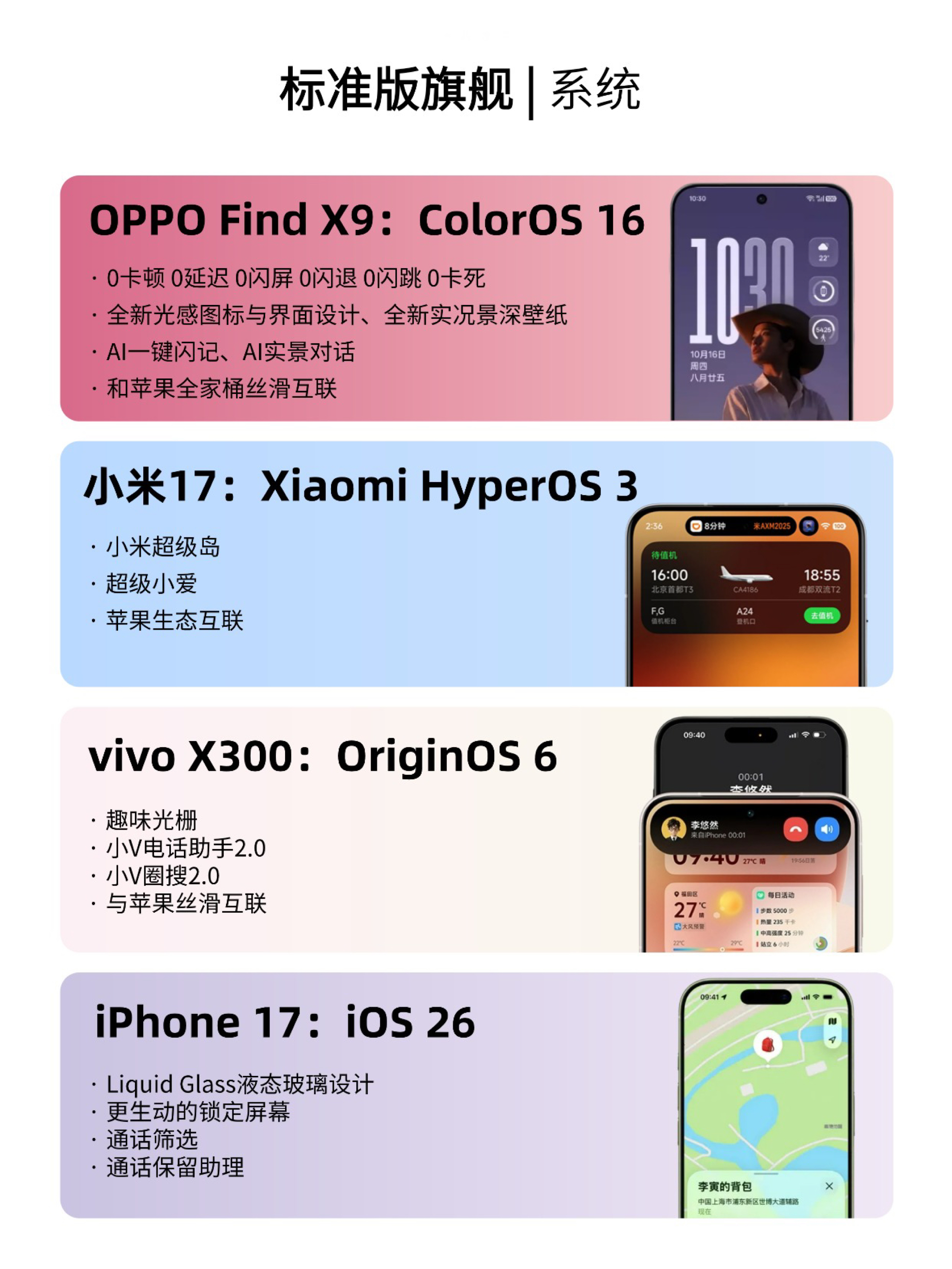 最近,OPPO、小米、vivo、苹果等各大厂商都拿出了看家本领,推出了新机,2025年下半年标准版旗舰到底该怎么选? 纠结党快看这篇攻略,帮你挑出最适合的手机。 1️⃣OPPO Find X9 搭载了哈苏超清四摄系统,把上一代Ultra的丹霞色彩还原镜头下放到了X9标准版上,能精准还原肤色、景色的真实色彩。4K实况图直出,每一帧都超清晰,可以当壁纸的程度。能拍哈苏8K照片,裁剪后也清晰,妥妥的...