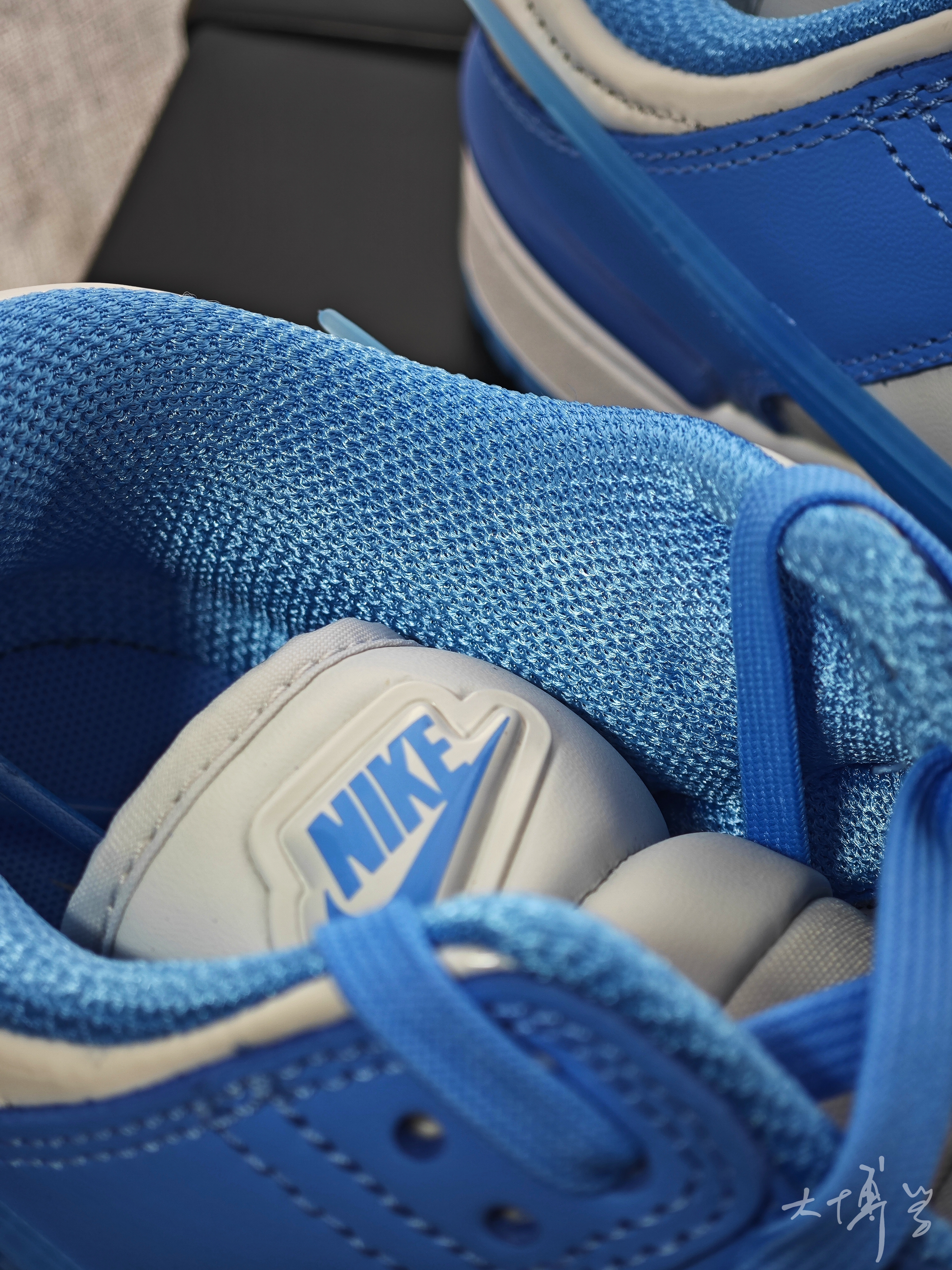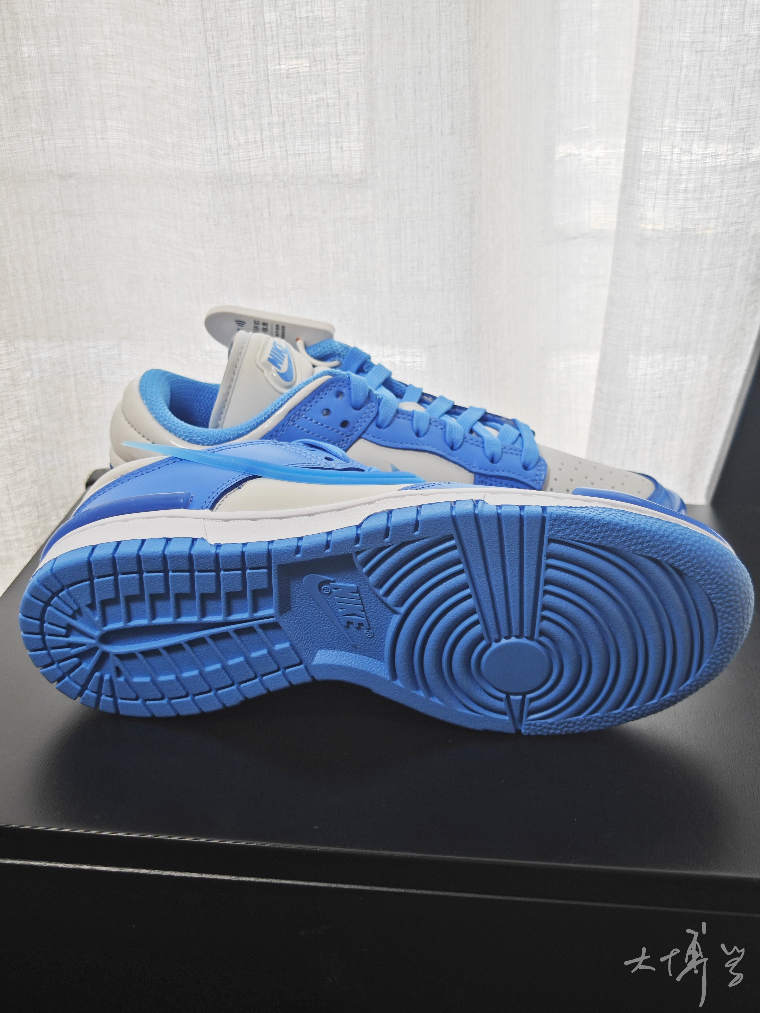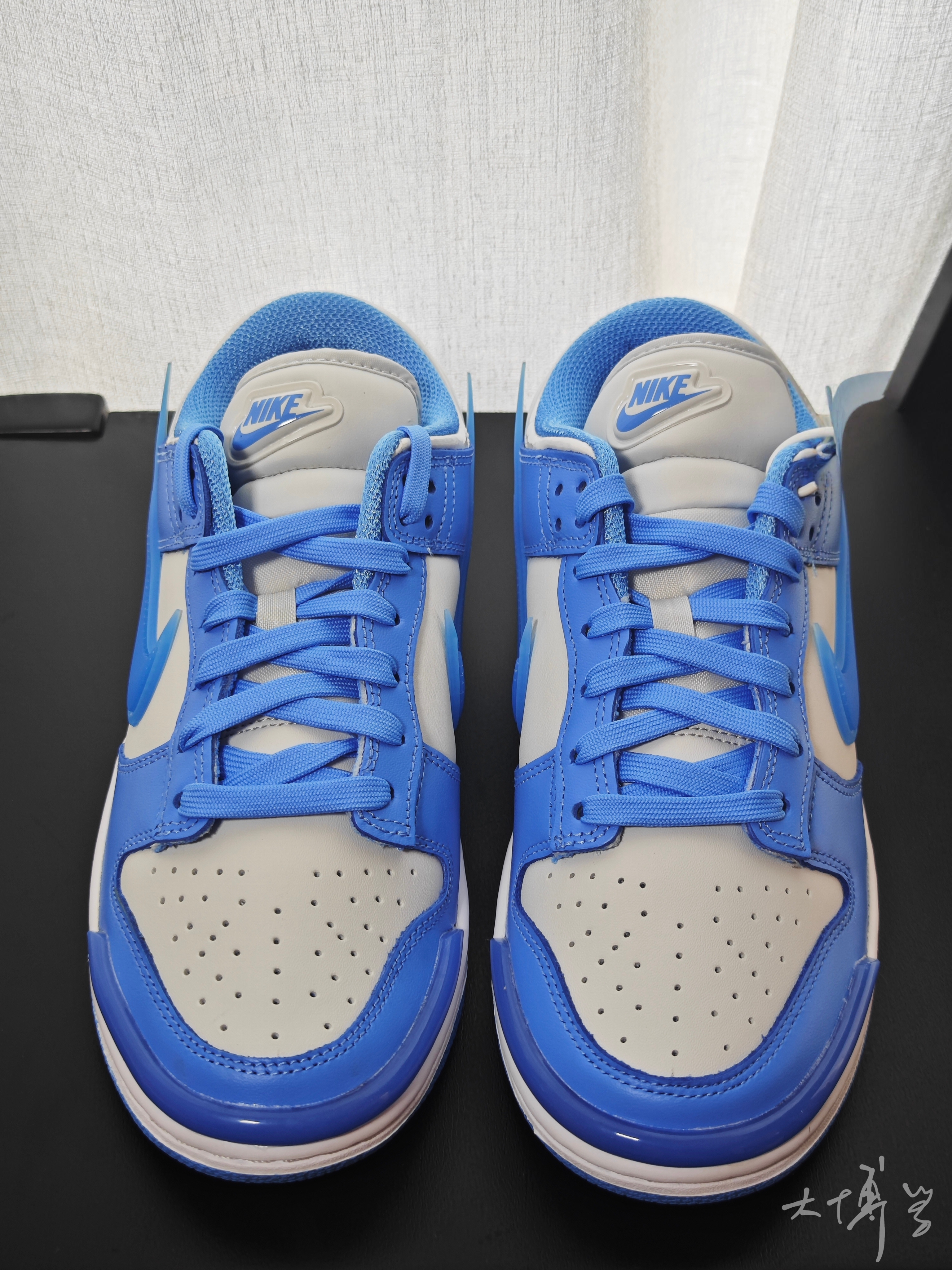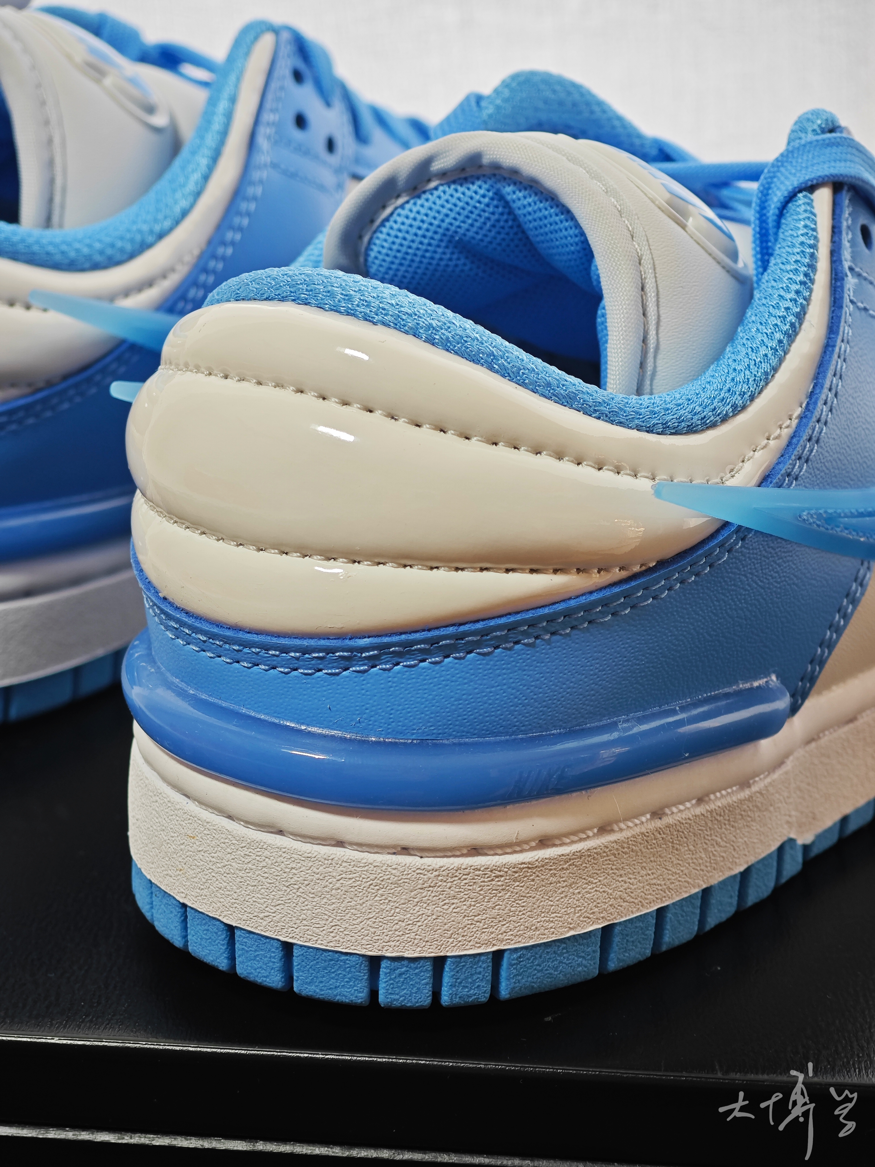 一款白蓝配色的dunk low 仔细看和平时的dunk有点不一样 鞋跟不仅像气球一样鼓了起来 前后增加了软胶材质的“保险杠” 就连侧面swoosh也长出来一截 这是dunk的衍生鞋型,twist 鞋身小细节之丰富可以媲美联名款