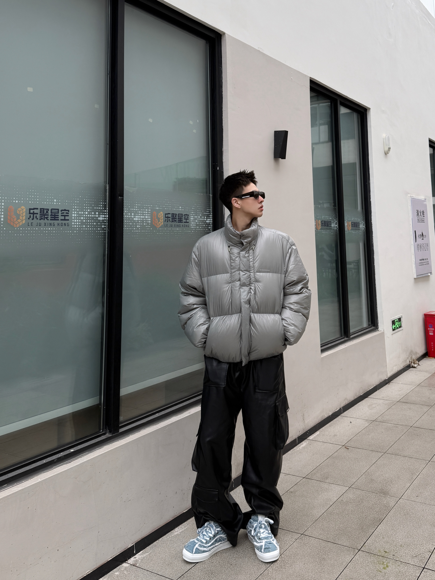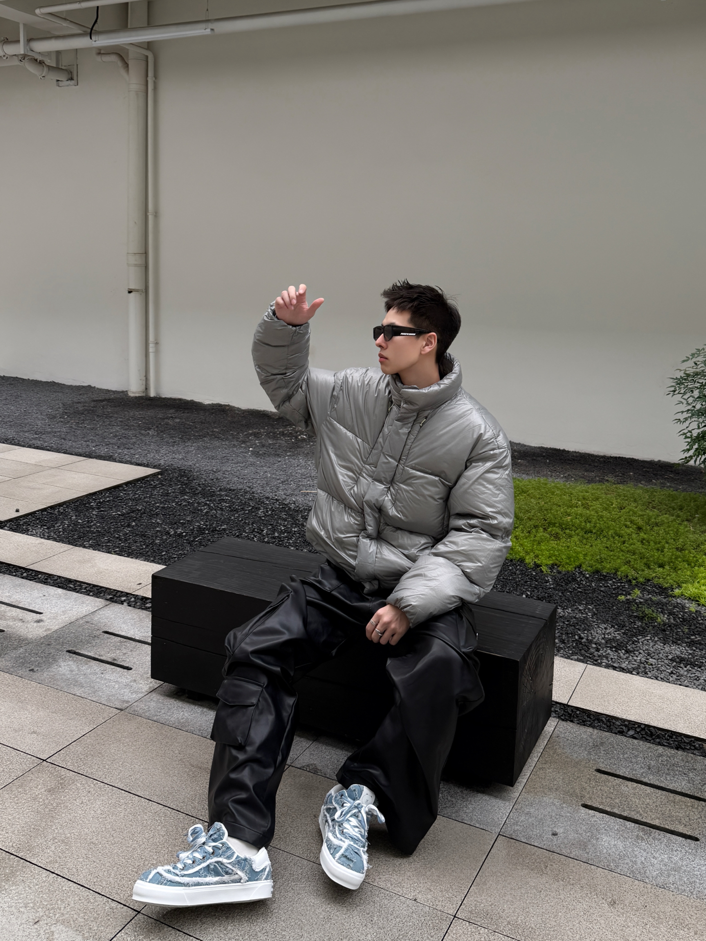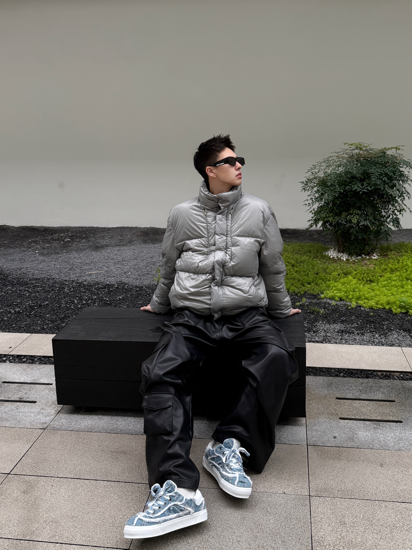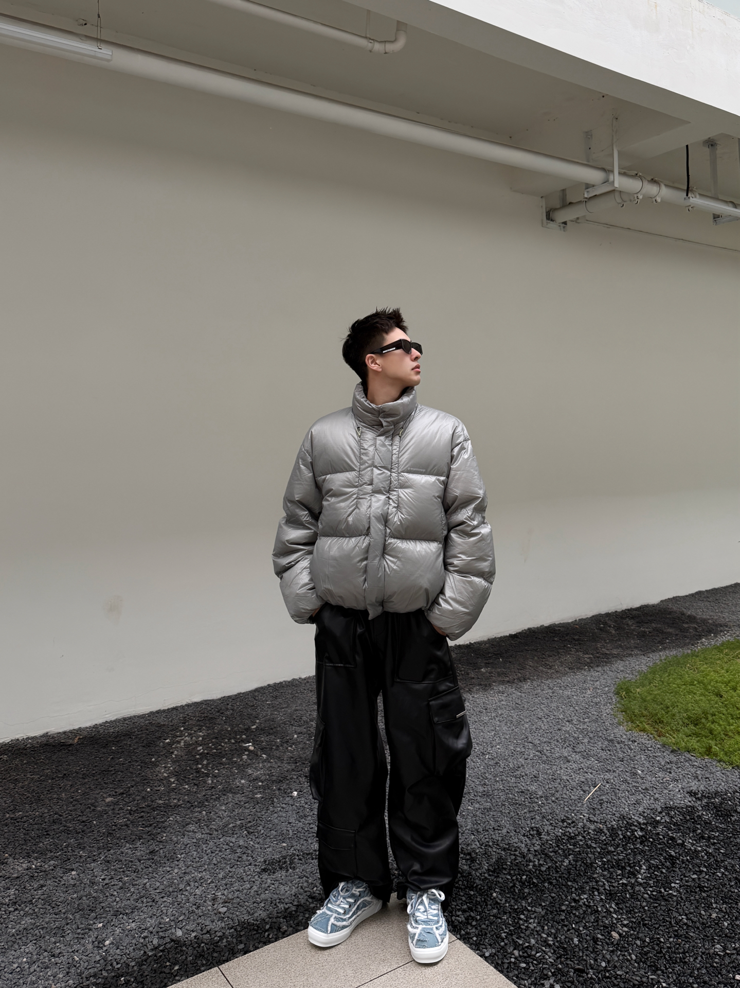 银面羽绒服撞上Line Friends毛边板鞋,冷感与软萌的反差感绝了 银灰色亮面羽绒服自带未来感的冷调气场,利落的立领短款剪裁还能拉高腰线;下搭黑皮裤延续酷感,却被一双Line Friends毛边牛仔板鞋打破沉闷——毛边做旧的牛仔鞋面揉着软萌的卡通细节,蓝白调调在全黑银的搭配里戳出一抹清新,冷硬的工业风穿搭瞬间多了份反差萌。 这种“硬核外壳+软萌内里”的搭配巧思,把街头酷感和童趣细节捏得刚刚...